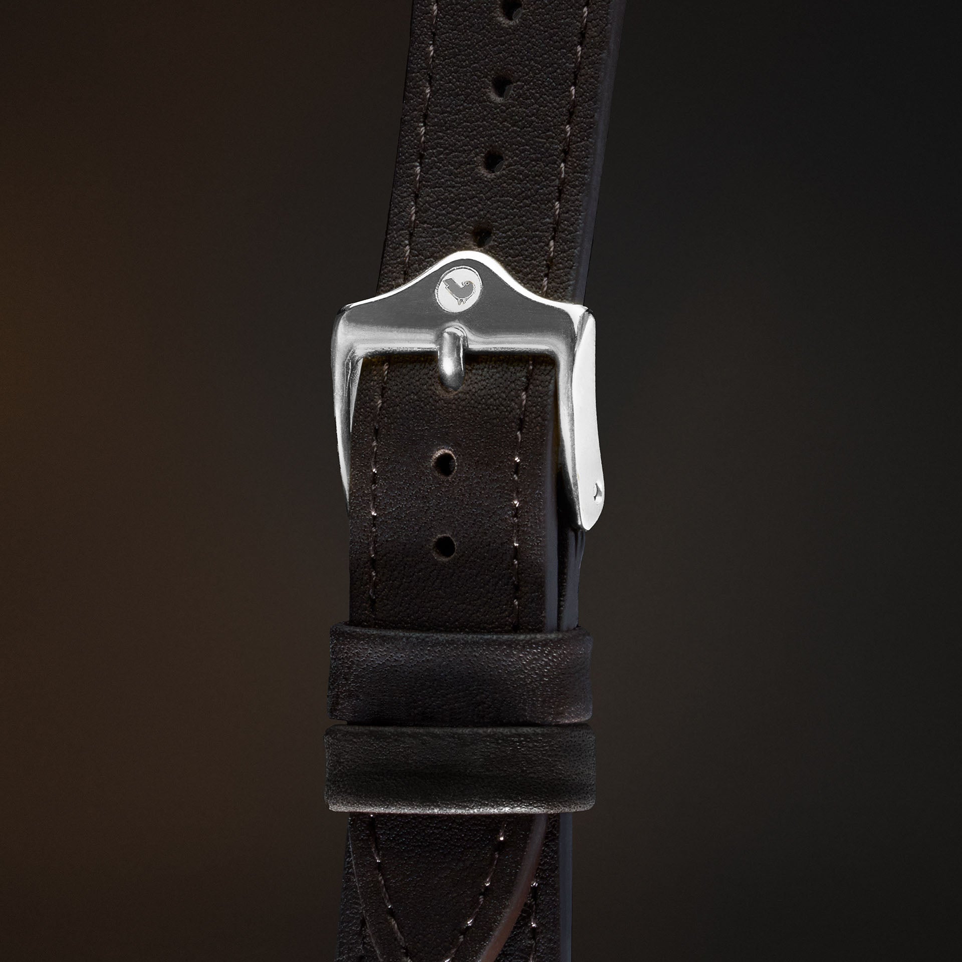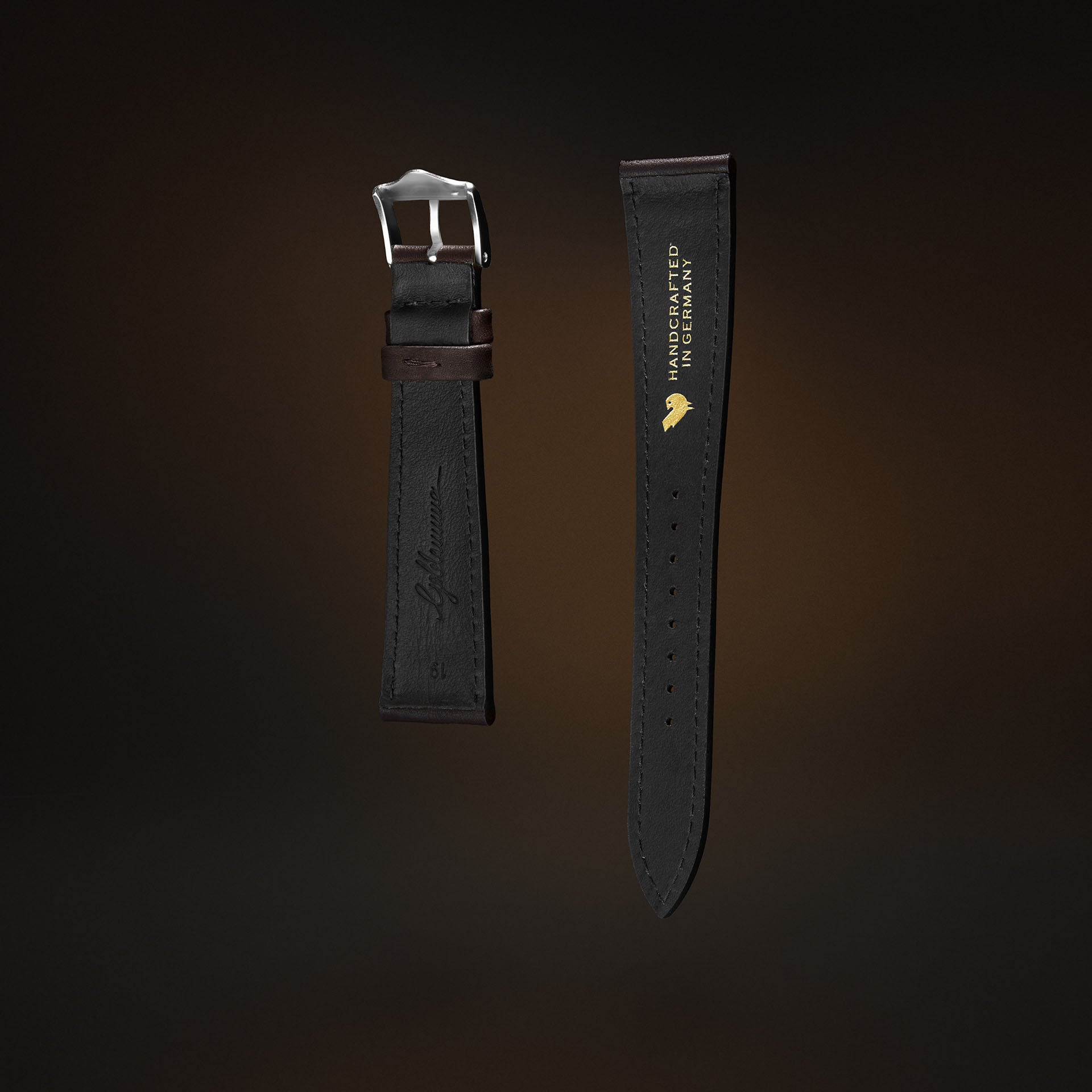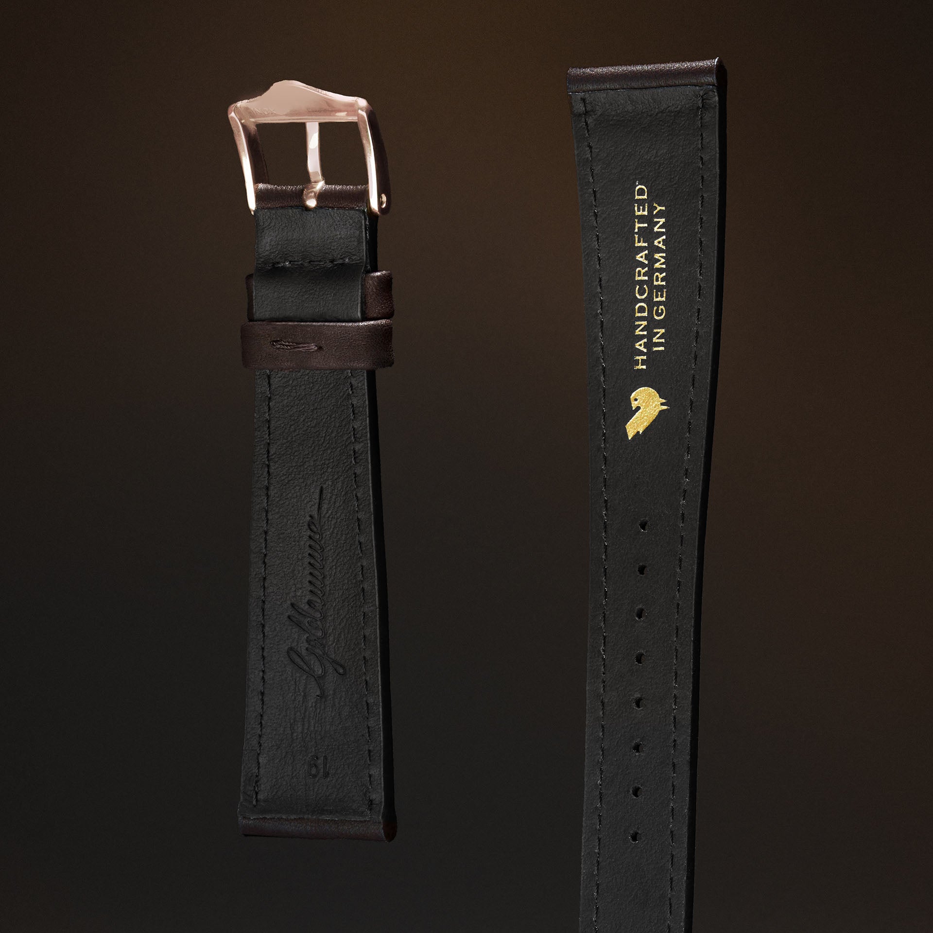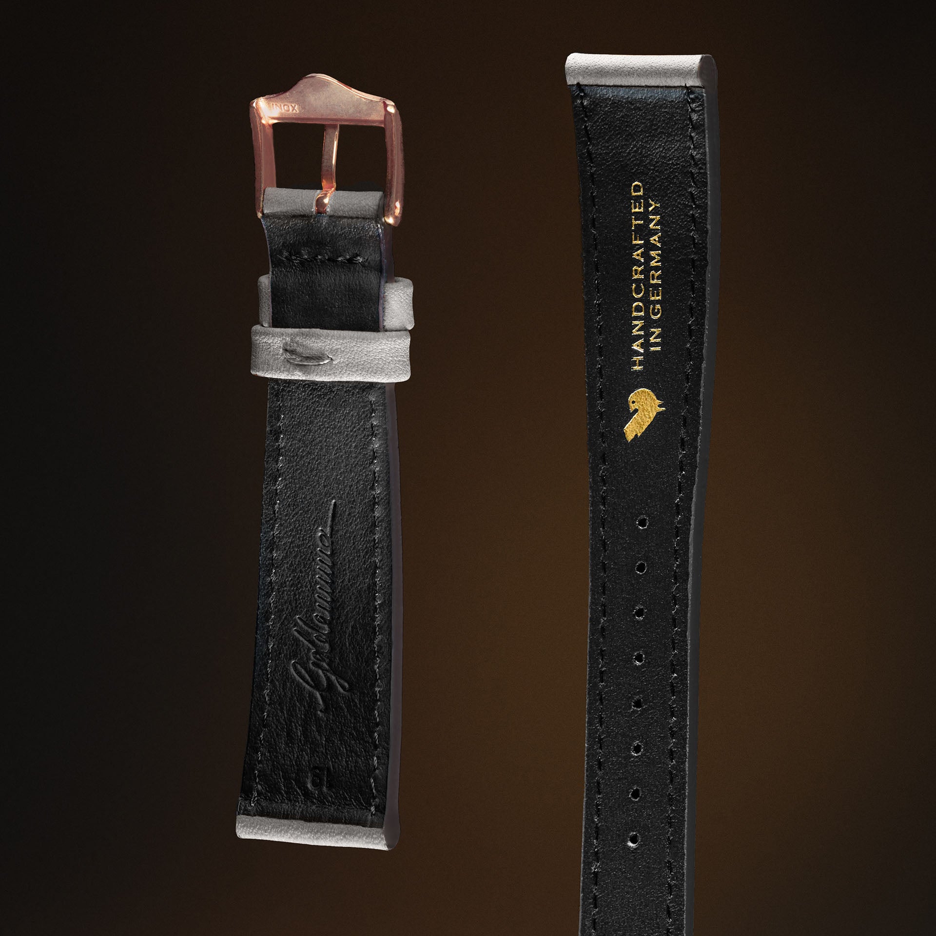 مصنوع من جلد العجل الألماني الرقيق مقاس 2 مم، وهو Kardinal ناعم للغاية ويحتضن معصمك منذ اليوم الأول. ويُعد الشكل المدبب الفريد من نوعه مكملاً حصيفاً ومكملاً لإطار الساعة الكلاسيكية الكلاسيكية.