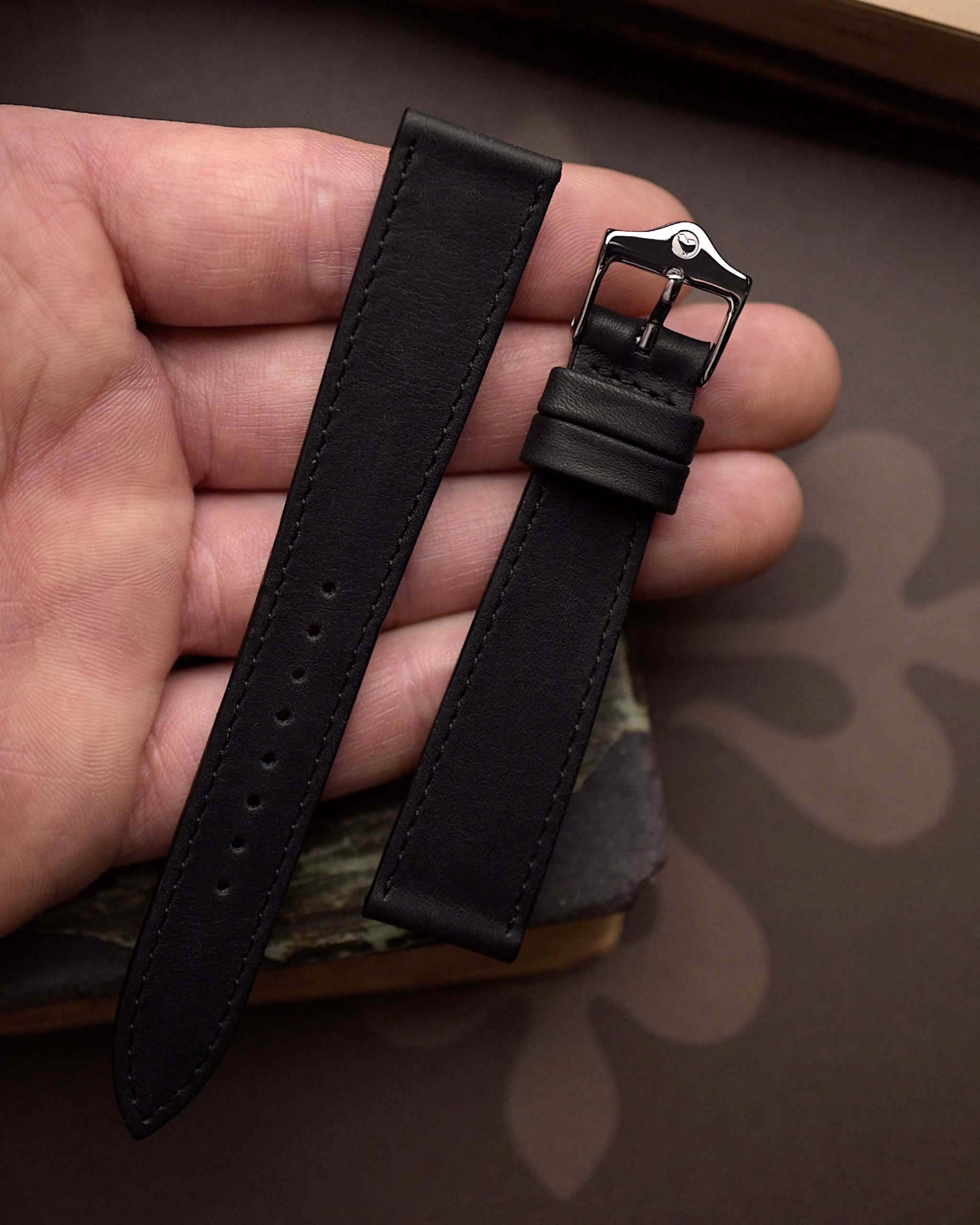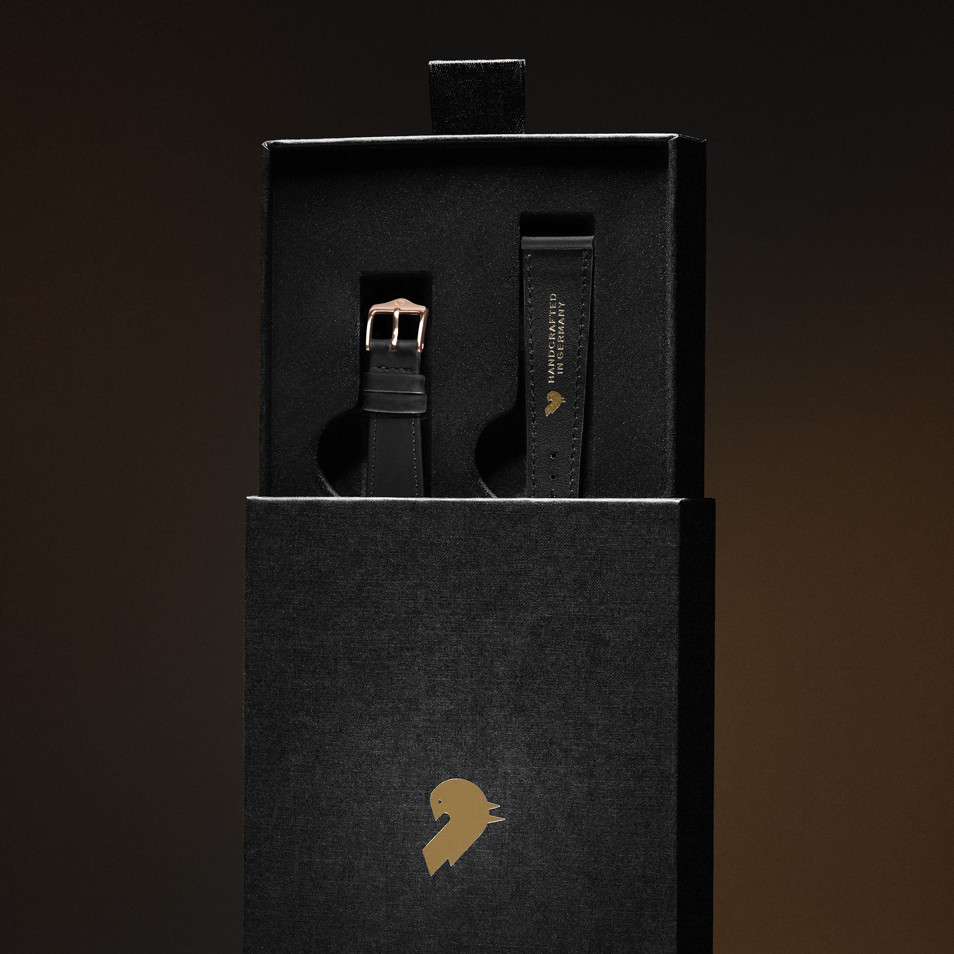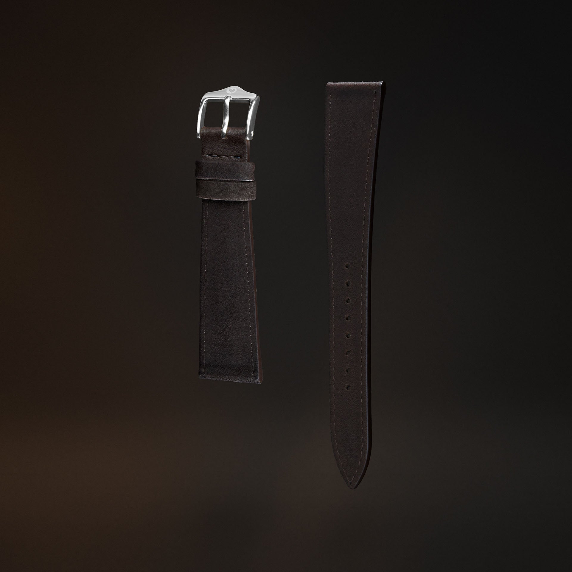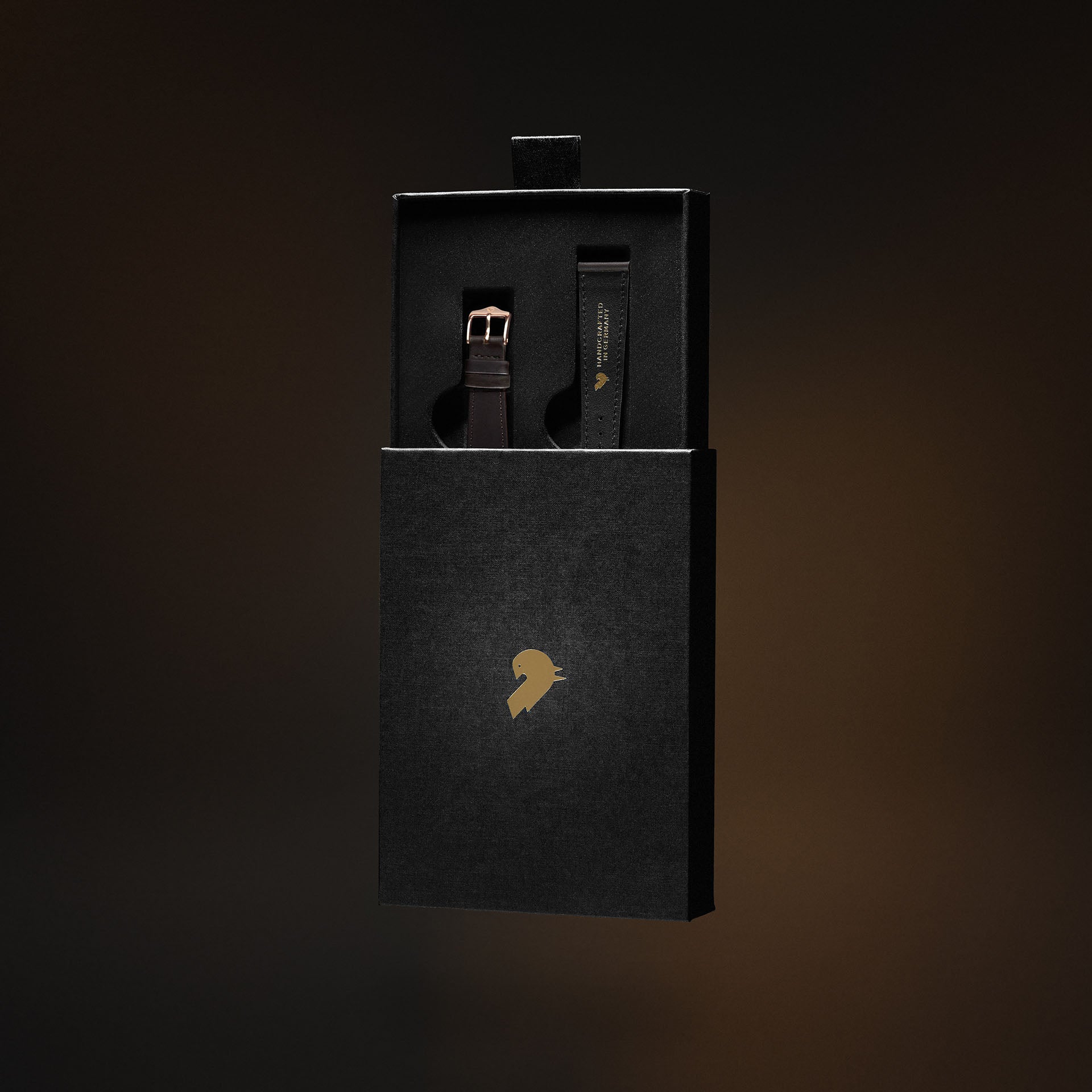 مصنوع من جلد العجل الألماني الرقيق مقاس 2 مم، وهو Kardinal ناعم للغاية ويحتضن معصمك منذ اليوم الأول. ويُعد الشكل المدبب الفريد من نوعه مكملاً حصيفاً ومكملاً لإطار الساعة الكلاسيكية الكلاسيكية.