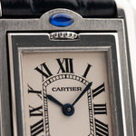 The stainless steel case is slim, balanced, and unmistakably Cartier. Its white dial with blued sword hands and minimalist design speaks to refined taste, while the original blue Cartier leather strap and deployant clasp complete the signature look.