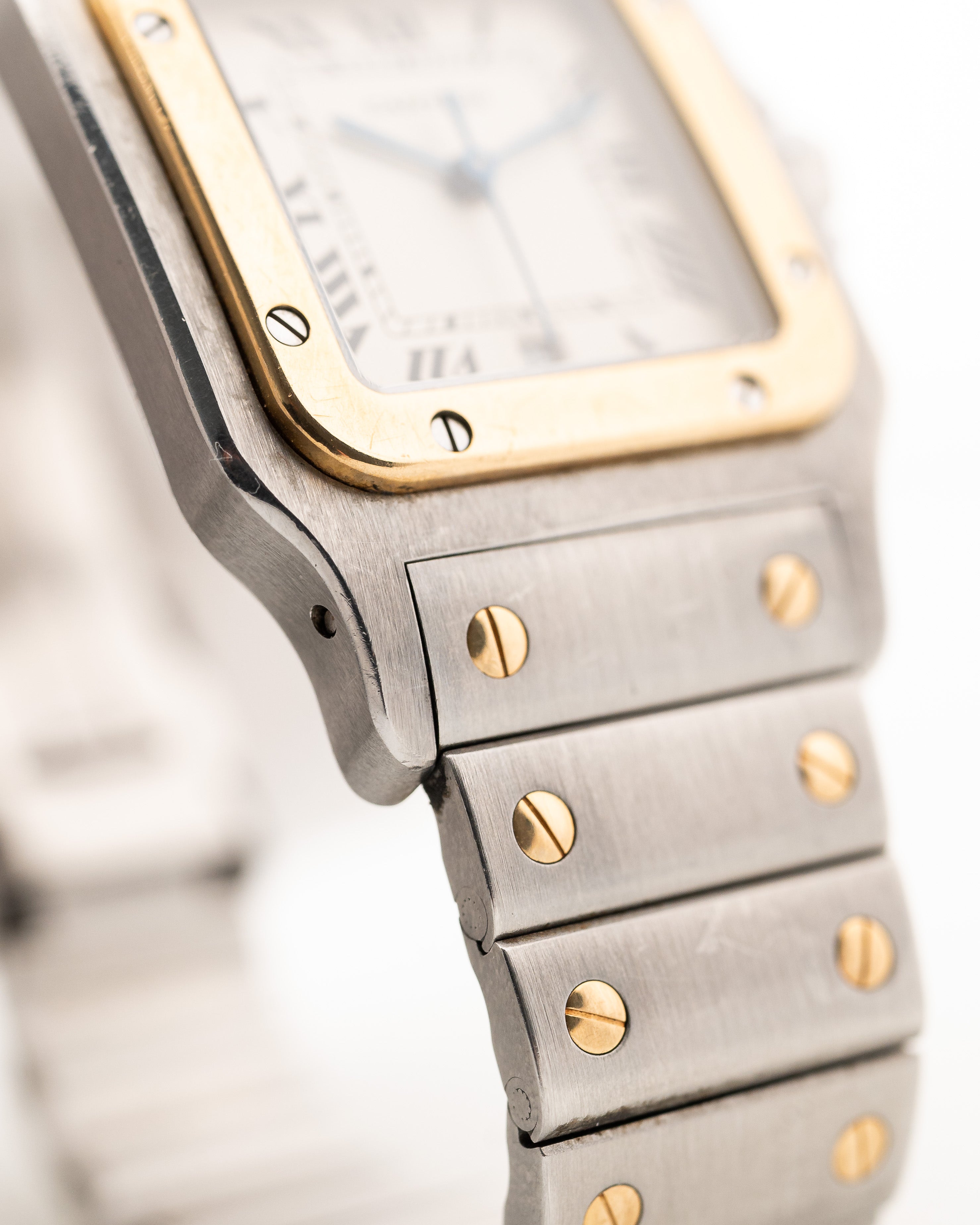 تبرز ساعة كارتييه سانتوس غالبي المصنوعة من الفولاذ المقاوم للصدأ بلونين من كارتييه سانتوس غالبيه، بميناها البني الجميل والنادر للغاية وعقاربها المصنوعة من الفولاذ الأزرق، وبالطبع أرقامها الرومانية السوداء.