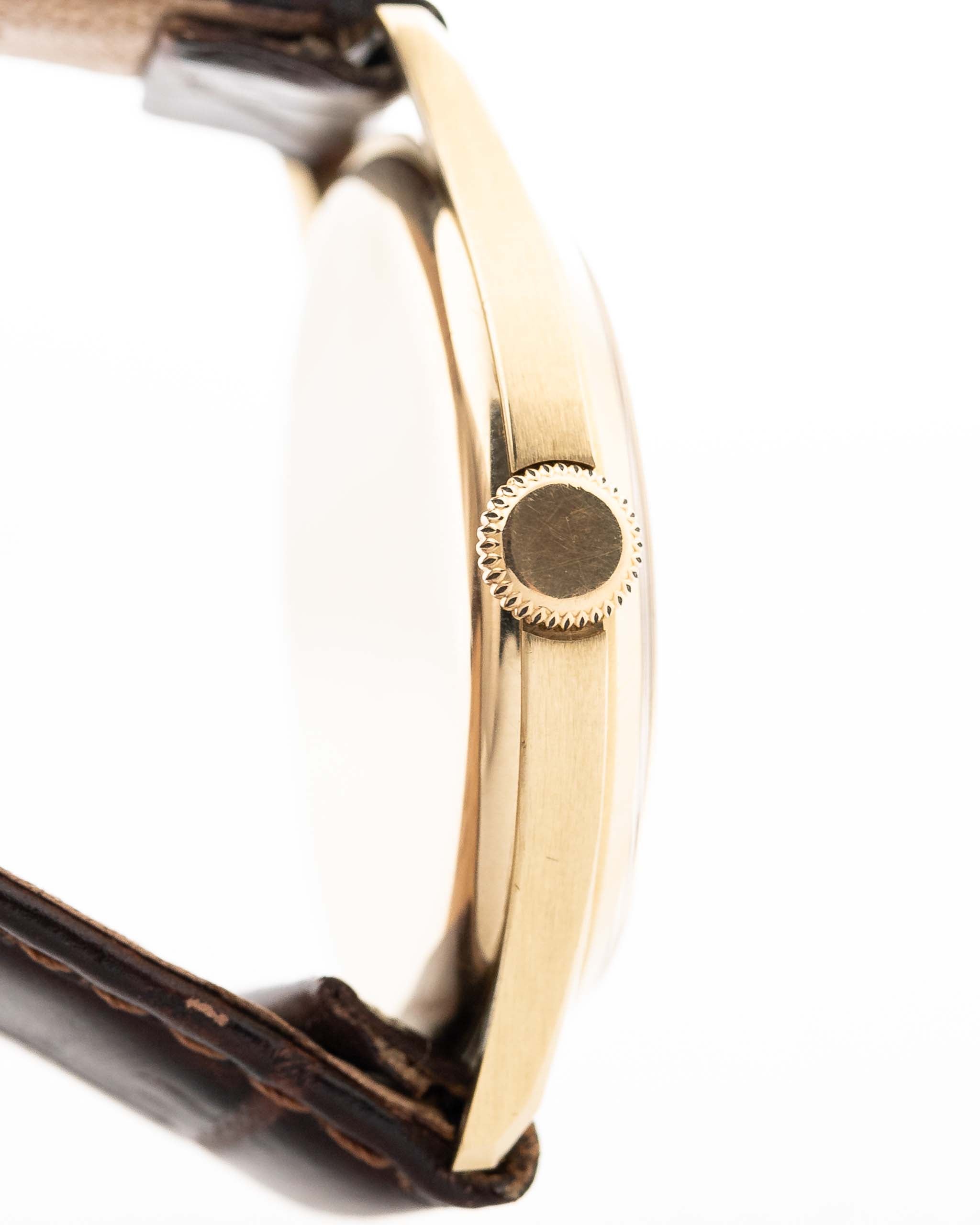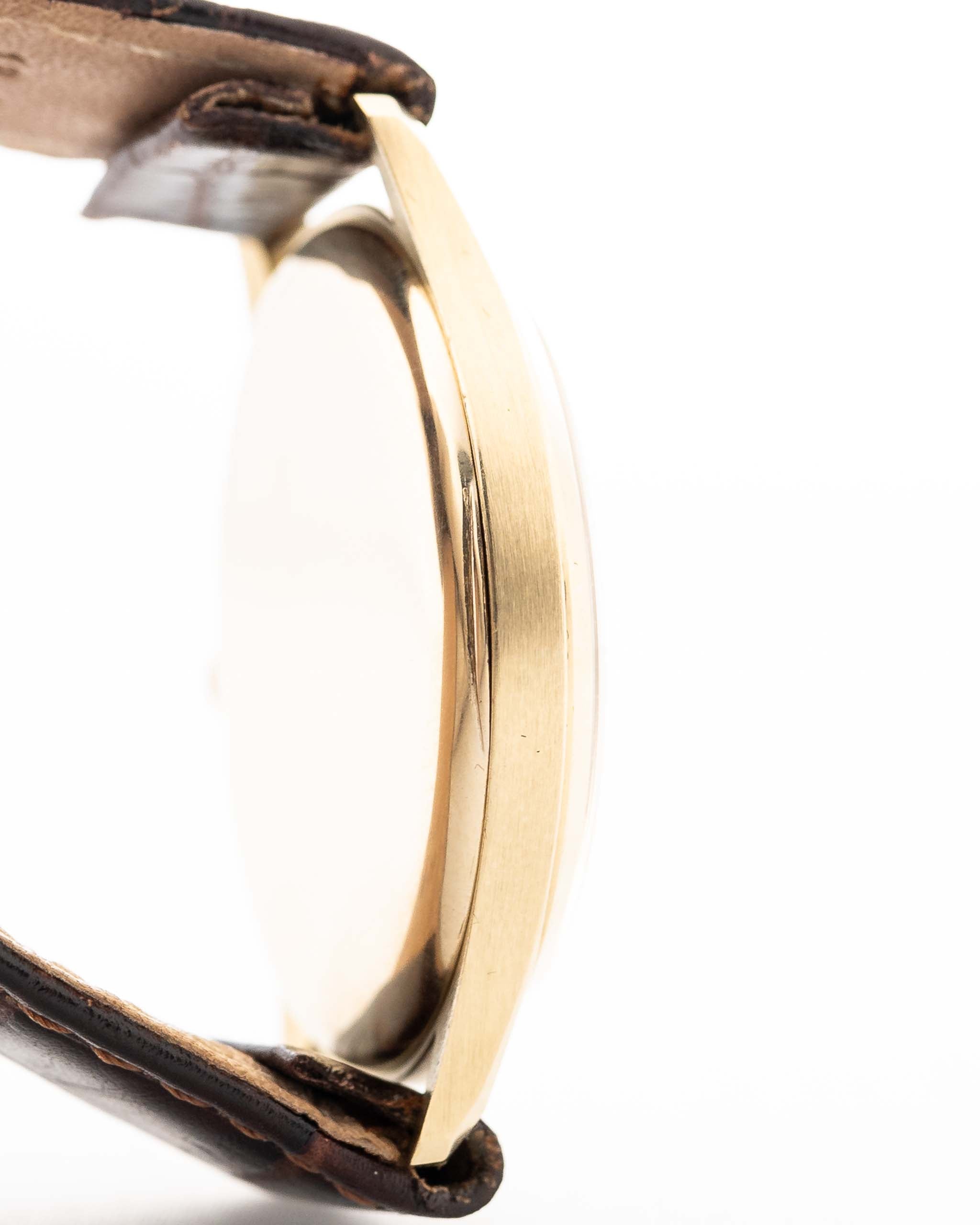 Elegant, oversized, and nearly impossible to find — this 1937 IWC Pre “Hermet” is a remarkable artifact from the golden age of Swiss horology. With a large-for-its-time 36.5 mm solid 14k yellow gold case, it was designed with both innovation and aesthetics in mind.