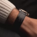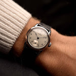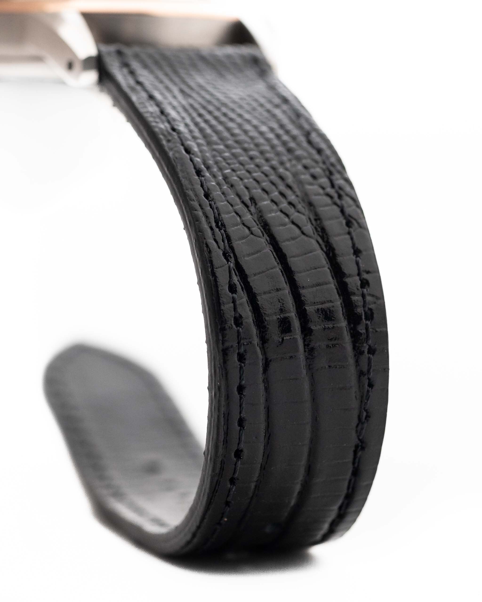 هذه الساعة مزوّدة بسوار جلدي أسود أنيق وإبزيم من الفولاذ المقاوم للصدأGOLDAMMER وهي قطعة صادقة وخالدة من تاريخ صناعة الساعات، وهي أنيقة اليوم كما كانت في عام 1939.