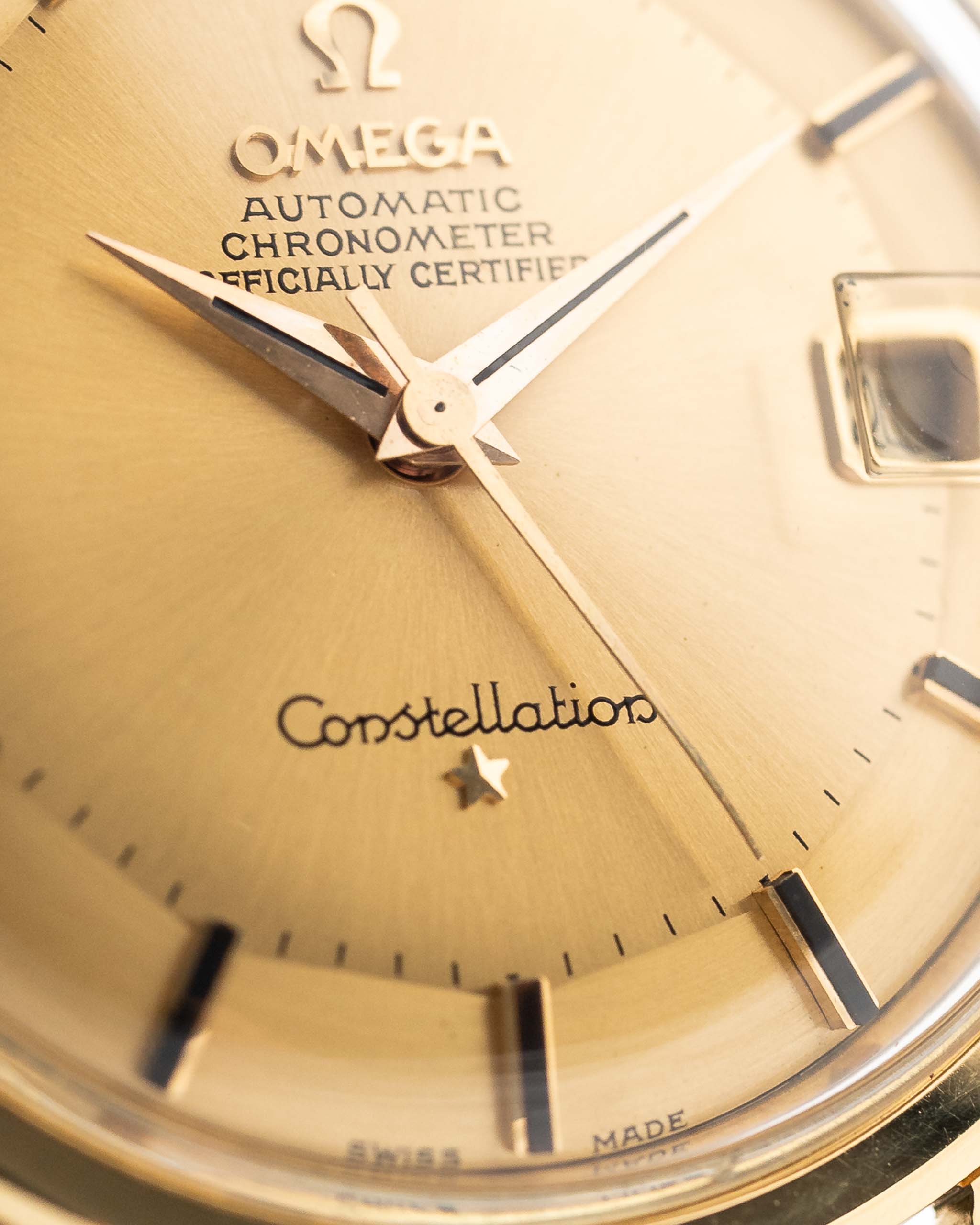 ساعة أوميغا كونستيلايشن 168004 أونيكس عيار 18 قيراطًا من عام 1963 علبة من الذهب الأصفر عيار 18 قيراط، عيار 561 أوتوماتيكي كرونومتر، مينا ذهبي خالٍ من العيوب