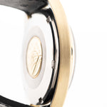 Housed in a 35 mm yellow gold-plated case, this Constellation features a clean day-date display, elegant stick hour markers, and a perfectly balanced dial layout. Paired with a glossy black alligator-embossed strap, this piece feels right at home whether you're at a formal dinner or enjoying a weekend espresso.