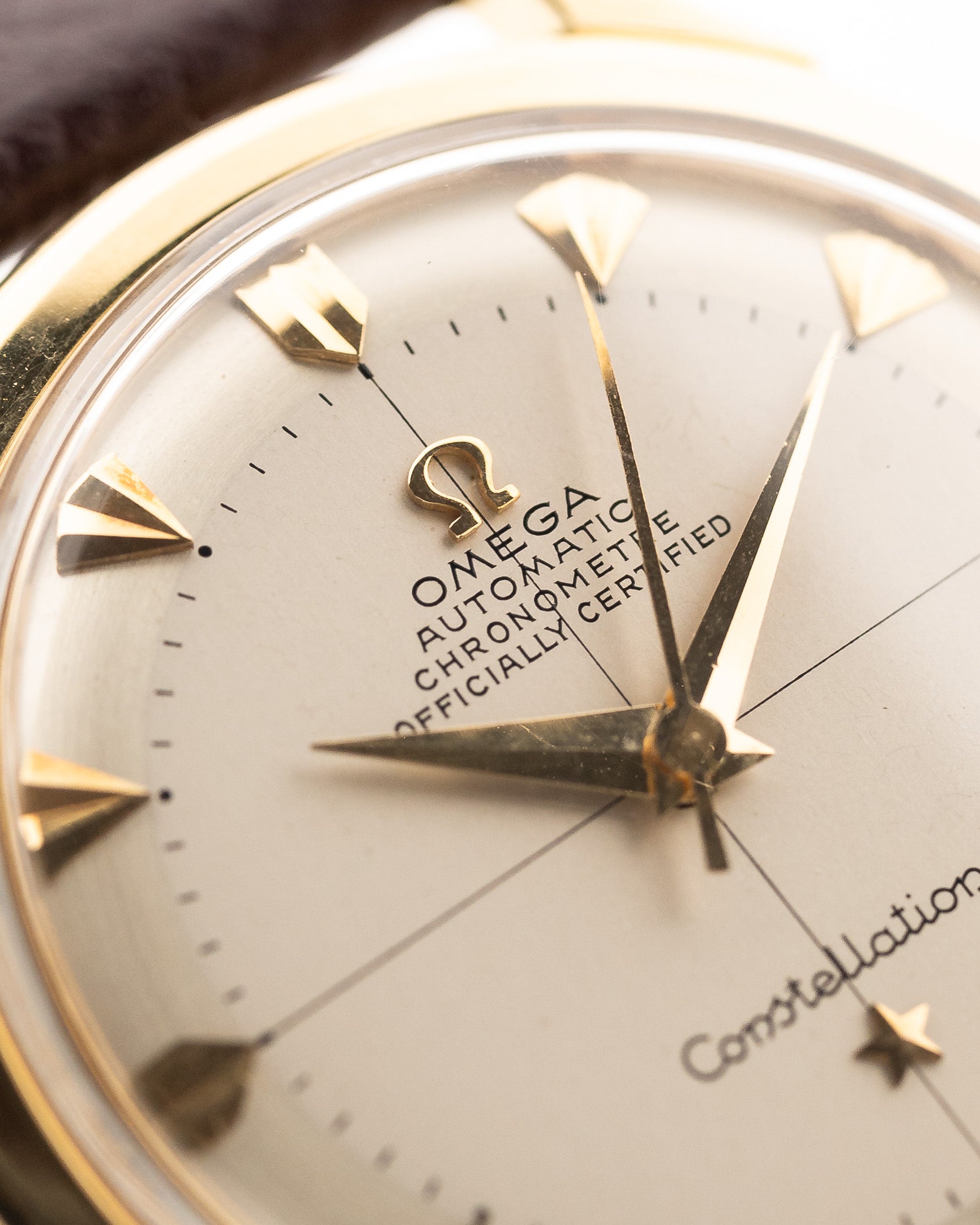 تحتوي ساعة أوميغا كونستيلايشن الكرونومتر الأوتوماتيكية المدمجة والجميلة هذه على كل ما تريده في ساعة فستان: علبة من الذهب الأصفر عيار 35 مم مقاس 18 مم، وثوانٍ في المنتصف، وميناء جميل للغاية ذو لونين متقاطعين مع علامات ساعات برأس سهم. أُصدرت ساعة كونستيليشن لأول مرة في عام 1952، وكانت ساعة أوميغا كونستيليشن هي رد أوميغا على ساعة رولكس ديت جست.
