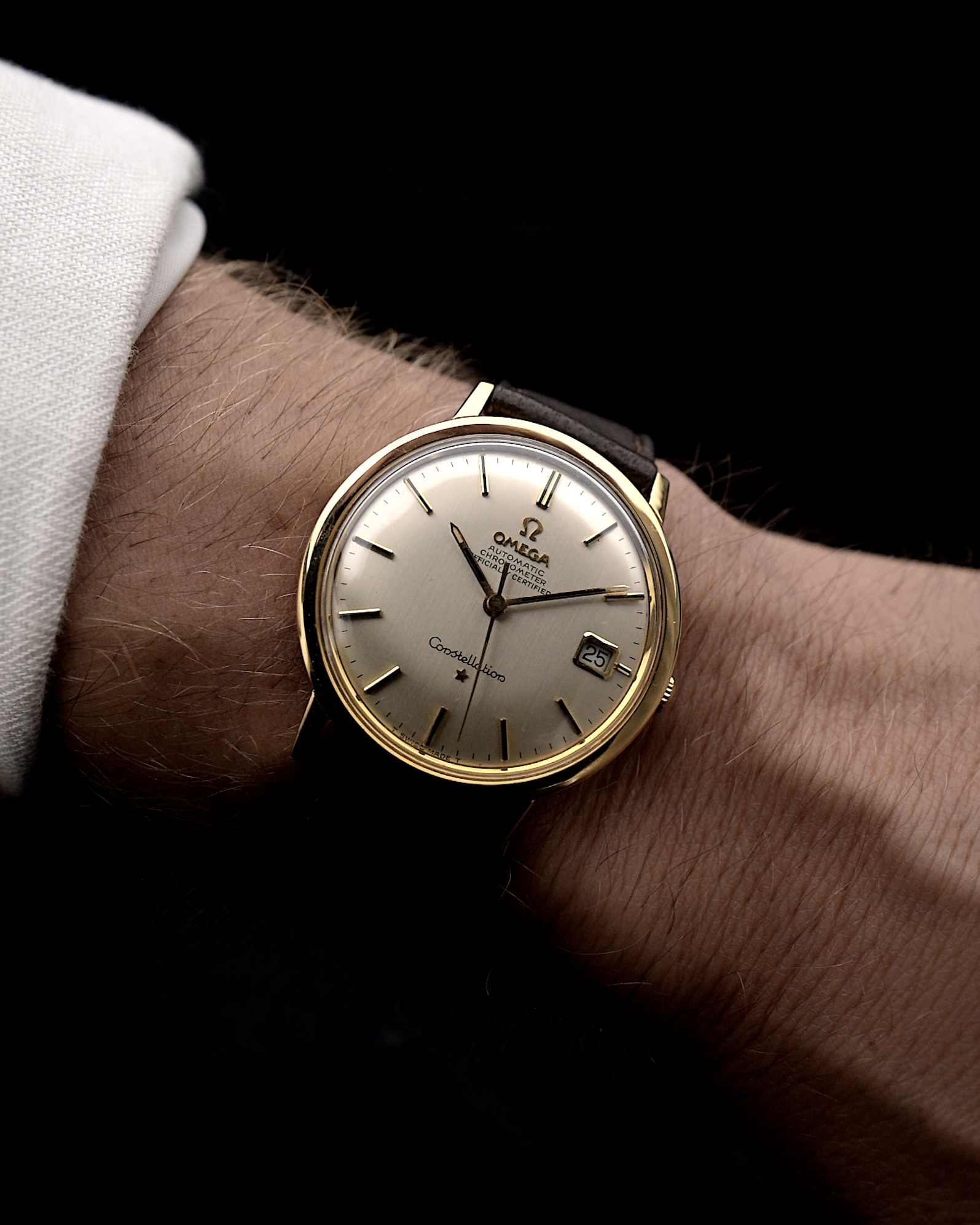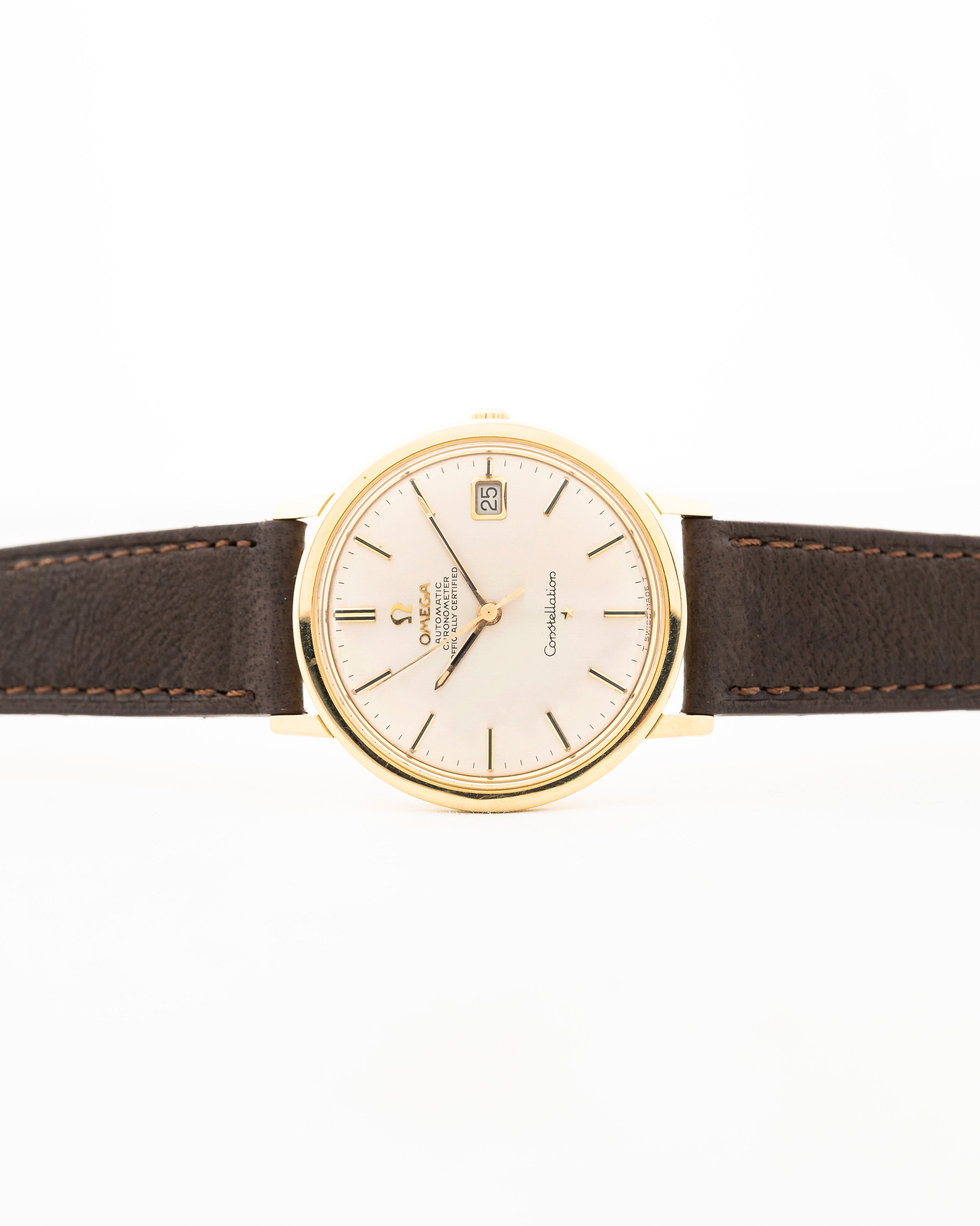 تتميز ساعة كونستيليشن هذه، المتناسقة والبسيطة والكلاسيكية، بظهر علبة خلفي مثبت لولبيًا وكرونومتر أوميغا الأوتوماتيكي عيار 561 وعروات مدورة بزاوية مائلة قليلاً.