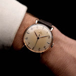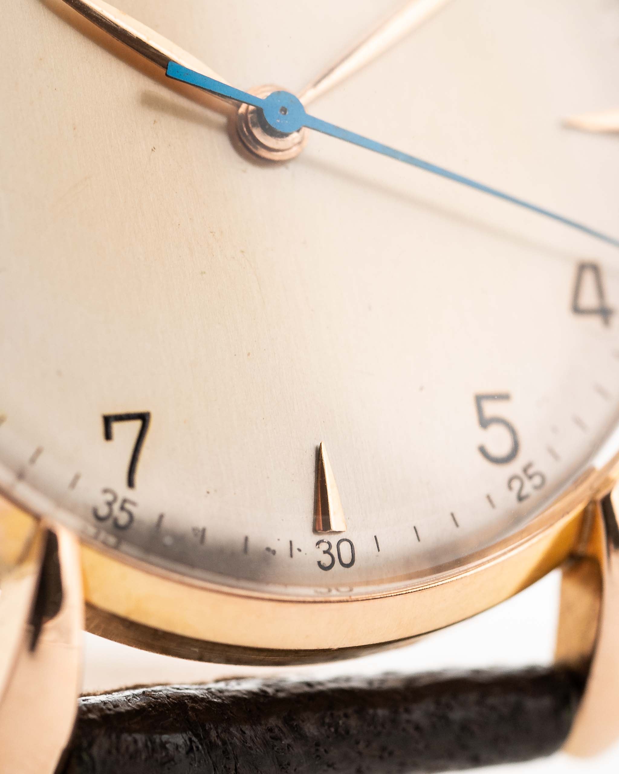 تحتوي ساعة أوميغا هذه من عام 1944 على كل ما تريده في ساعة فستان - علبة متوازنة مقاس 35 مم، وميناء فضي اللون مع زخرفة دافئة وأرقام وردية على طراز آرت ديكو، وعقارب جميلة من الذهب الوردي وشعار أوميغا. كما أن العروات الضخمة على شكل دمعة والعلبة المصنوعة من الذهب الوردي هي ما يميزها.