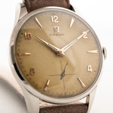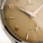 تحتوي ساعة أوميغا هذه من عام 1954 على كل ما تريده في ساعة فستان - علبة متوازنة مقاس 35 مم، وميناء رائع على شكل قرص عسل مع ثوانٍ فرعية وعقارب جميلة من الذهب الوردي ومؤشرات أنيقة للغاية مغطاة بالذهب الوردي.