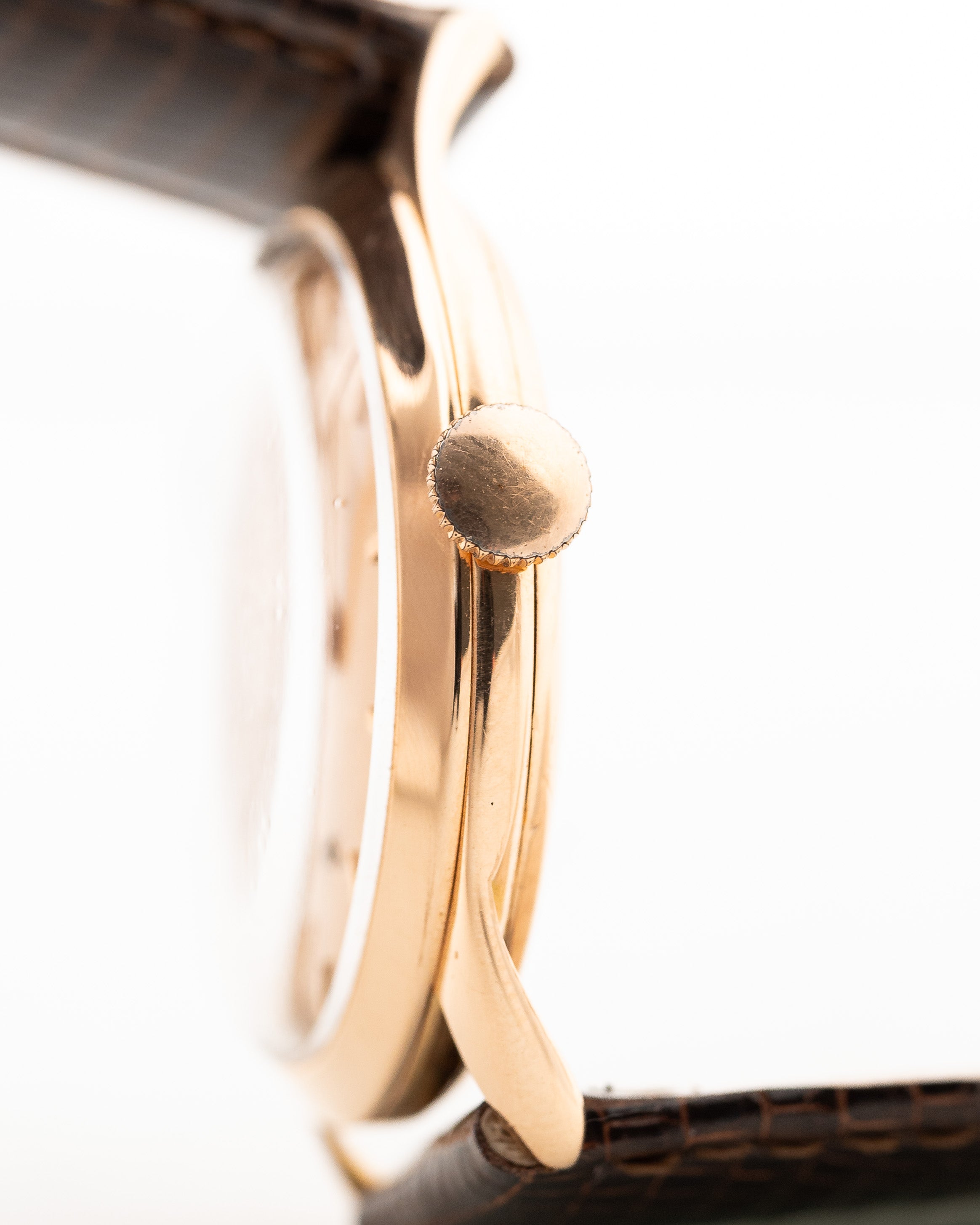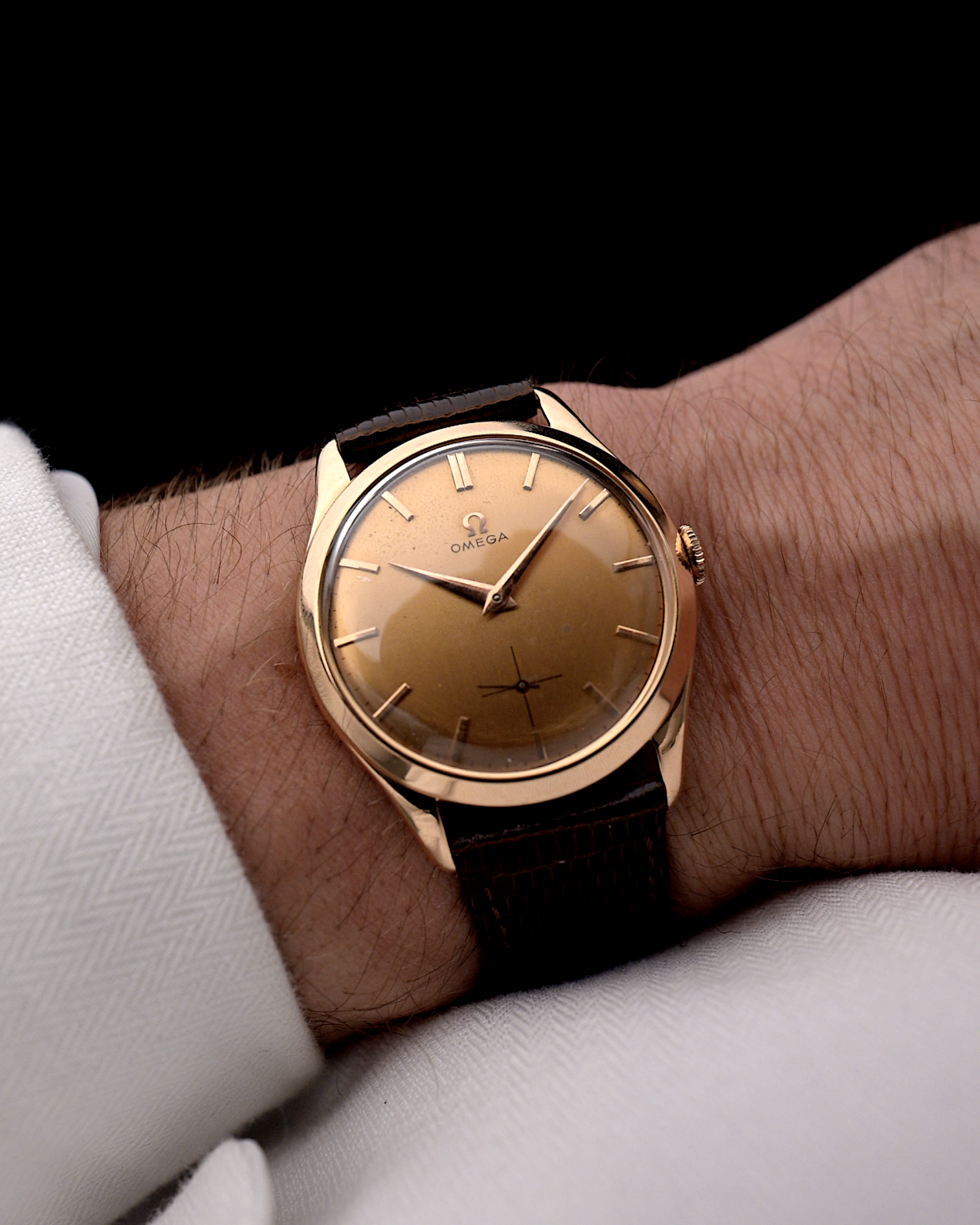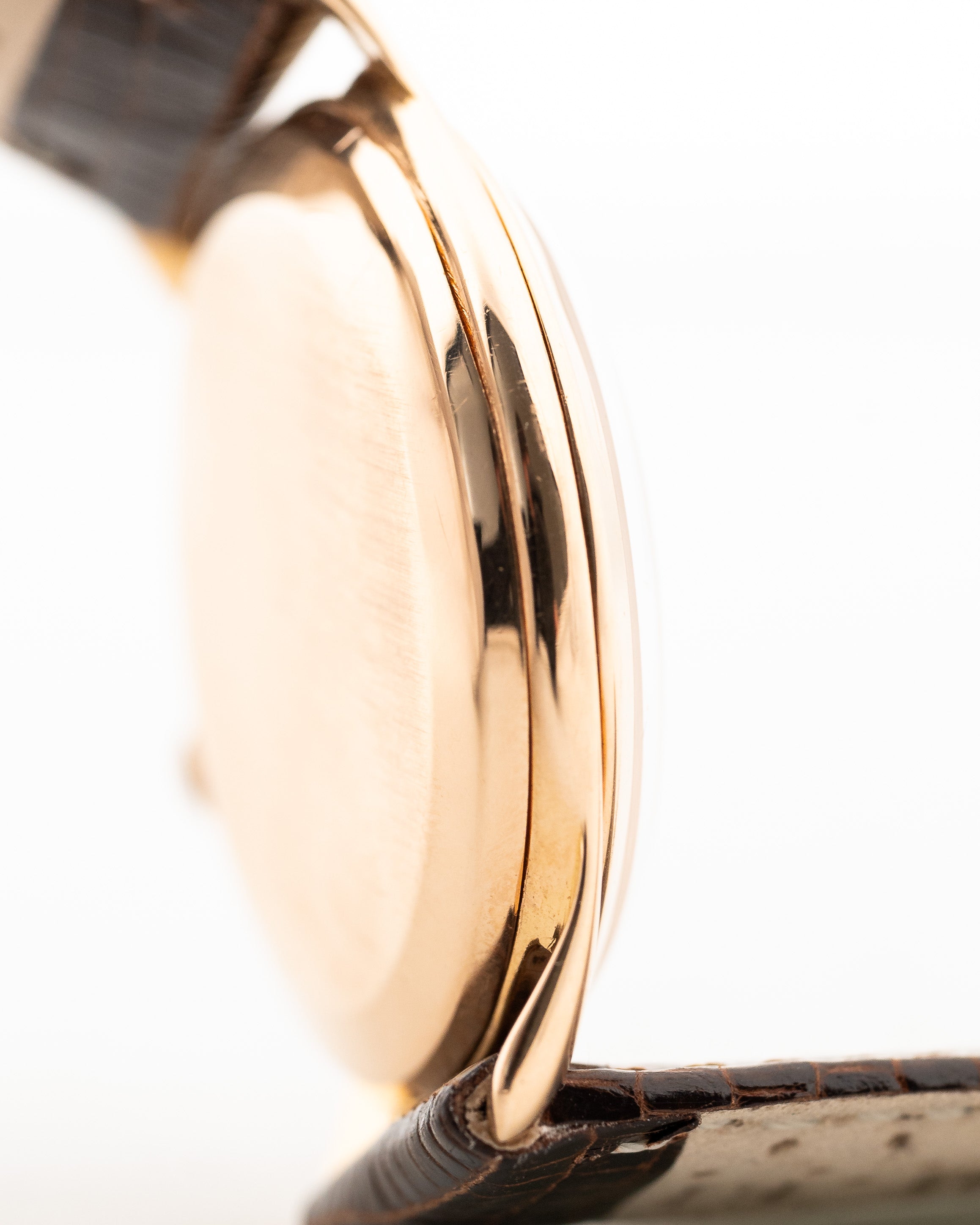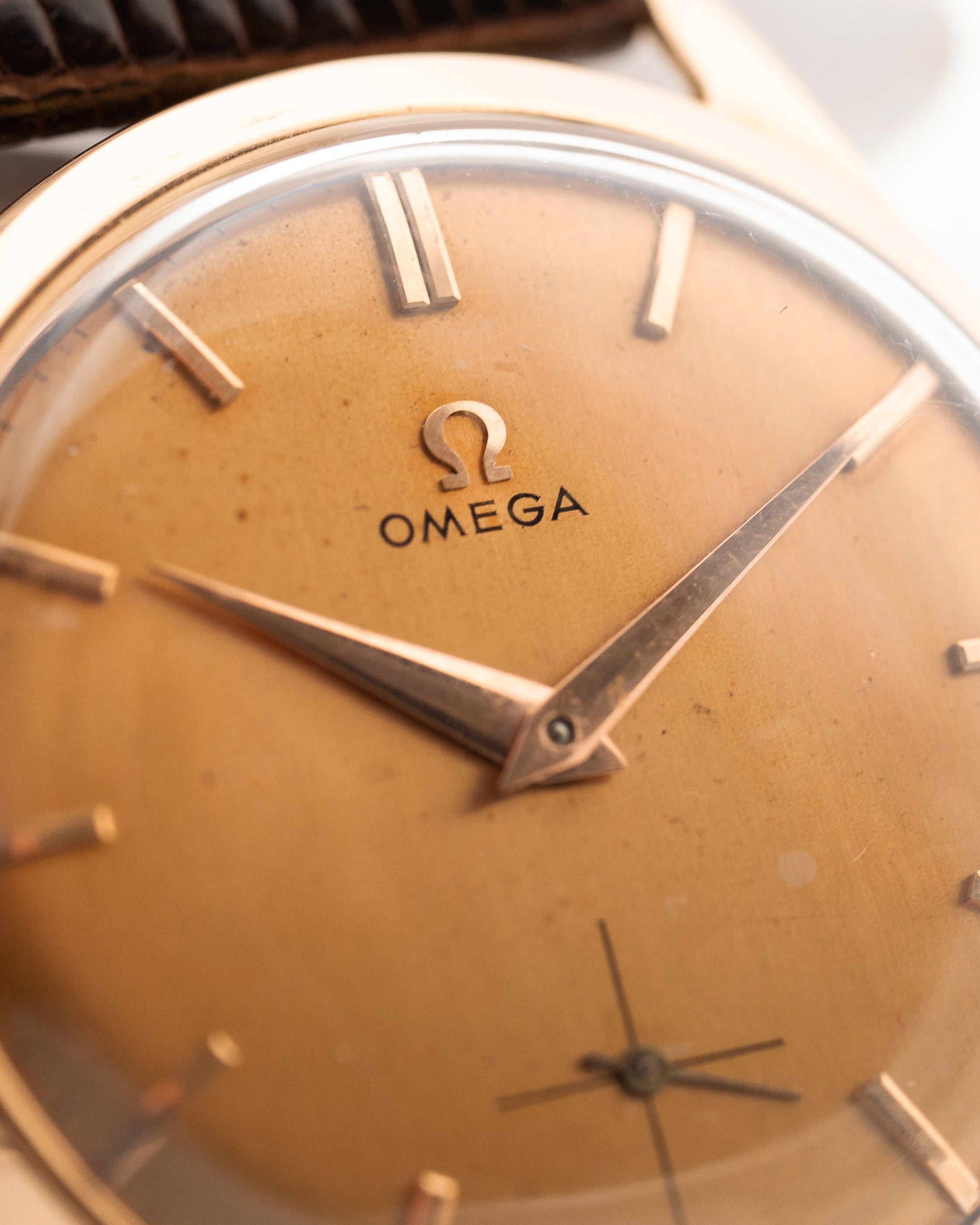 كانت فترة الأربعينيات من القرن الماضي فترة رائعة بالنسبة إلى أوميغا، كما يتجلى في هذه الساعة الجميلة. هذا المثال ليس فقط حسن المظهر، ولكنه جوهري أيضًا. فهي مزوّدة بعلبة من الذهب الوردي عيار 35.5 مم عيار 18 قيراطًا وعروات مائلة قليلاً وميناء رائع بلون نحاسي، ولا يمكنك حقًا أن تتفوق على هذه الساعة.