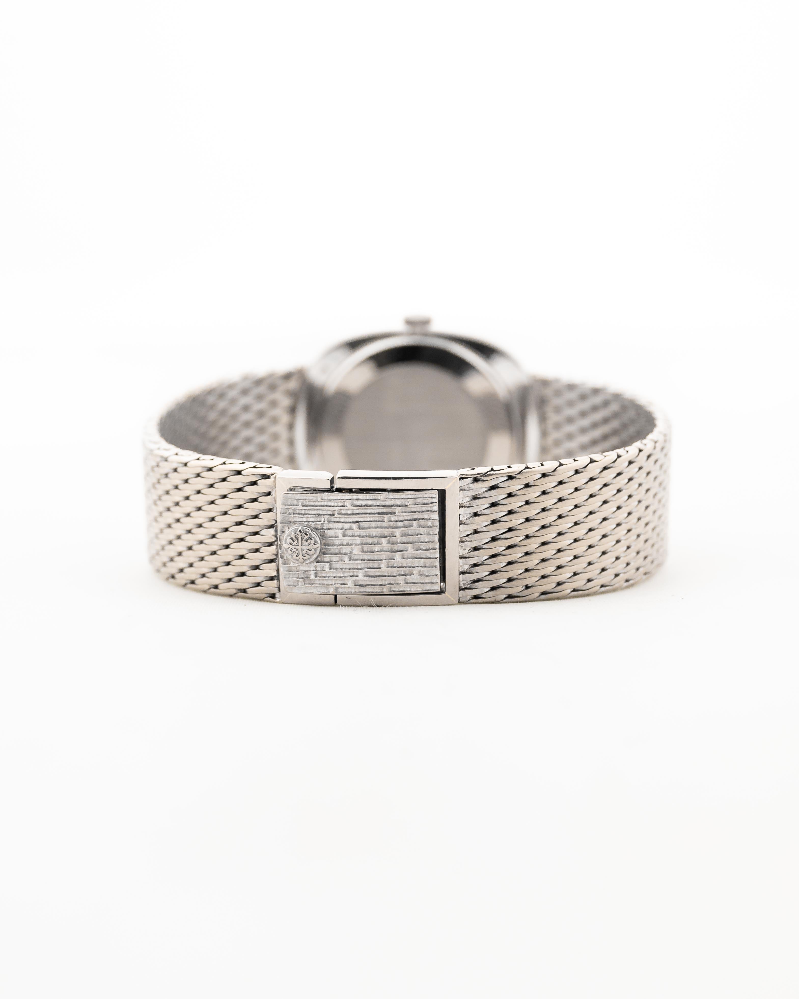 لدينا هنا عرض ممتاز لساعات باتيك فيليبس إليبس الفستانية، هذا المرجع. 3648 جميع النغمات العالية بعلبة من الذهب الأبيض عيار 18 قيراطًا مع سوار مدمج نادر جدًا من الذهب الأبيض وميناء سيجما نظيف من الذهب الأبيض عيار 18 قيراطًا في حالة لا تشوبها شائبة مع أرقام رومانية.