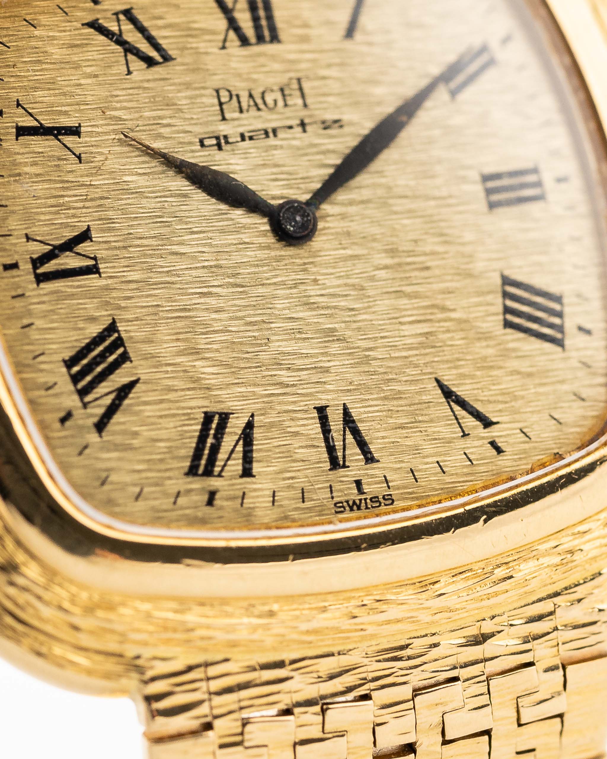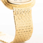 ساعة بياجيه مربعة الشكل عتيقة 75121 رومان بارك من السبعينيات. مقاس 34 مم من الذهب الأصفر عيار 18 قيراطاً مع حركة كوارتز وميناء ذهبي لا تشوبه شائبة وسوار مدمج.