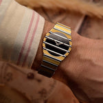 تعد ساعة Piaget Polo Ref. 7661 C 701 التعبير الأكثر جرأة عن الفخامة في الثمانينيات:نسخة Jumbo مقاس 34 مم مصنوعة بالكامل من الذهب الأصفر والأبيض عيار 18 قيراطًا، وتتميز بمينا من حجر الأونيكس الخالي من العيوب الذي يضفي عليها طبقة من الفخامة نادرًا ما نراها - حتى بين طرازات Polo.