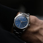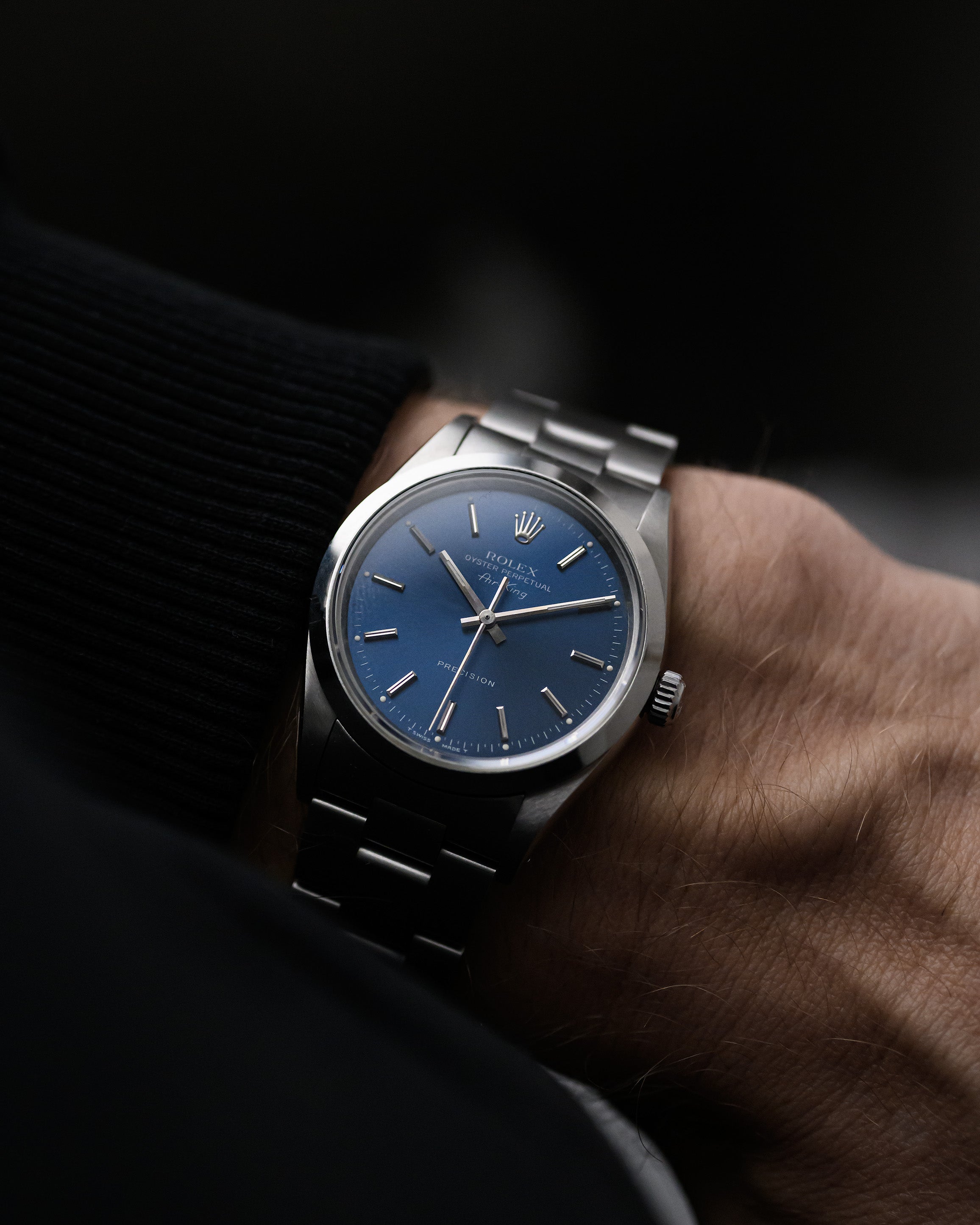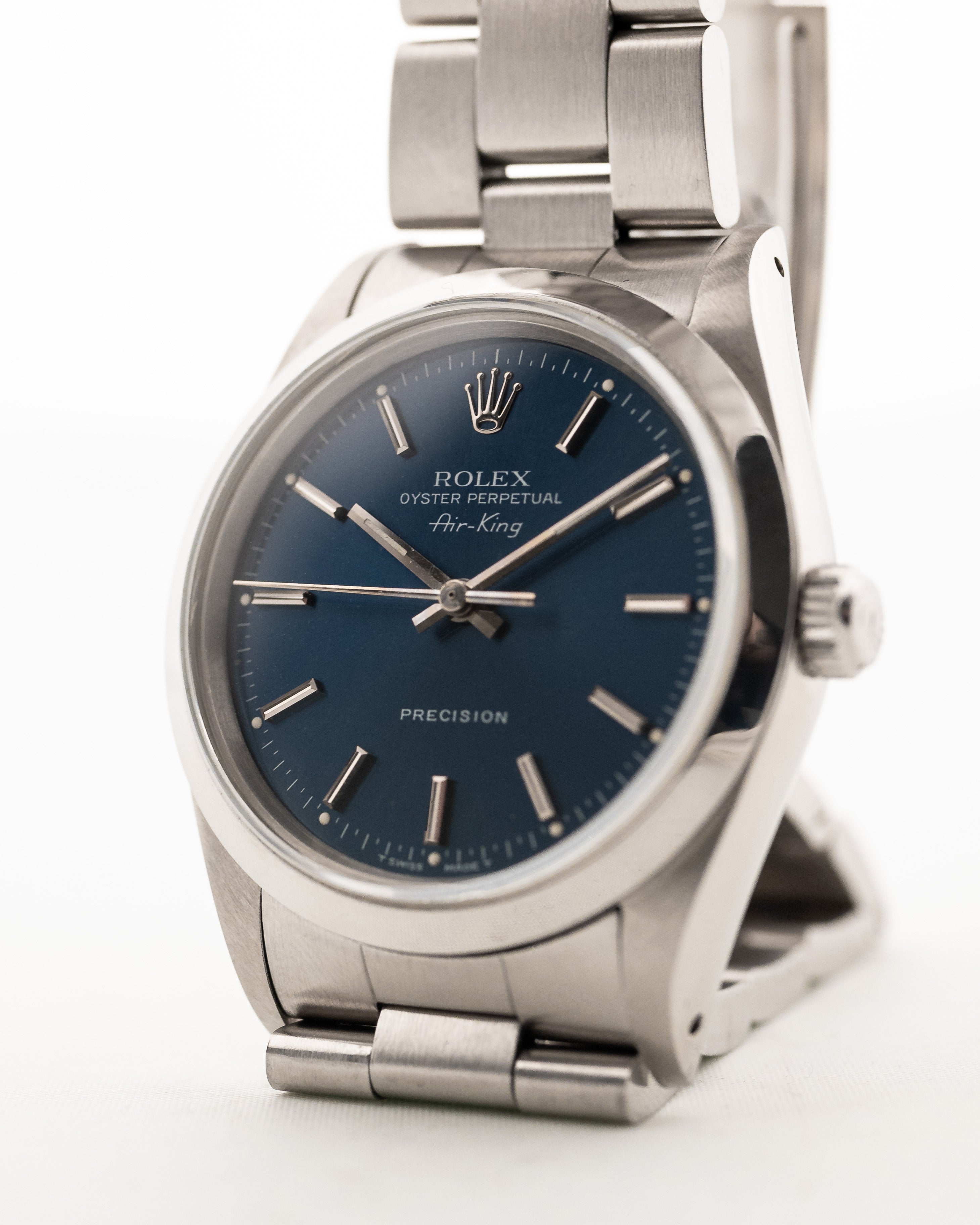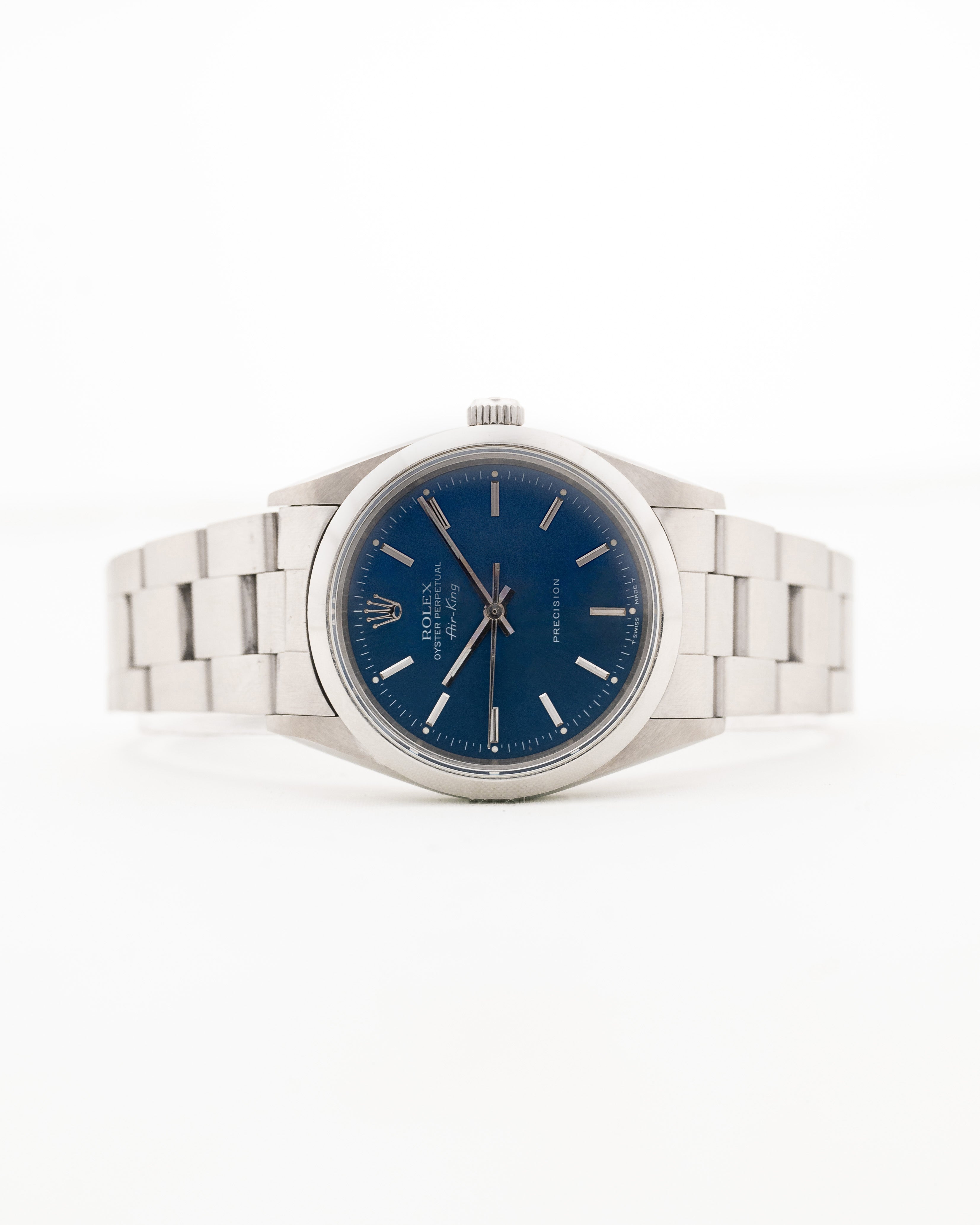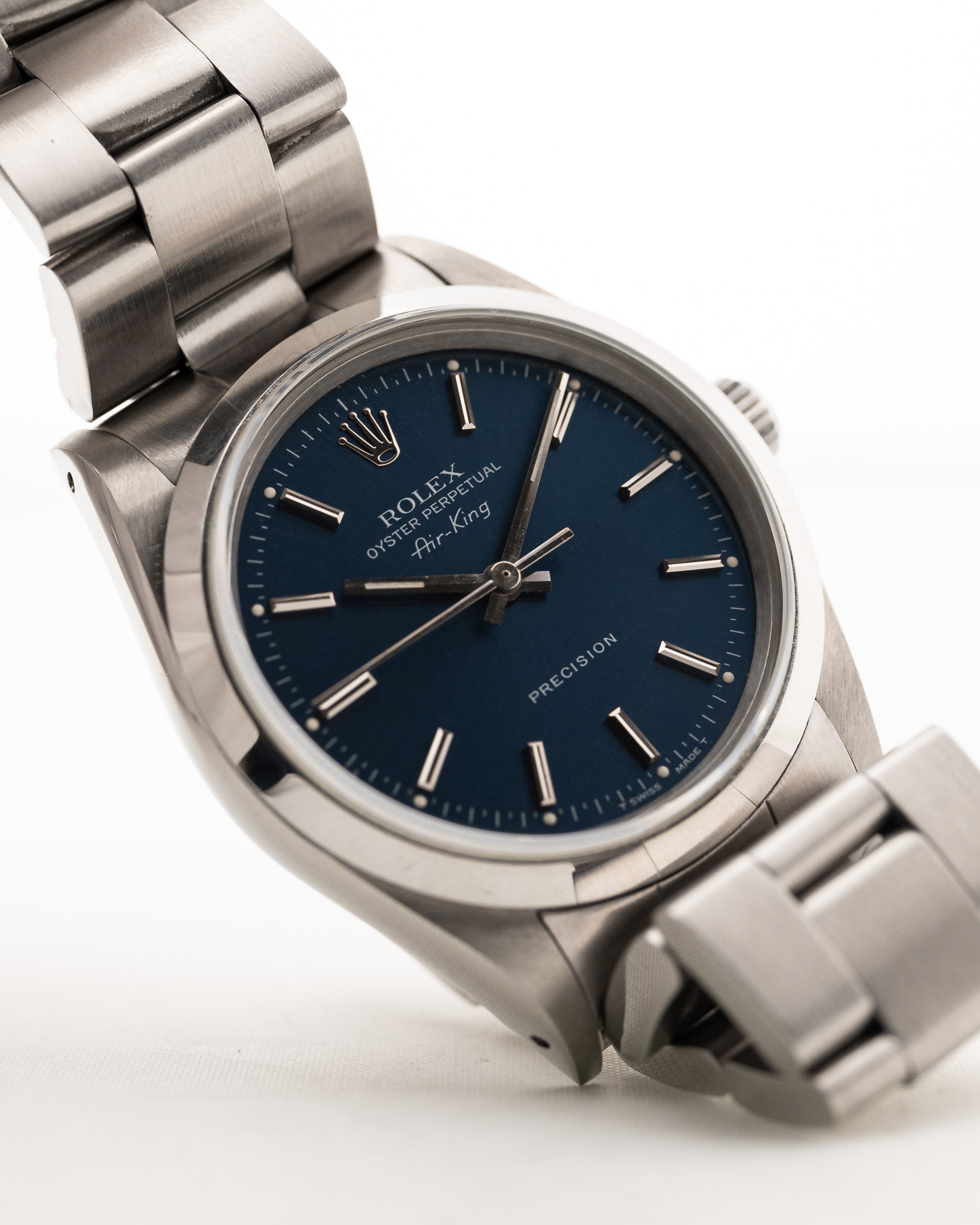تُعد ساعة Air-King واحدة من آخر الموديلات التي لم تكن معروفة لدى رولكس وتتميّز بتصميم كلاسيكي يمكن للمرء أن يطلبه من عائلة أويستر بيربيتشوال. وقد جعل هذا المرجع من البساطة عنصرًا أساسيًا في هذه الساعة، حيث يتميّز المينا الأزرق الغامق الأنيق بمؤشرات مطبوعة لوضوح القراءة وتضفي العقارب العريضة مظهرًا أنيقًا بشكل عام.