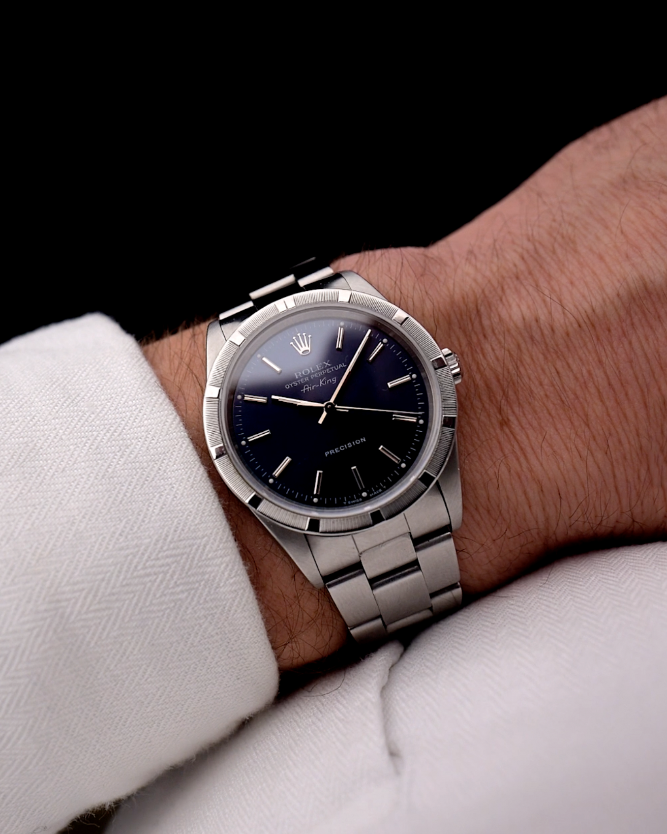 تُعد ساعة Air-King واحدة من آخر الموديلات التي لم تكن معروفة لدى رولكس وتتميّز بتصميم كلاسيكي يمكن للمرء أن يطلبه من عائلة أويستر بيربيتشوال. وقد جعل هذا المرجع من البساطة عنصرًا أساسيًا في هذه الساعة، حيث يتميّز المينا الأزرق الصافي بلون الشمس المشرق مع مؤشرات مطبوعة لوضوح القراءة وتضفي العقارب العريضة مظهرًا أنيقًا بشكل عام.