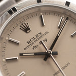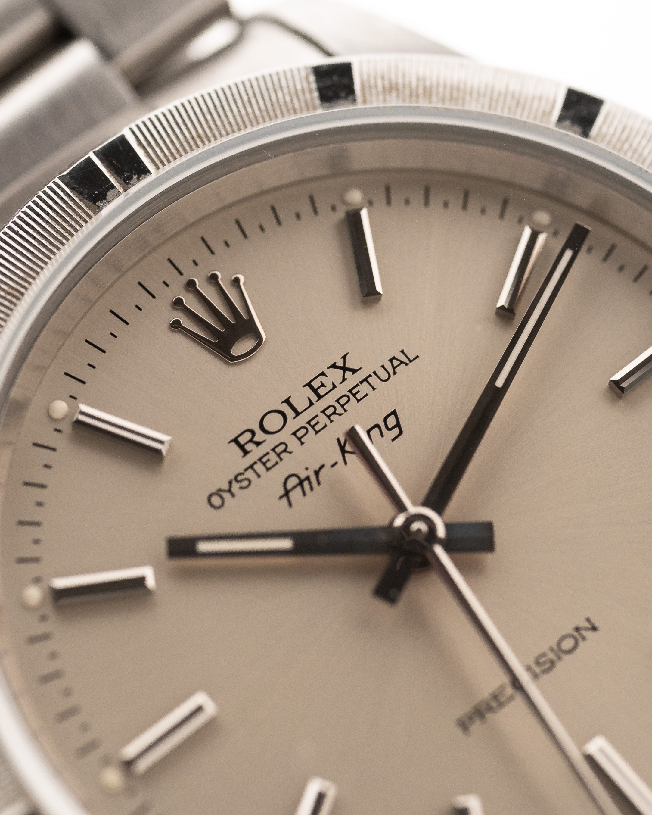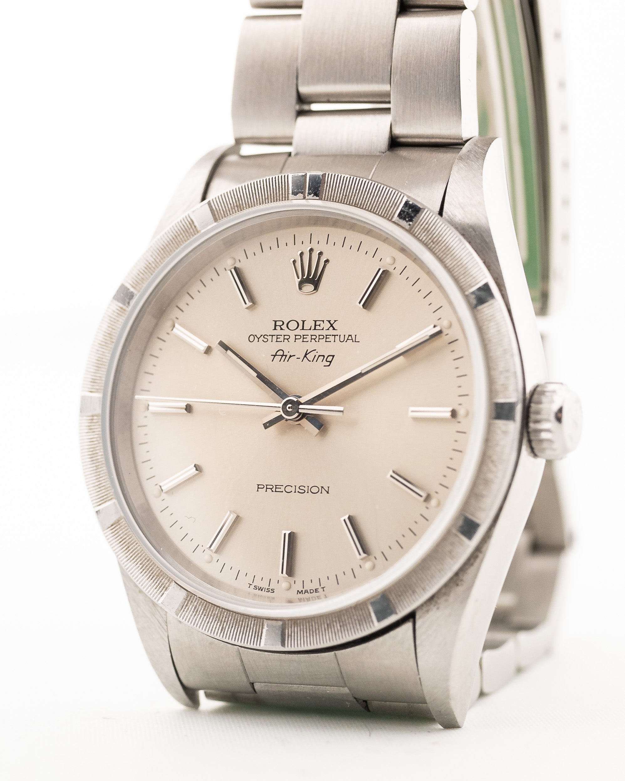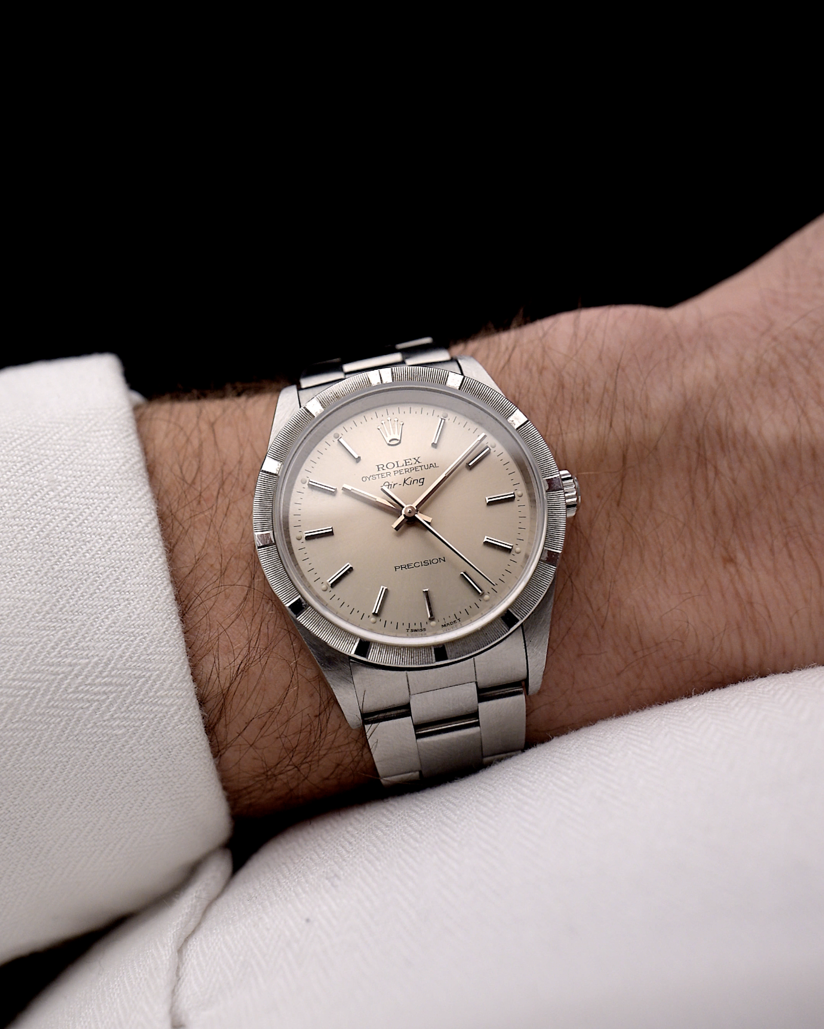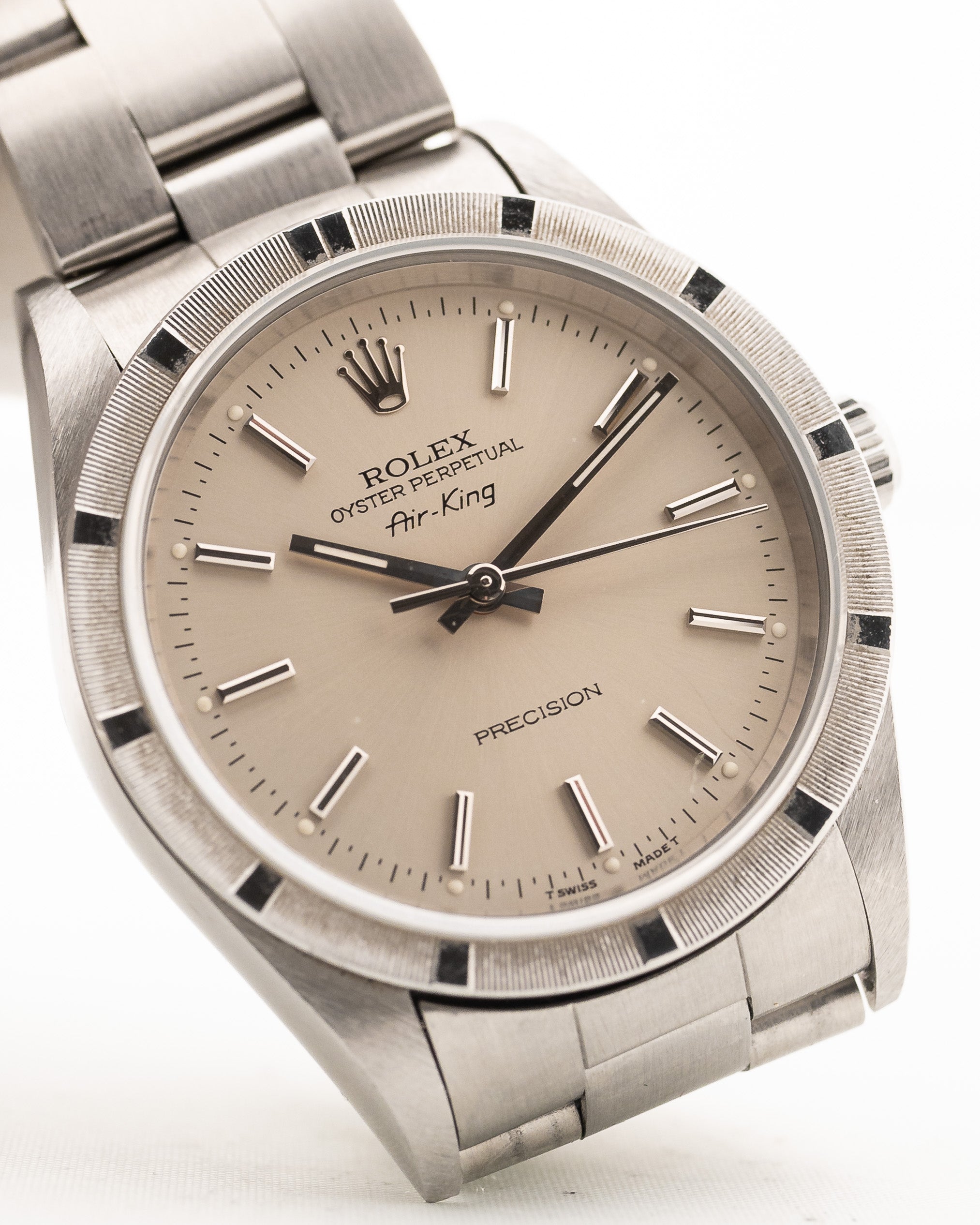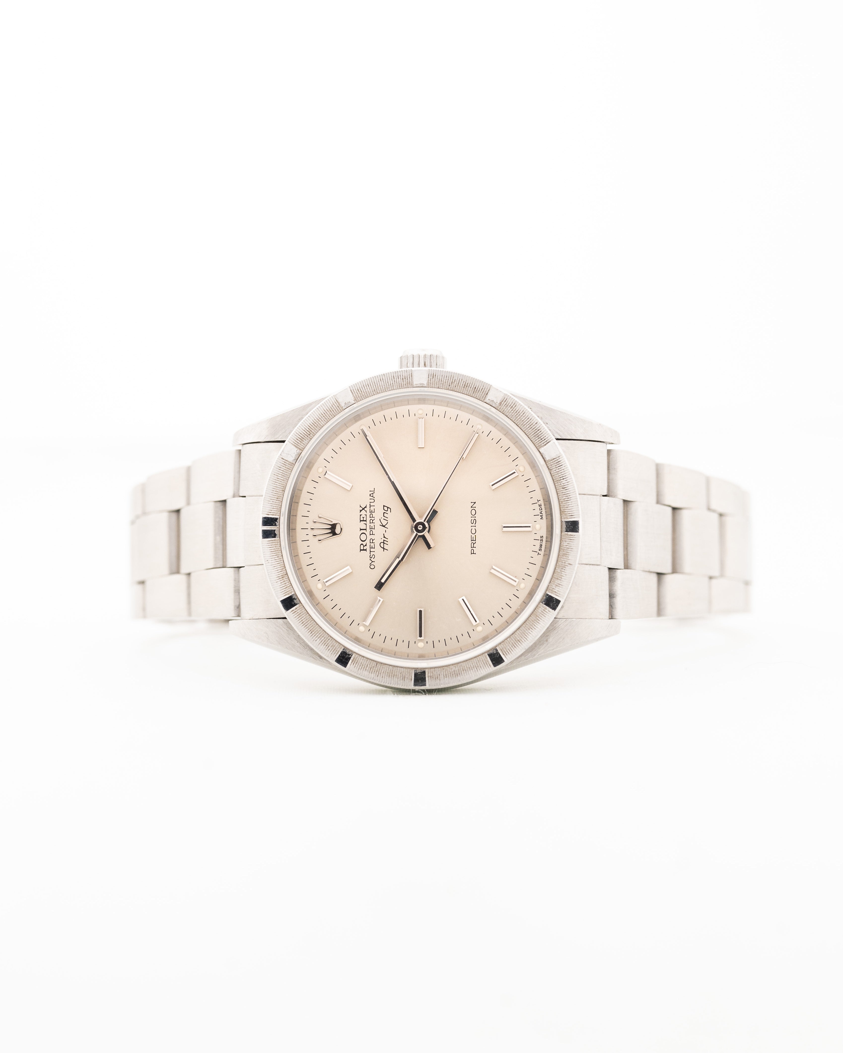 تُعد ساعة Air-King واحدة من آخر الموديلات التي لم تكن معروفة لدى رولكس وتتميّز بكل ما يمكن أن يطلبه المرء من عائلة ساعات أويستر بيربيتشوال من تصميم كلاسيكي. وقد جعل هذا المرجع من البساطة عنصرًا أساسيًا في هذه الساعة، حيث يتميّز المينا باللون الفضي الأنيق مع مؤشرات مطبوعة لوضوح القراءة وتضفي العقارب العريضة مظهرًا أنيقًا بشكل عام.