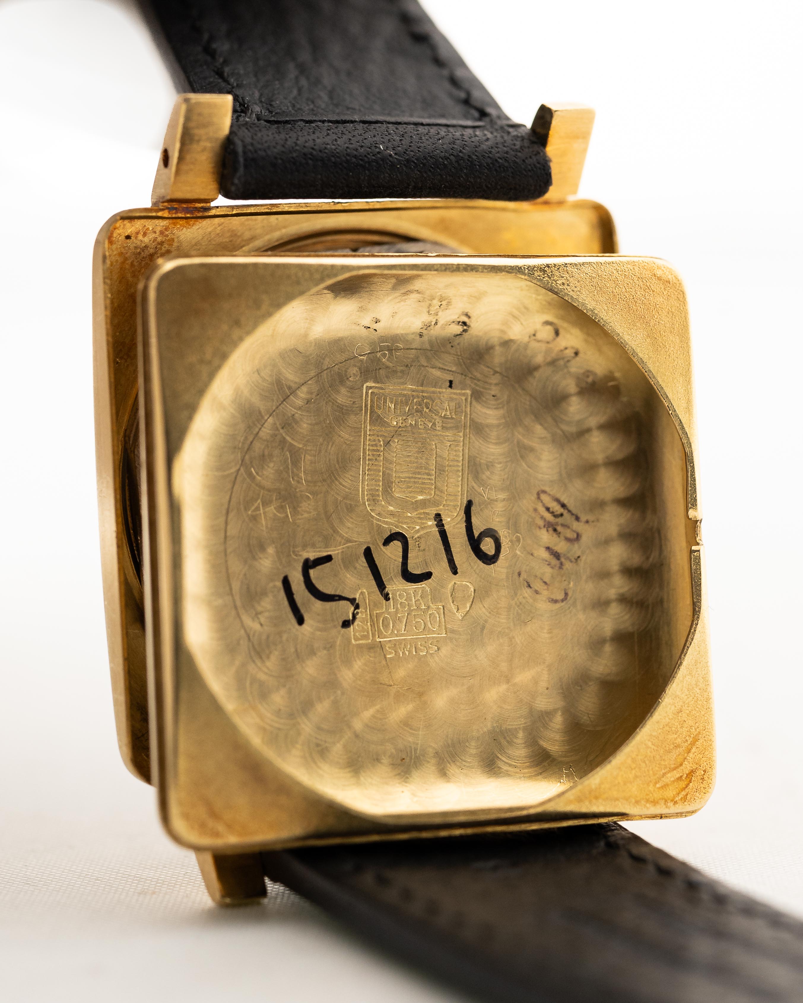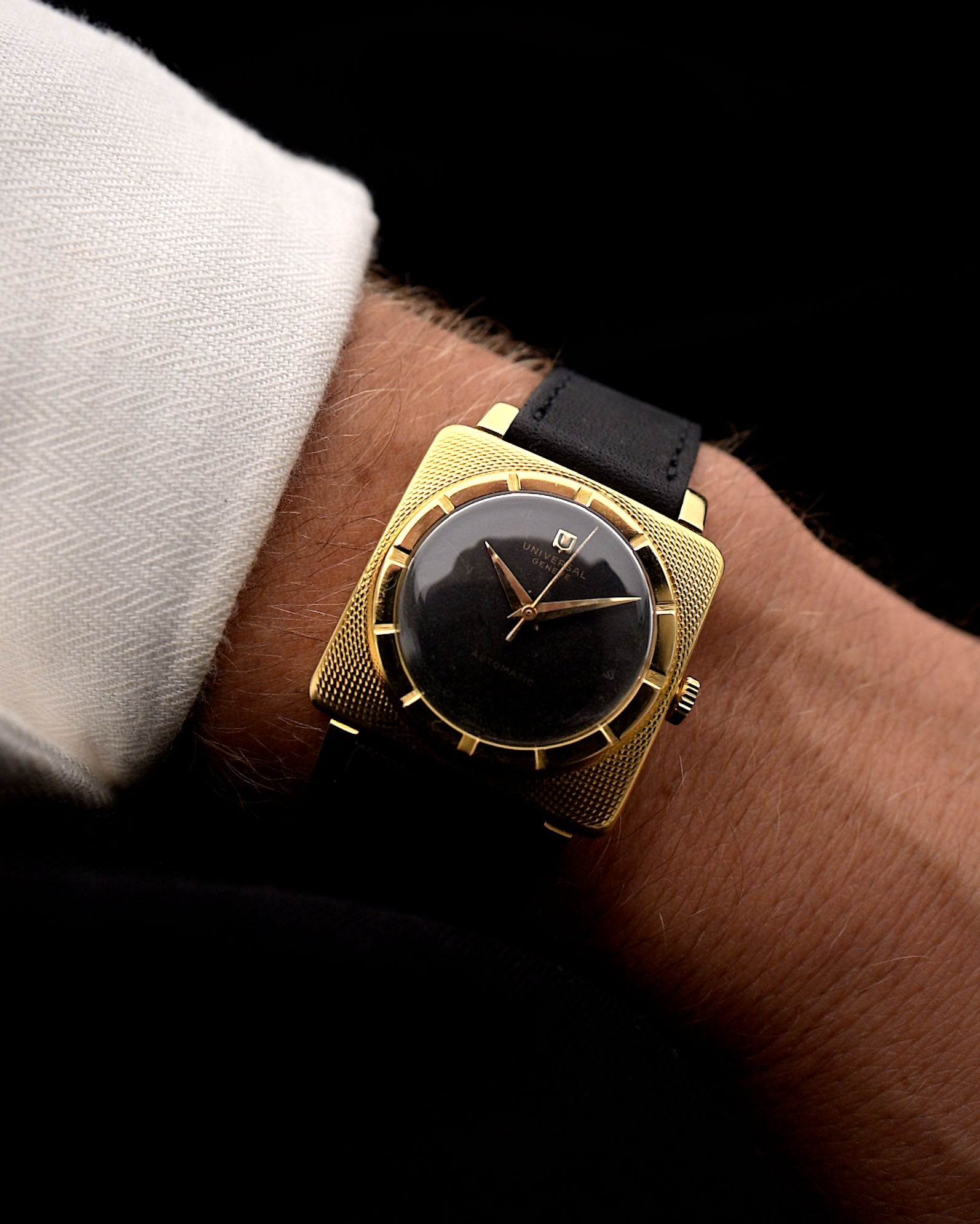 تُعدّ ساعة يونيفرسال جينيف سكوير من الذهب الأصفر عيار 18 قيراطًا ساعة مميزة حقًا ولن تراها كثيرًا على معاصم أخرى. أُنتجت على مدى 7 سنوات فقط في منتصف الخمسينيات من القرن الماضي. تحتوي على بعض عناصر ساعة Polerouter مثل الإطار، الذي لا ينتصر على الميناء كالمعتاد ولكن على العلبة المربعة المصنوعة من الذهب الأصفر عيار 18 قيراطًا مع تشطيبها المخرّم والمصنوع من الذهب الأصفر عيار 18 قيراطًا. تنضح تفاصيل التصميم هذه بنوع مختلف من السحر وتخلق حضوراً مدهشاً على المعصم.
