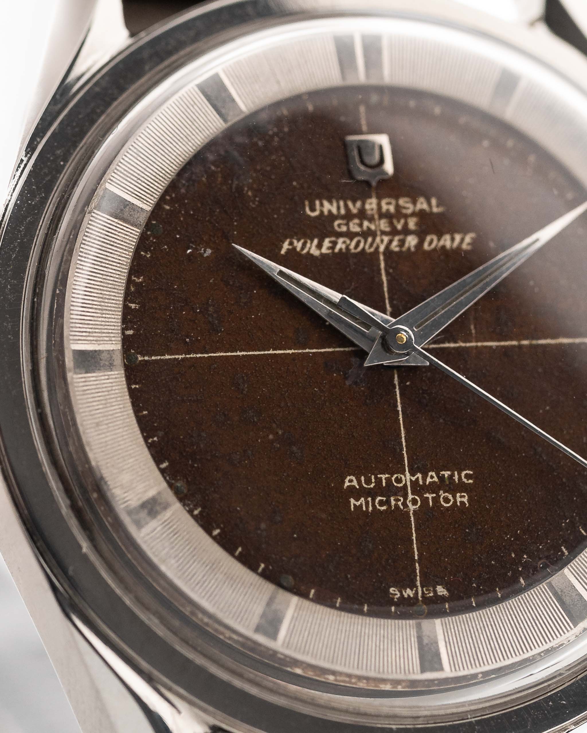 Our example, powered by the legendary Microtor Caliber 215, captures everything that makes the Polerouter iconic: technical elegance, aviation heritage, and bold design. The dial has aged beautifully into a warm tropical brown, adding stunning depth to the crosshair layout and steel chapter ring. It’s a watch that feels alive with history.