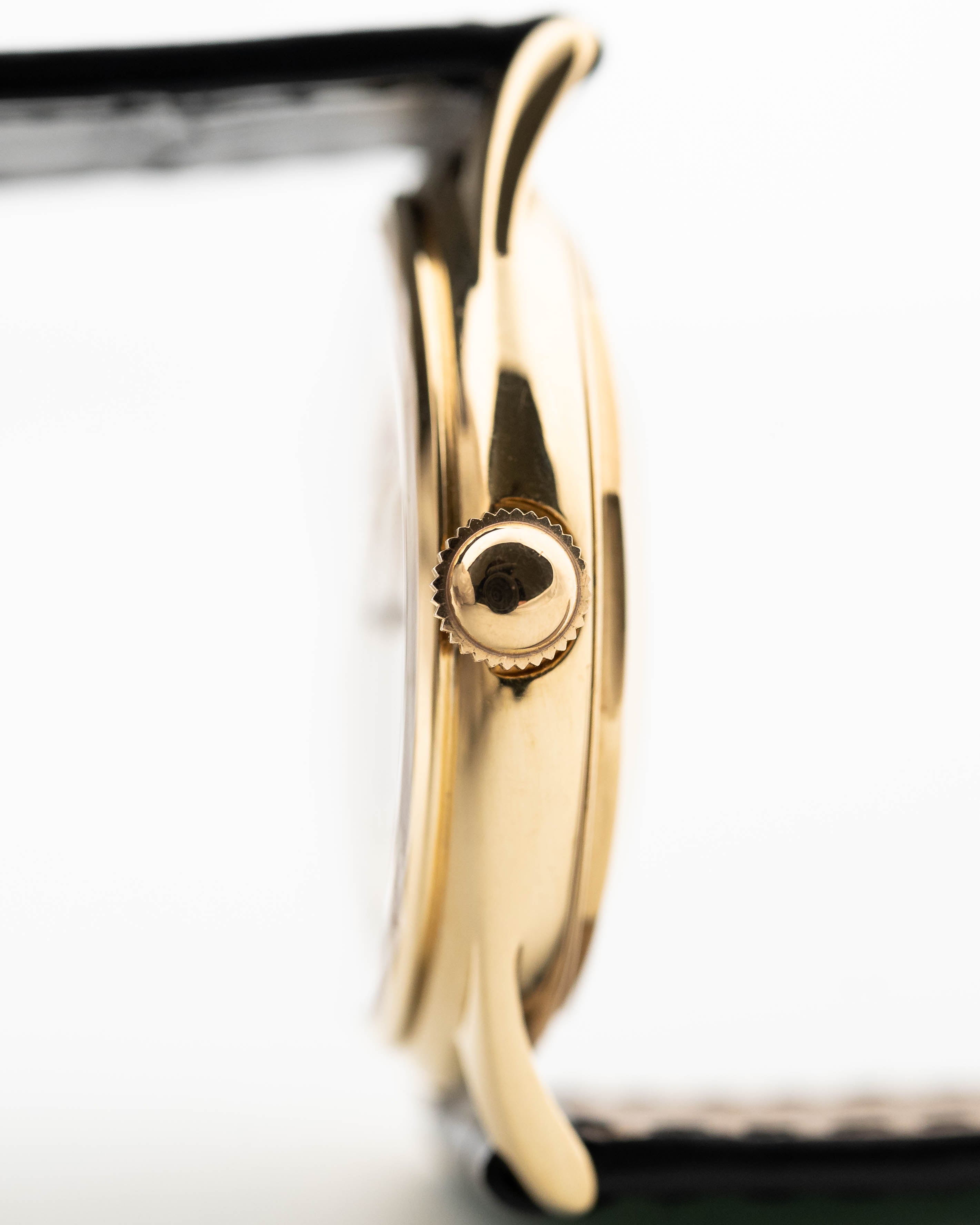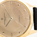 لدينا هنا نموذج جميل لساعة فاشرون كونستانتين الأوتوماتيكية من الذهب الأصفر عيار ٣٥ مم من خمسينيات القرن العشرين. تتميّز هذه القطعة بميناء جميل ودافئ بلونين كريمي مع علامات ساعات وعقارب من الذهب الأصفر.