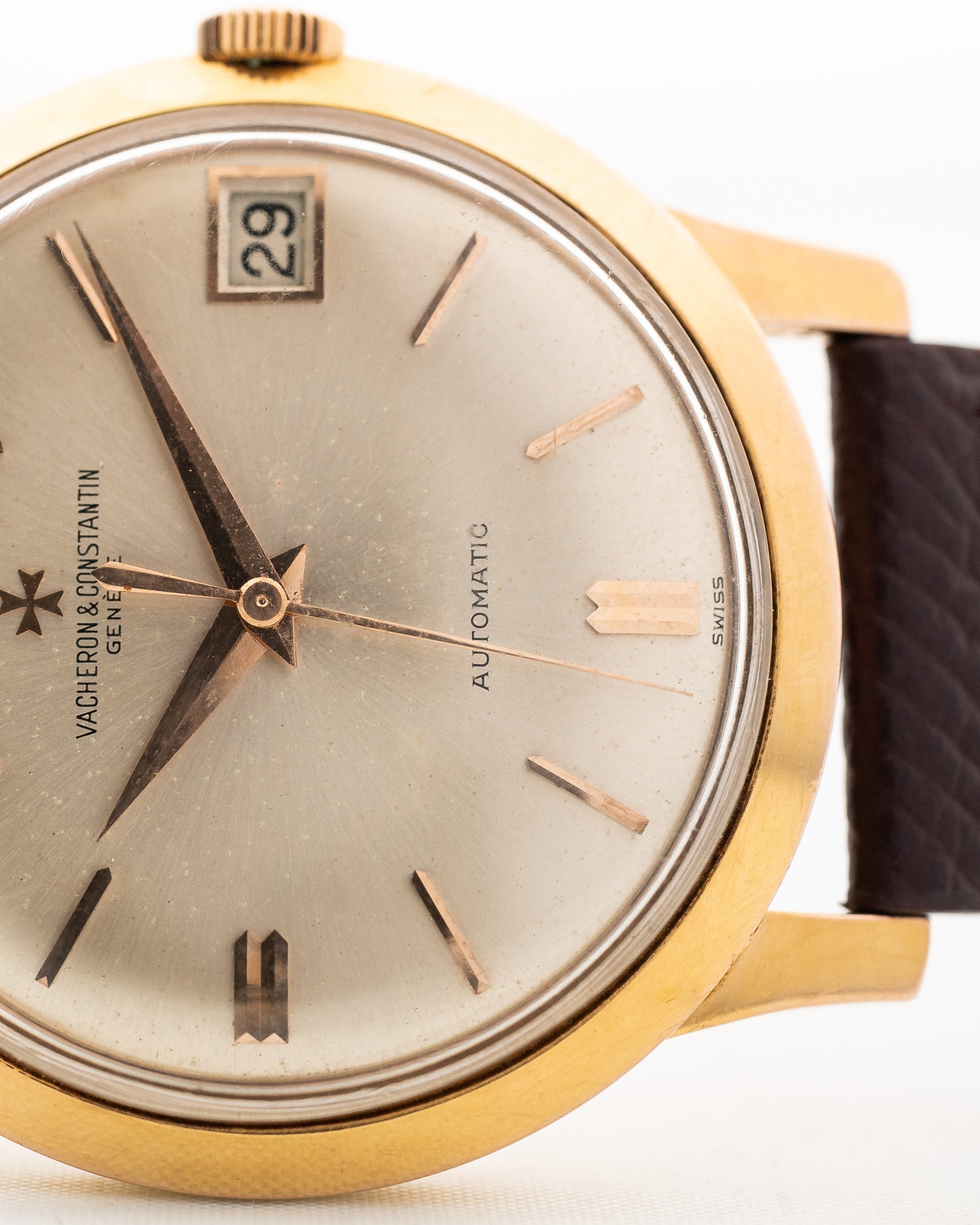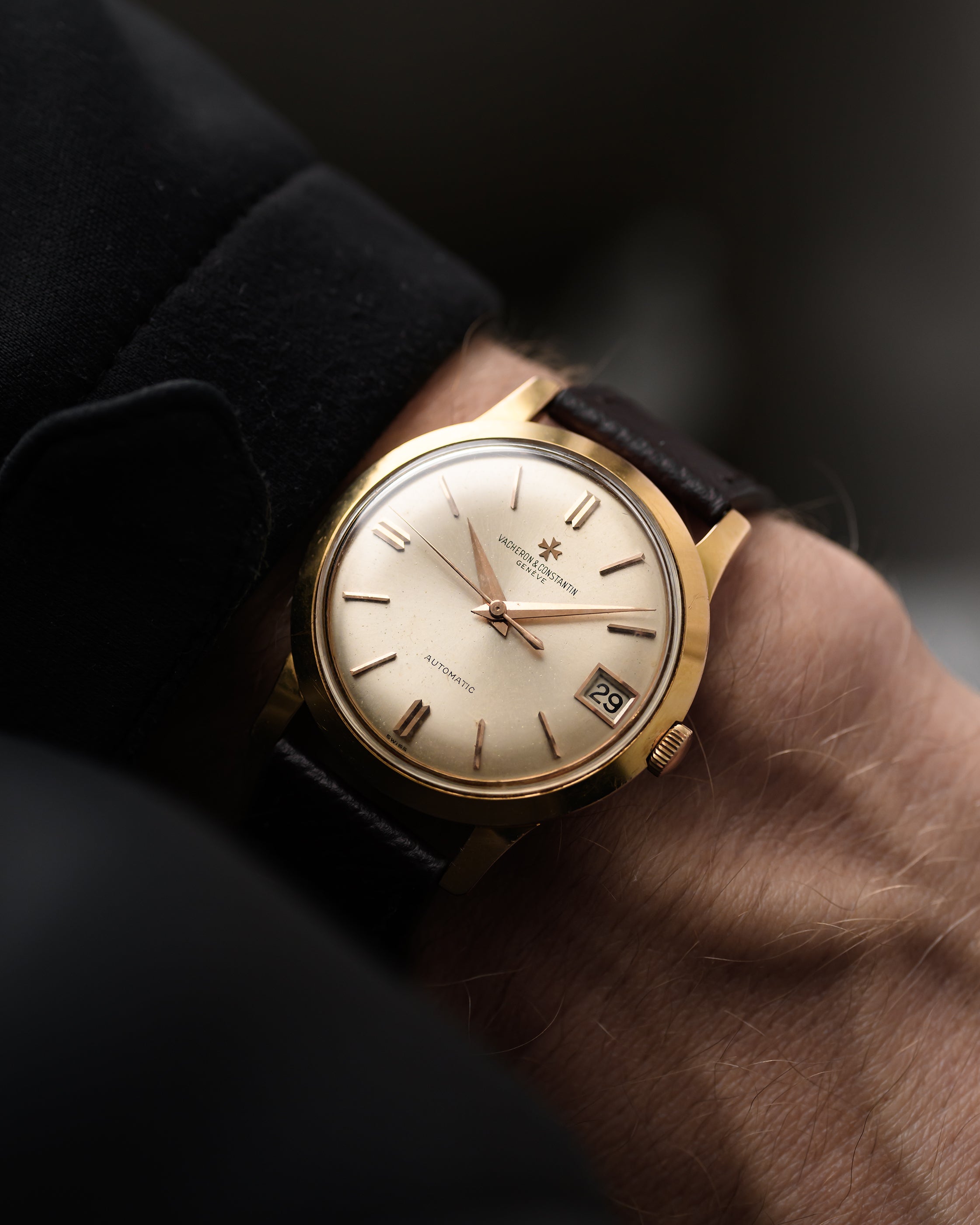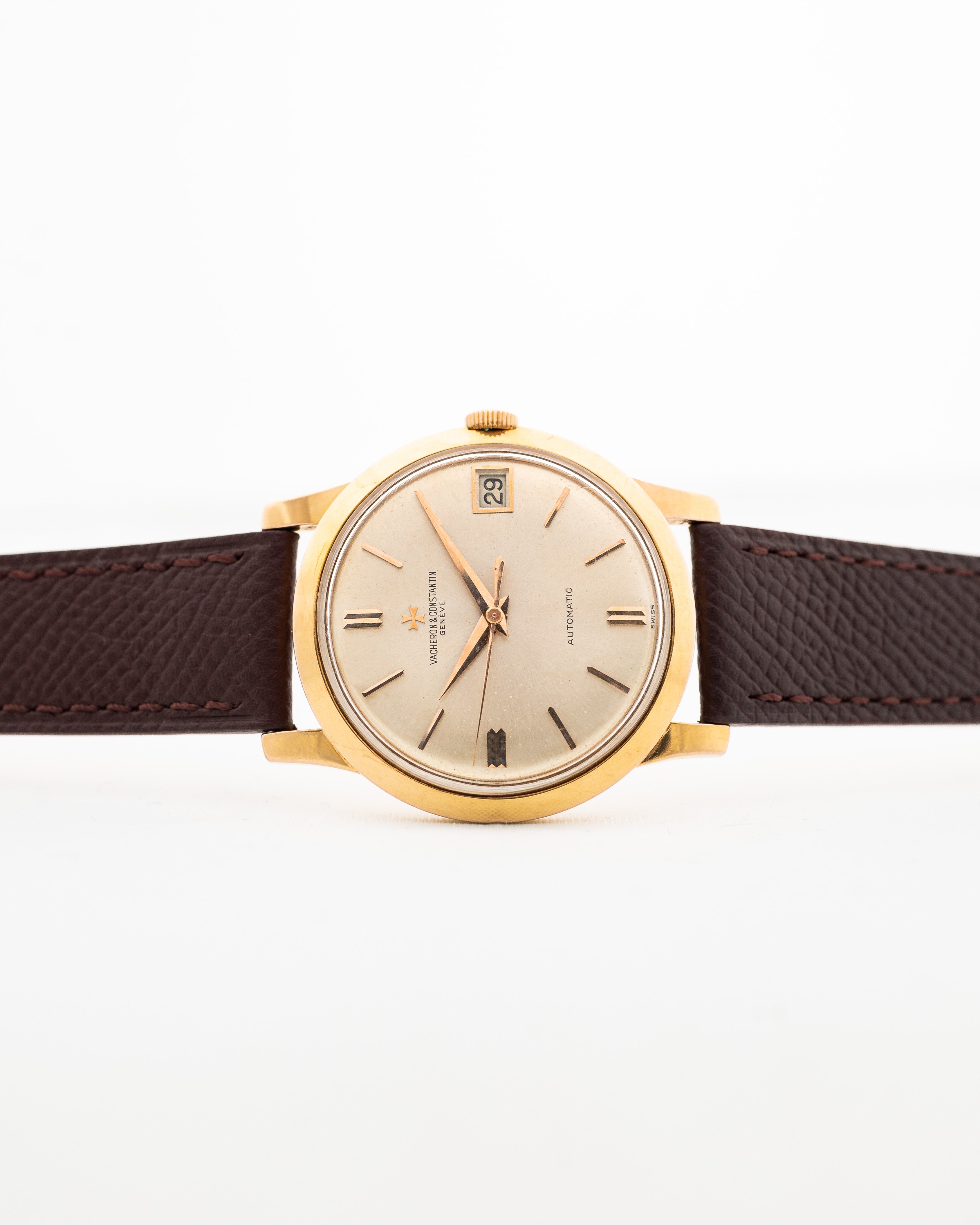 لدينا هنا مثال جميل لساعة ڤاشرون كونستانتين من الذهب الوردي عيار ٣٥,٥ مم من ڤاشرون كونستانتين المرجع. 6378 Q الأوتوماتيكية من ستينيات القرن الماضي. تحتوي هذه القطعة على مينا فضي اللون مع علامات ساعات من الذهب الوردي وعقارب دوفين من الذهب الوردي. ونادرًا ما نرى الاهتمام بتفاصيل علامات الساعات وأناقة المينا الأنيق الذي يتّسم بالأناقة في الميناء النظيف. تُعدّ هذه الساعة مثالاً كلاسيكياً لساعة فستان VC ذات مؤشرات بسيطة للساعات والدقائق والثواني وعلبة من عيار 18 قيراطاً من عيار فينجر.