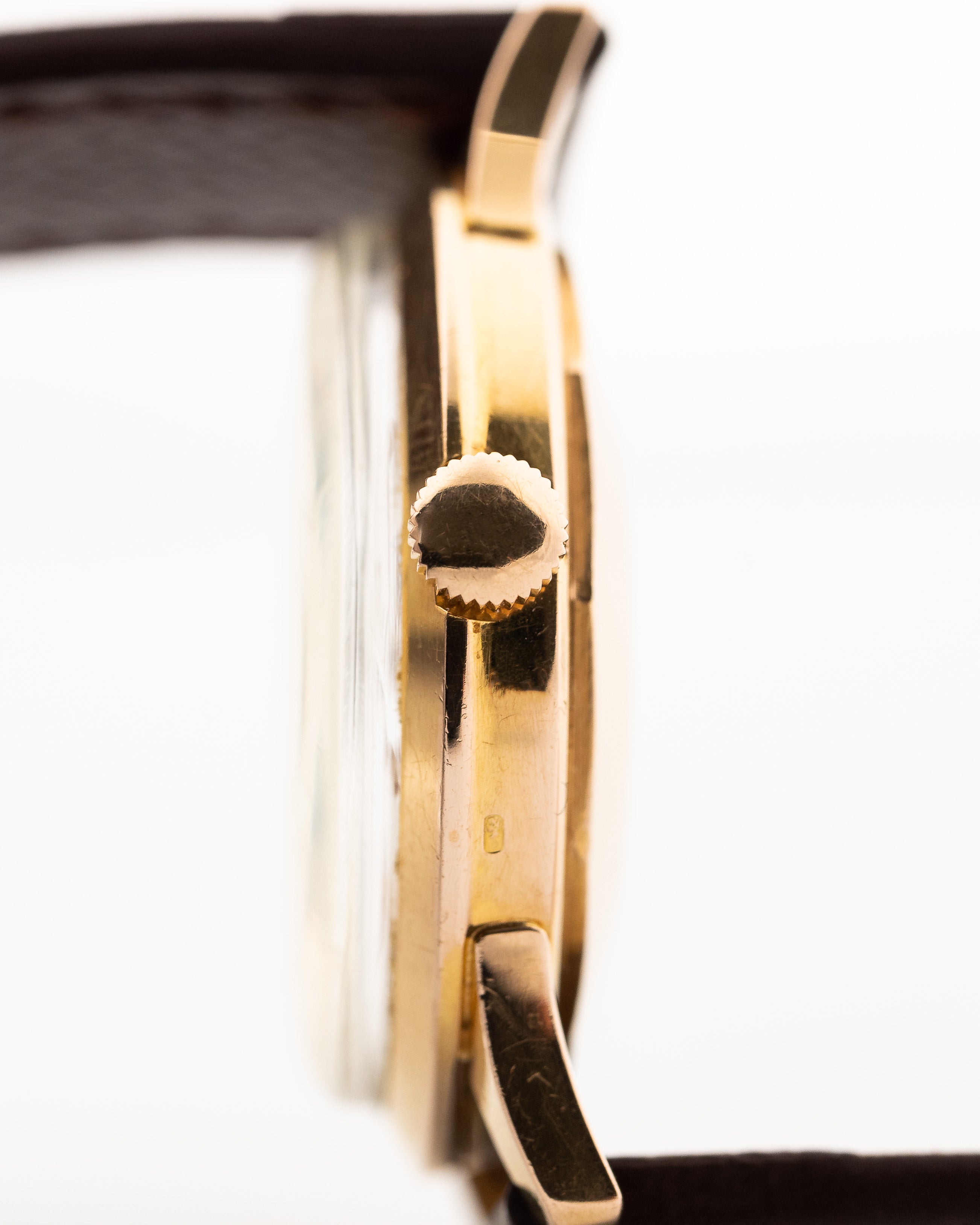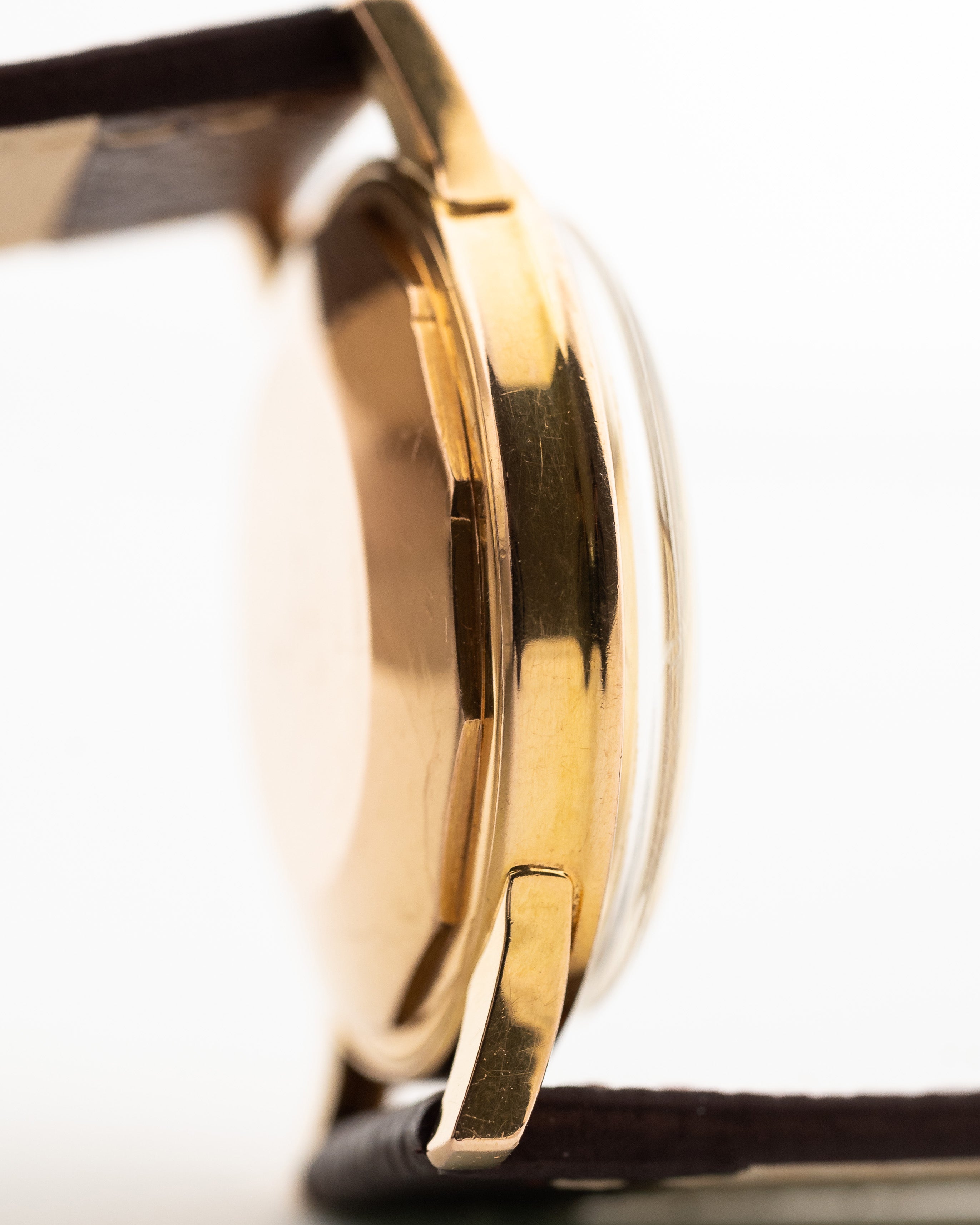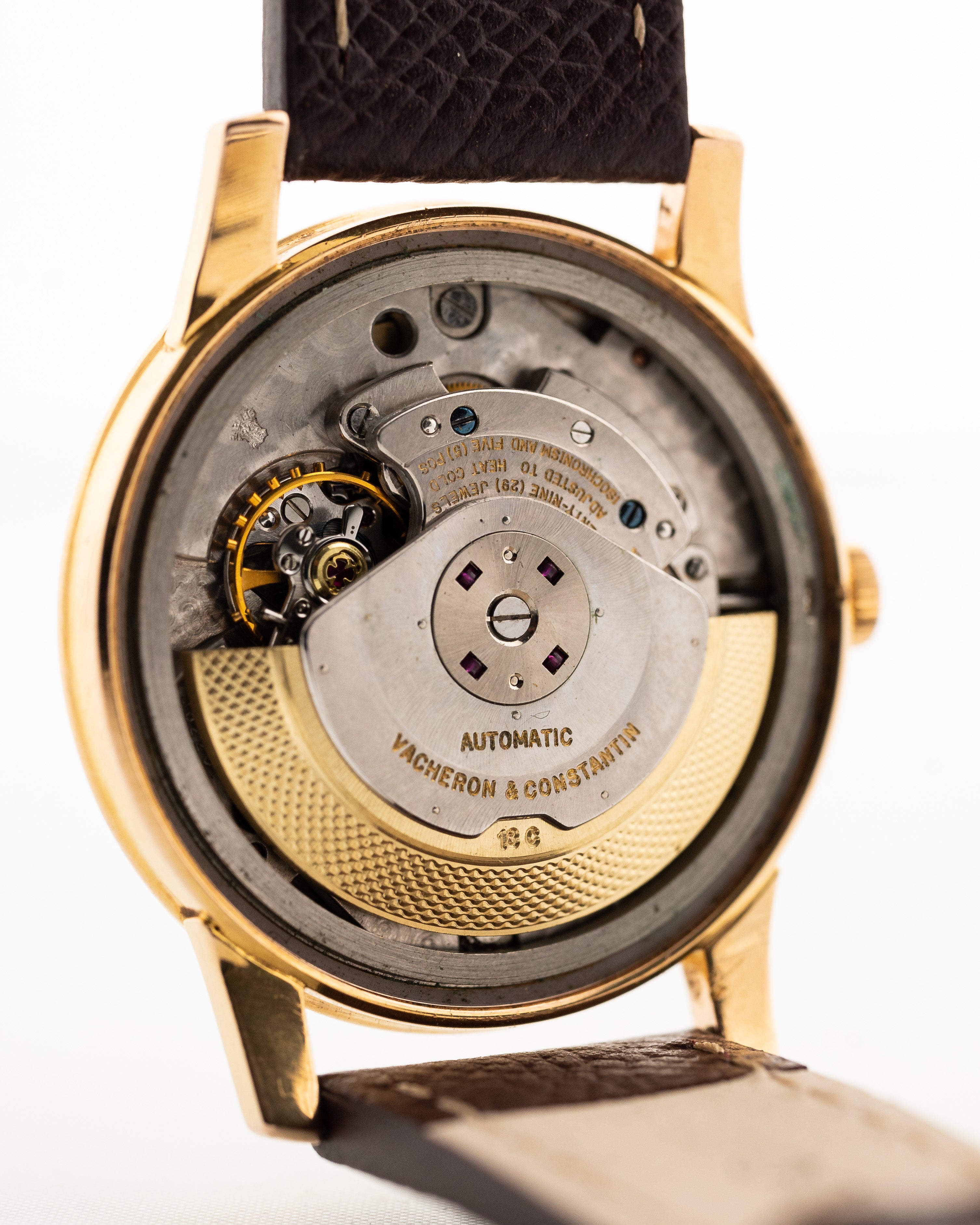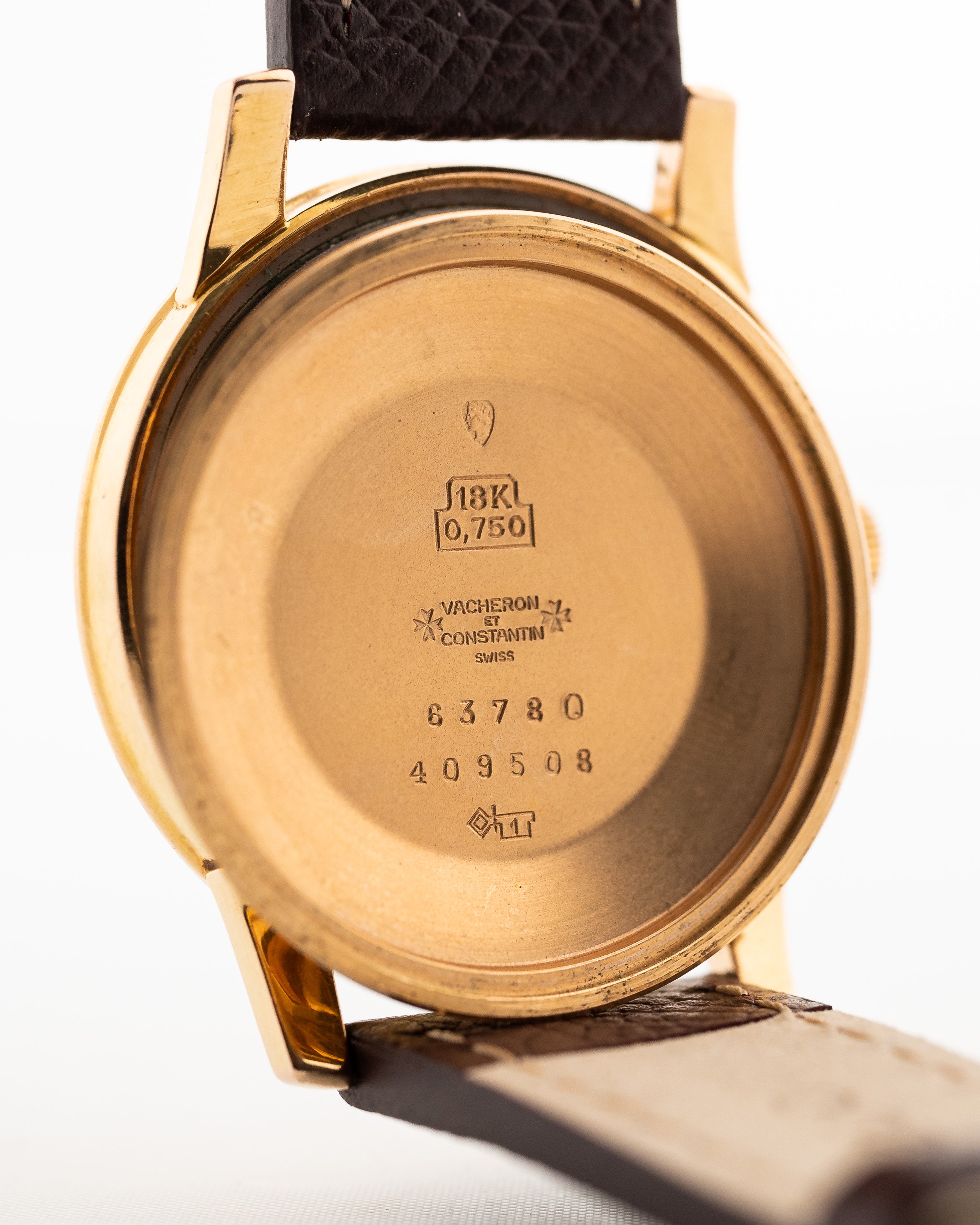 لدينا هنا مثال جميل لساعة ڤاشرون كونستانتين من الذهب الوردي عيار ٣٥,٥ مم من ڤاشرون كونستانتين المرجع. 6378 Q الأوتوماتيكية من ستينيات القرن الماضي. تحتوي هذه القطعة على مينا فضي اللون مع علامات ساعات من الذهب الوردي وعقارب دوفين من الذهب الوردي. ونادرًا ما نرى الاهتمام بتفاصيل علامات الساعات وأناقة المينا الأنيق الذي يتّسم بالأناقة في الميناء النظيف. تُعدّ هذه الساعة مثالاً كلاسيكياً لساعة فستان VC ذات مؤشرات بسيطة للساعات والدقائق والثواني وعلبة من عيار 18 قيراطاً من عيار فينجر.