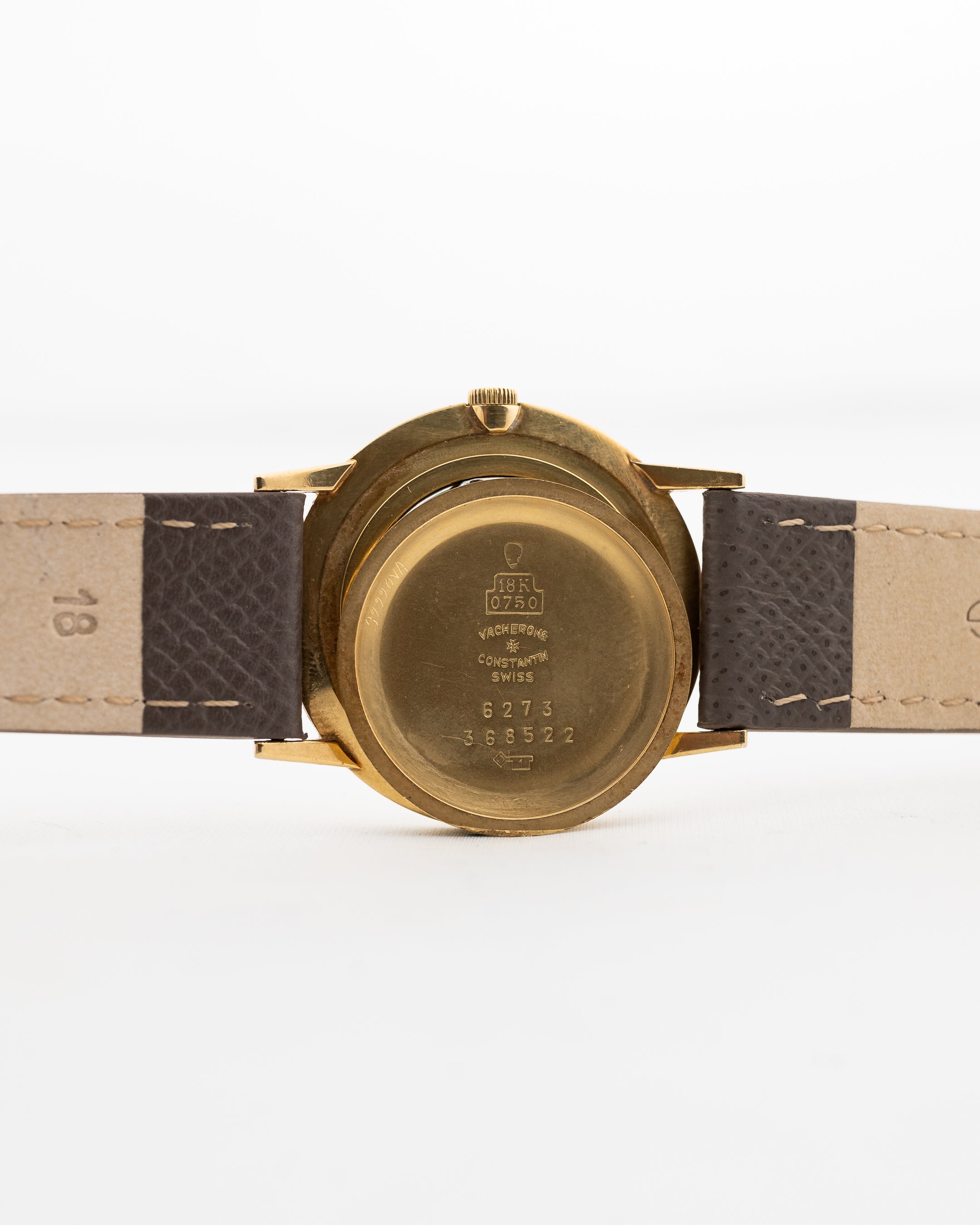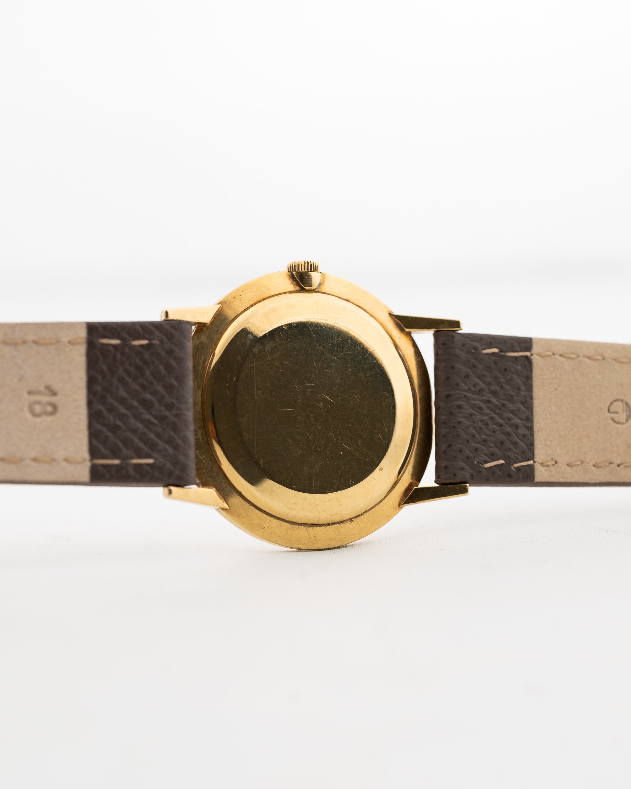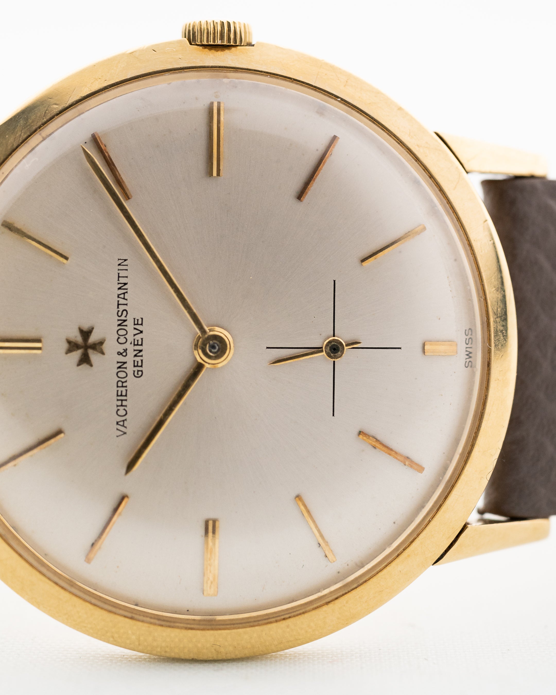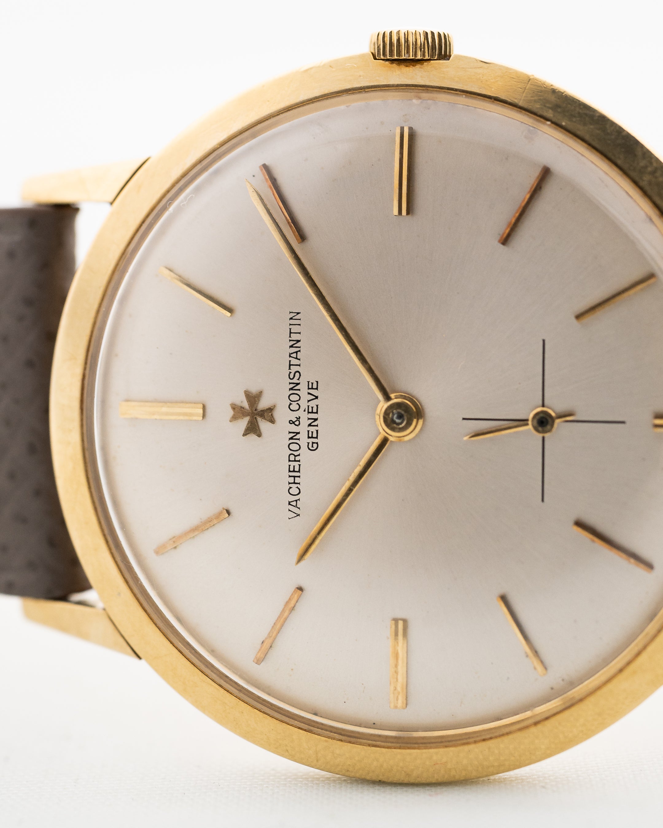 لدينا هنا ساعة فساتين ڤاشرون كونستانتين من الذهب الأصفر عيار ١٨ قيراطًا من ستينيات القرن الماضي. وتتميز هذه القطعة بالذات بميناها الفضي الجميل الذي يتميز بمظهره الفضي المنفوخ، وشعار فاشرون المطبوع، وثوانٍ فرعية نظيفة وعلبة قوية من الذهب الأصفر عيار ١٨ قيراطًا غير مصقولة.