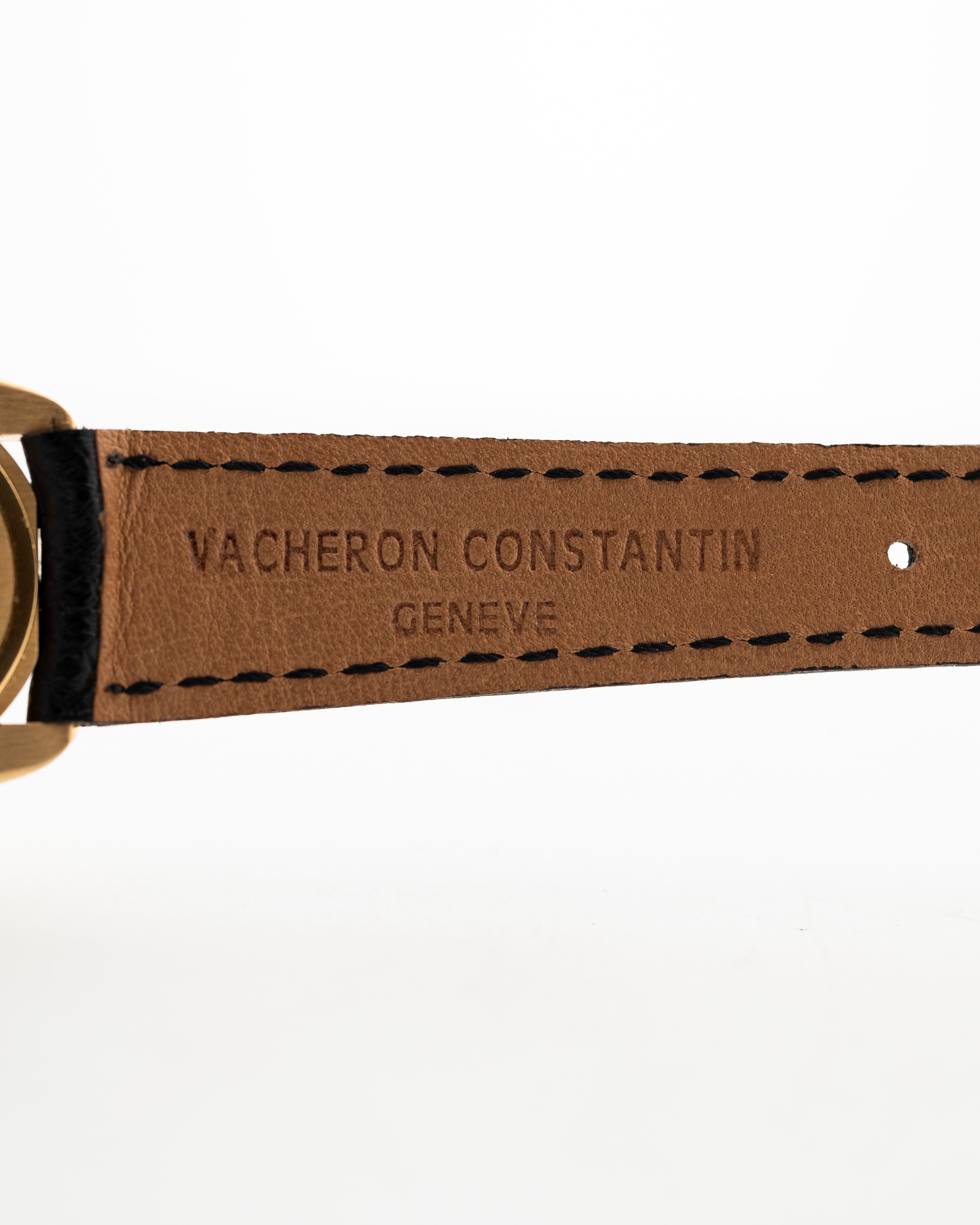تم تشطيب ساعتنا من عام 1996 بشكل جميل في علبة من الذهب الأصفر عيار 18 قيراطًا وتتميز بمينا سيغما أبيض/فضي عيار 18 قيراطًا وشعار فاشرون المطبوع وهيكل كتاني رائع في منتصف الميناء.