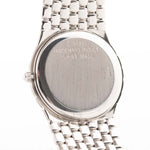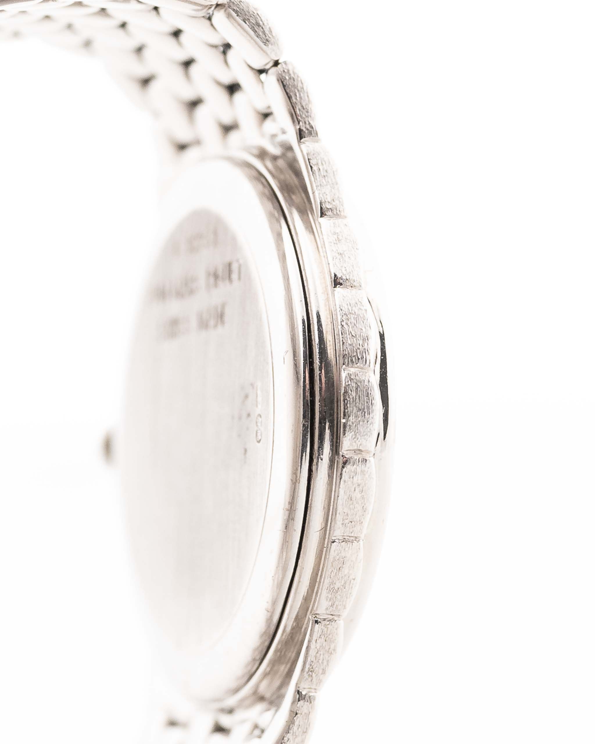 تقترنالعلبة المصنوعة من الذهب الأبيض عيار 18 قيراطًا بقطر 31ملم بسوار ذهبي متكامل مصنوع يدويًا بدقة متناهية، مما يمنح الساعة انسيابيتها المميزة التي تشبه ثعبانًا — شكل يبدو وكأنه ينزلق بسهولة على المعصم. الميناء الأسود، الذي يتلألأ تحت زوايا إضاءة مختلفة، مزين بـ 12 علامة ساعة مرصعة بالماس في المصنع، مما يضفي رفاهية هادئة على طابعه البسيط.