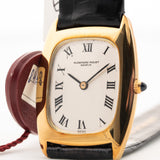 لدينا هنا ساعة أوديمار بيغيه من الذهب الأصفر عيار 18 قيراطاً من الذهب الأصفر عيار 18 قيراطاً بتصميم بيضاوي على شكل وسادة من سبعينيات القرن الماضي.