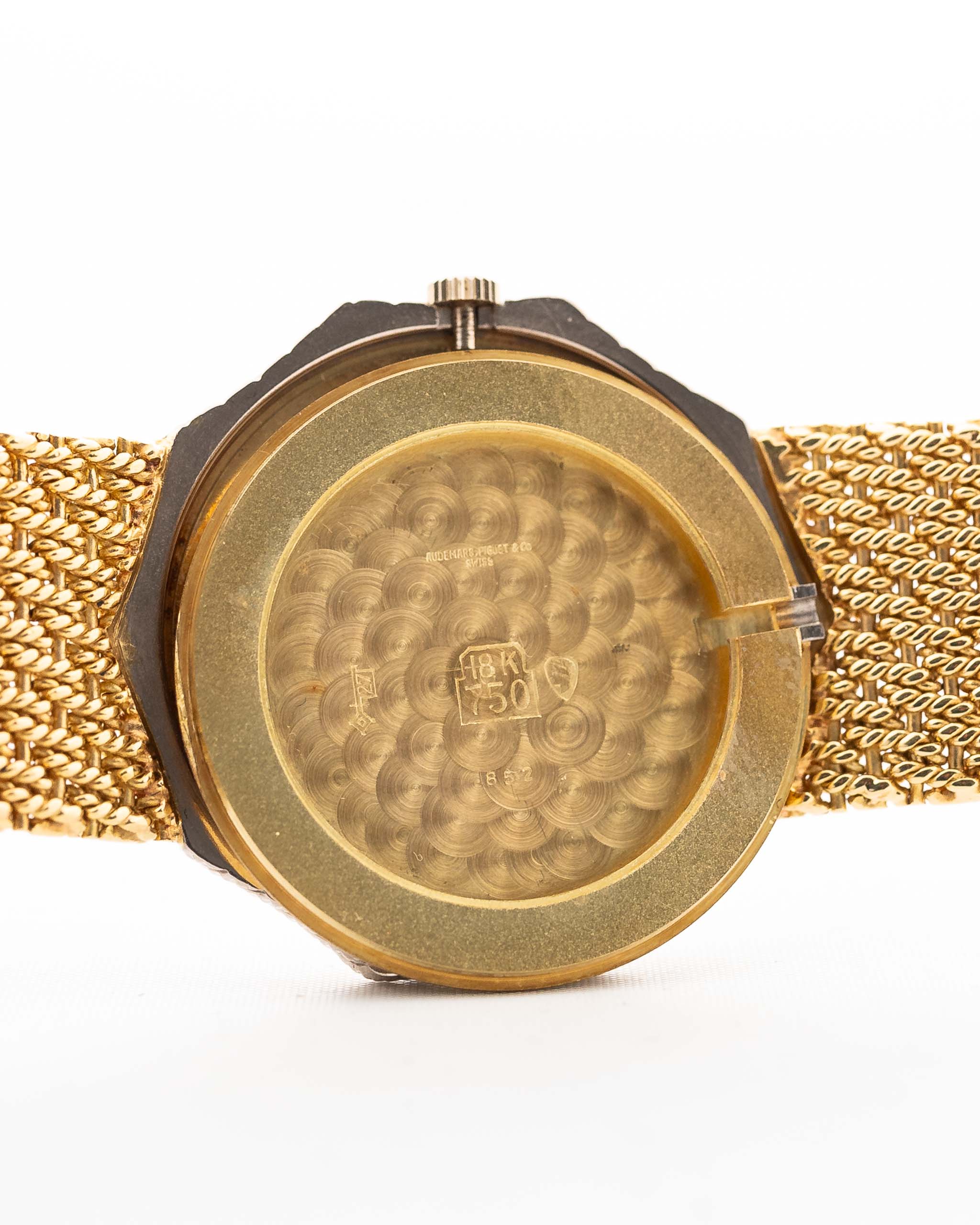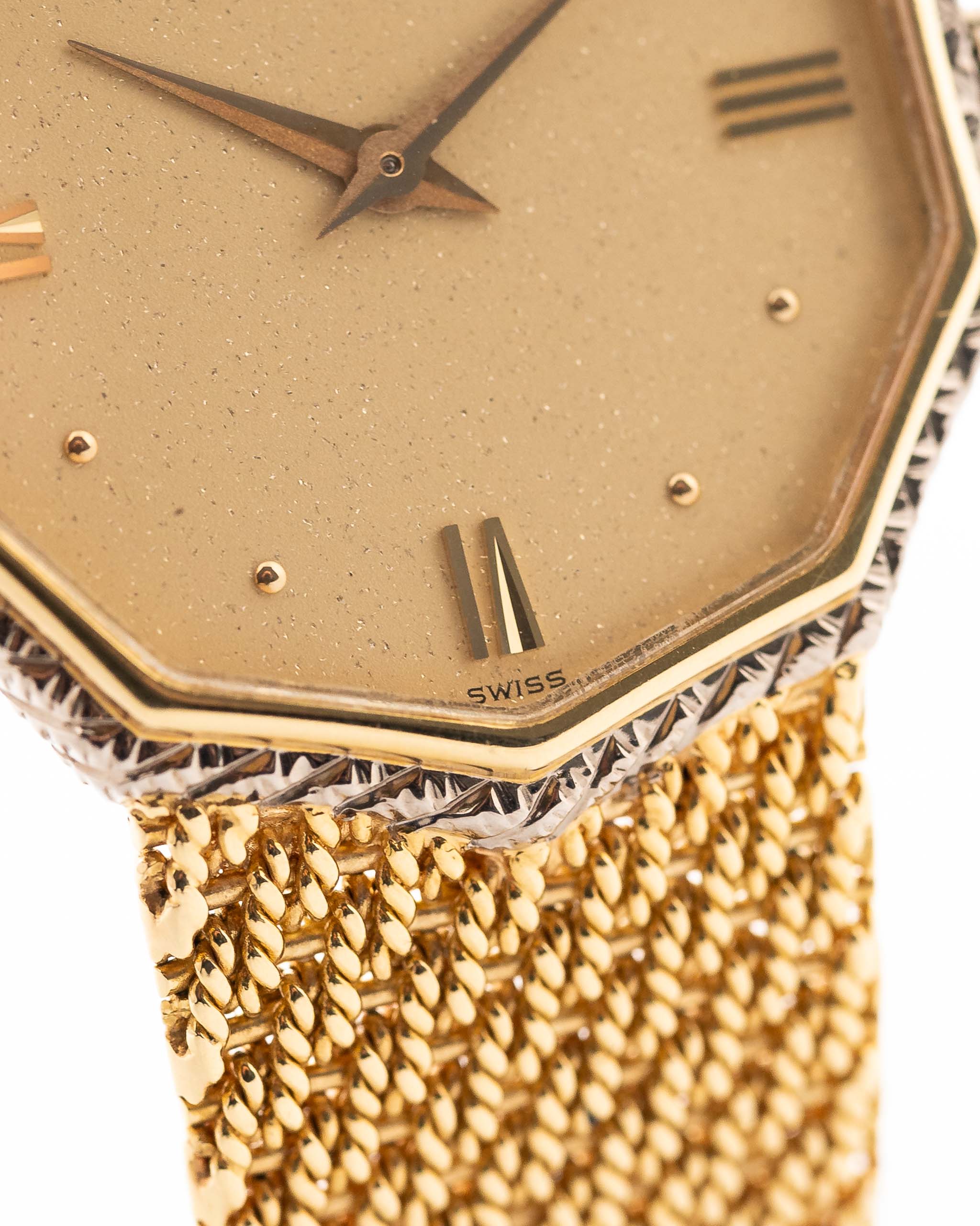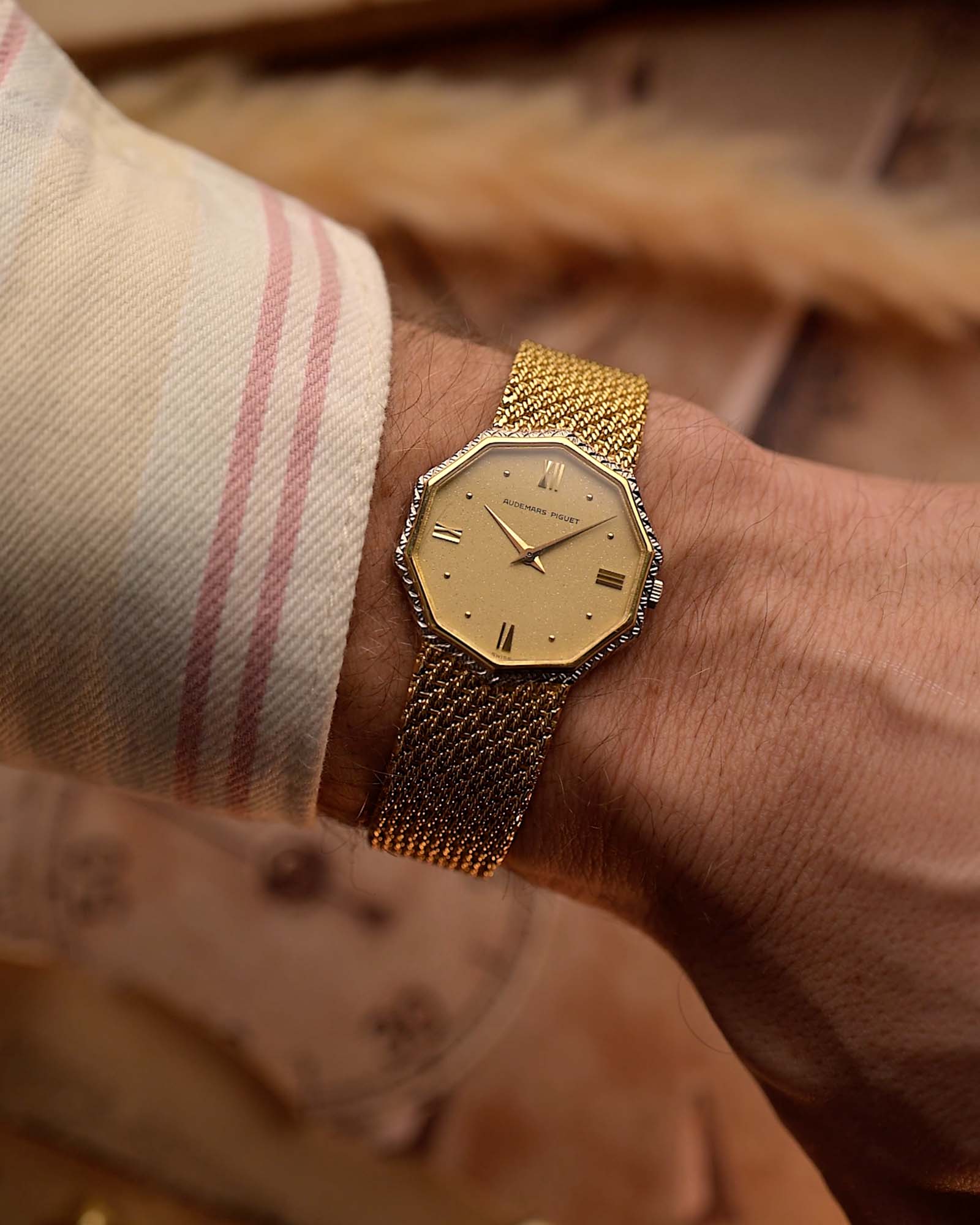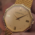 ساعة Audemars Piguet نادرة ومذهلة من أوائل الثمانينيات، تتميز بعلبتها الثماني الأضلاع المميزة وتفاصيلها الأنيقة ذات اللونين. صُنعت الساعة من الذهب الأصفر عيار 18 قيراطًا، وتتميز بمينا ذهبي لامع خالٍ من العيوب يحمل شعار AP وأرقام رومانية عند الساعات 12 و3 و6 و9، ومؤشرات ألفا أنيقة.
