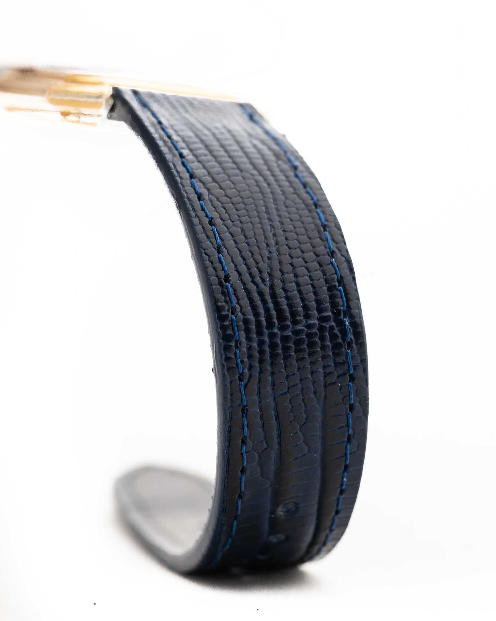 يكتمل الميناء الأبيض MK3، الذي لم يمسه أي تغيير مع لمسة من الباتينا اللطيفة، بعقارب كلاسيكية من الفولاذ المزرق وتاج يحمل توقيع كارتييه، مما يحافظ على لغة التصميم الأيقونية للدار. مصنوع من الذهب الأصفر عيار 18 قيراطًا وفي حالة ممتازة، إنه تعبير عن الدقة والأناقة الباريسية.