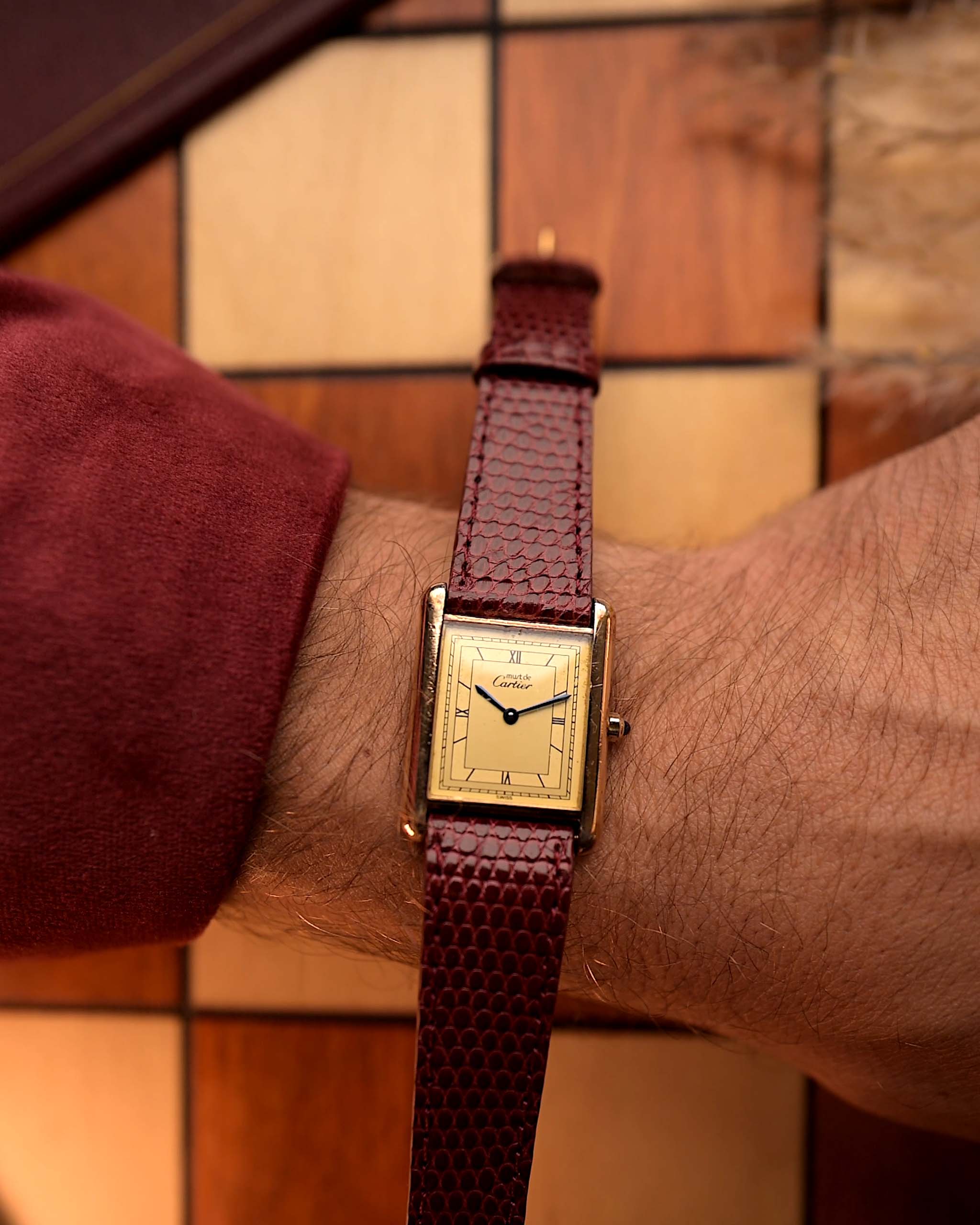 This reference 81006, from the Must de Cartier line, captures that legacy with vintage charm. Its 925 sterling silver case, plated in yellow gold (vermeil), houses a two-tone champagne dial with elegant Roman numerals and blued sword hands — a combination that evokes classic Parisian sophistication. The red Cartier leather strap adds a bold yet refined finishing touch.