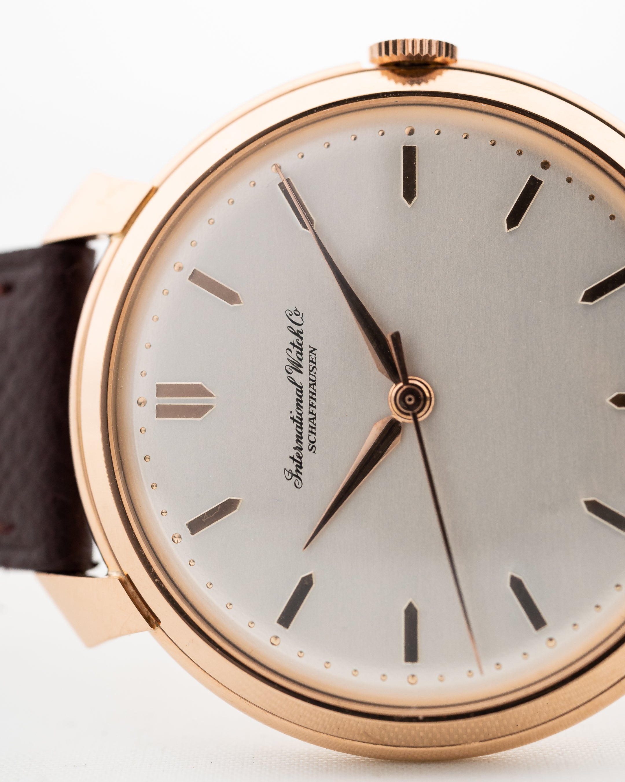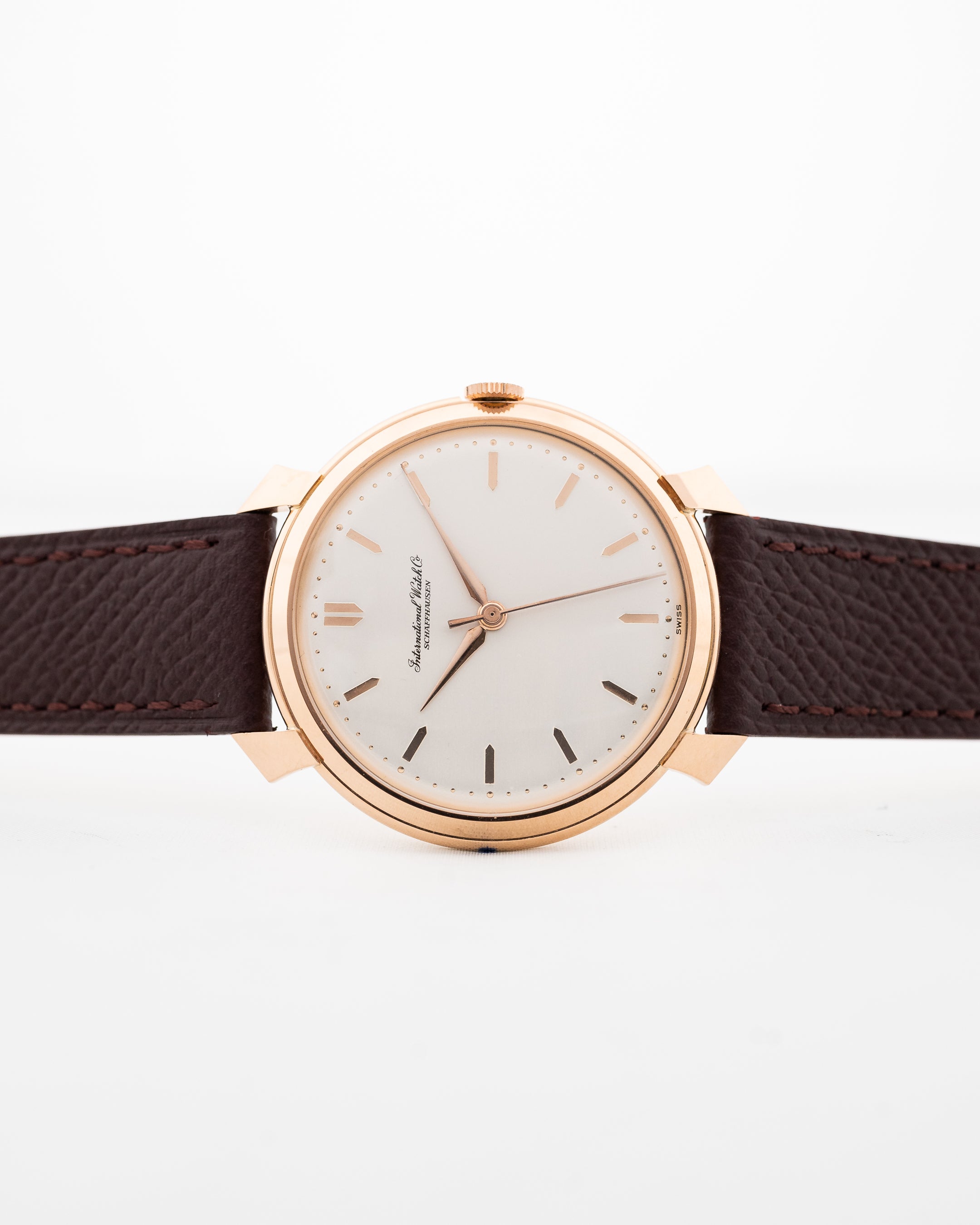 أنتجت IWC مجموعة واسعة جدًا من ساعات اليد منذ وقت مبكر بدءًا من ساعات الملابس إلى ساعات الطيران. سيظل هذا النموذج، المصنوع من الذهب الوردي عيار 18 قيراطًا مع عروات زعنفة القرش، من الساعات الثابتة في مجموعات أي شخص، خاصةً أنها تأتي بحالة NOS والأوراق الأصلية.