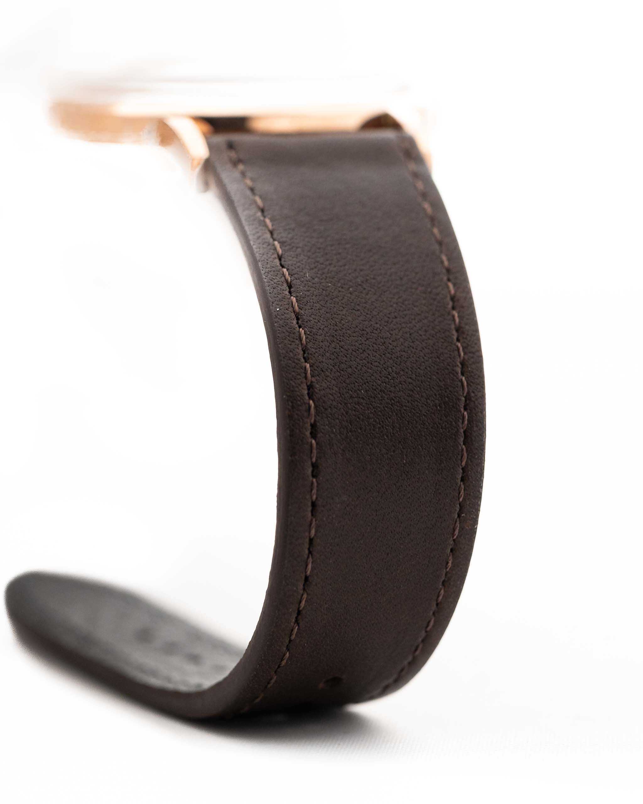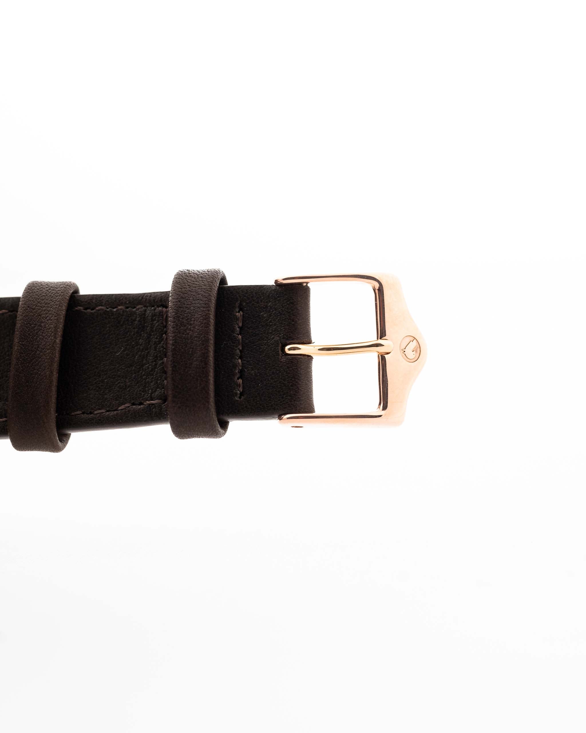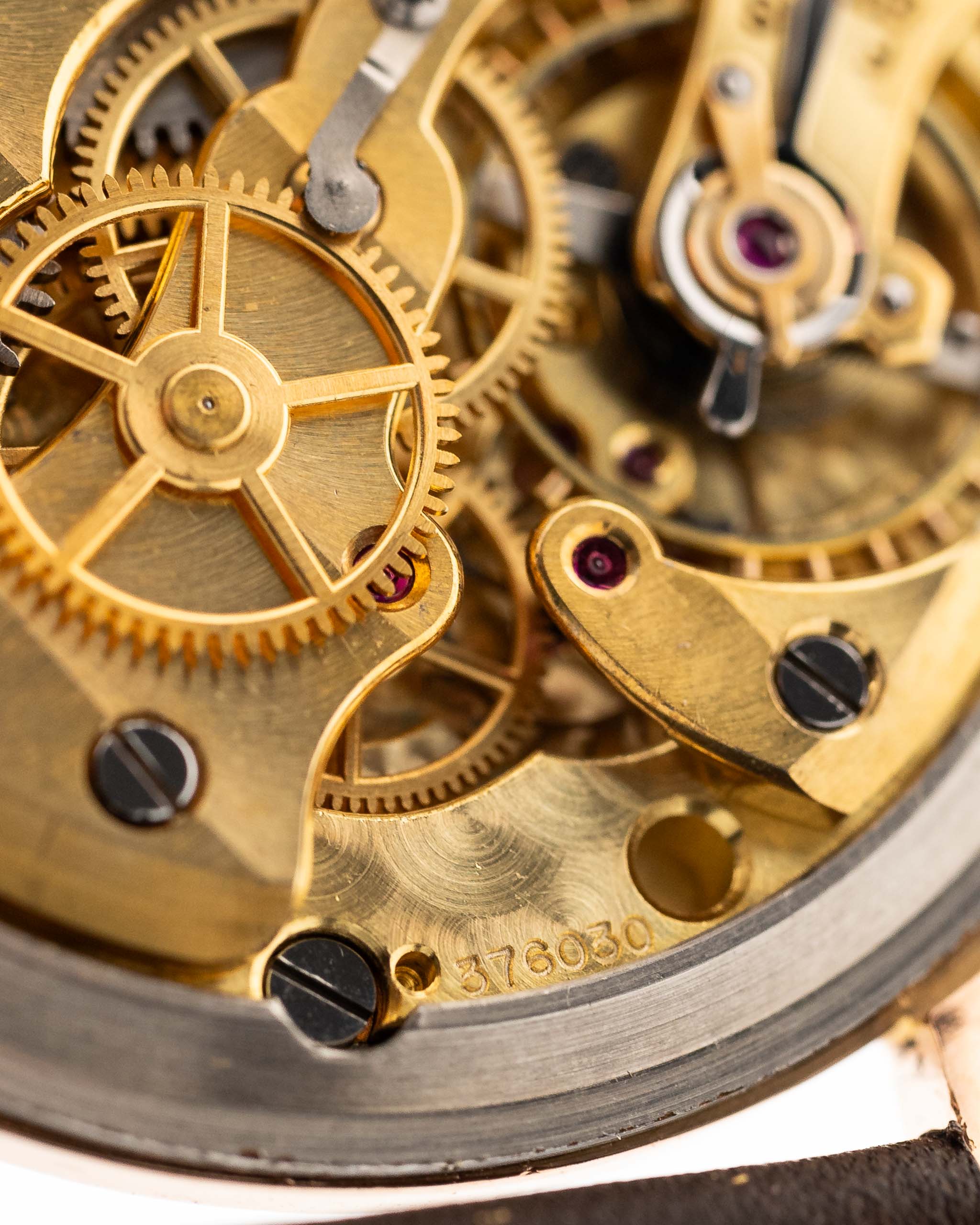 Crafted in 18k rose gold, the case features subtle, slightly downturned lugs and a warm glow that contrasts beautifully with the soft cream dial. A railroad minute track encircles the dial for balanced visual structure, while the gentle pie-pan profile and aged patina speak to decades of quiet, dignified aging.