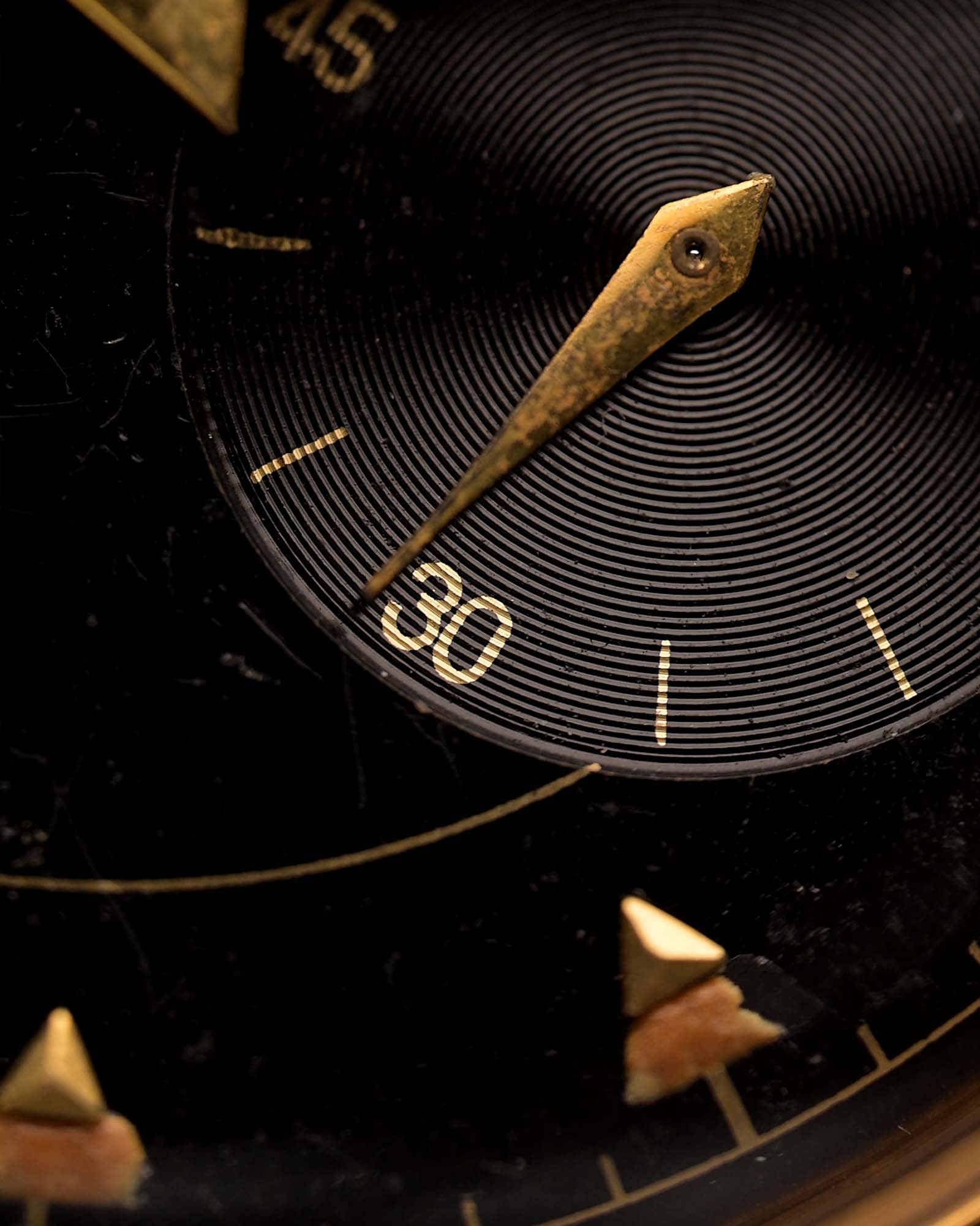 يتميز هذا النموذج بميناءه الأسود المذهل وعلاماته المطبوعة وعقرباته الأنيقة على شكل دوفين — وهو تعبير صادق عن الجماليات الحديثة في منتصف القرن. تضفي العلبة المطلية بالذهب الأصفر حضوراً قوياً على المعصم مع الحفاظ على أناقتها وقابليتها للارتداء.