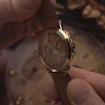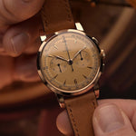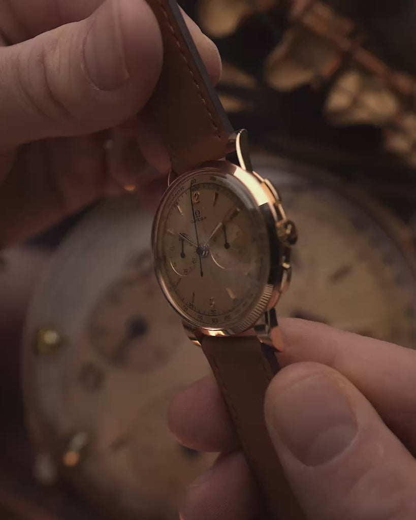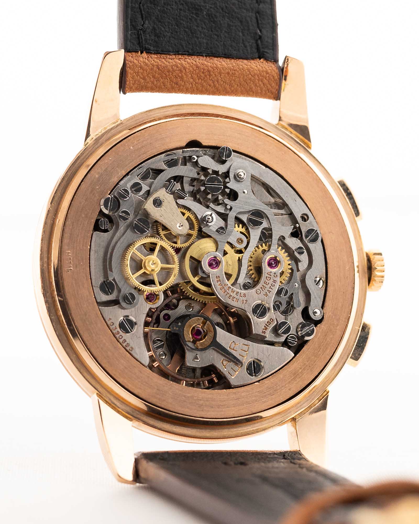 جوهرة حقيقية لهواة جمع الساعات من العصر الذهبي للكرونوغرافات — ساعة أوميغا كرونوغراف كال. 320 جامبو من الذهب الوردي عيار 18 قيراط.