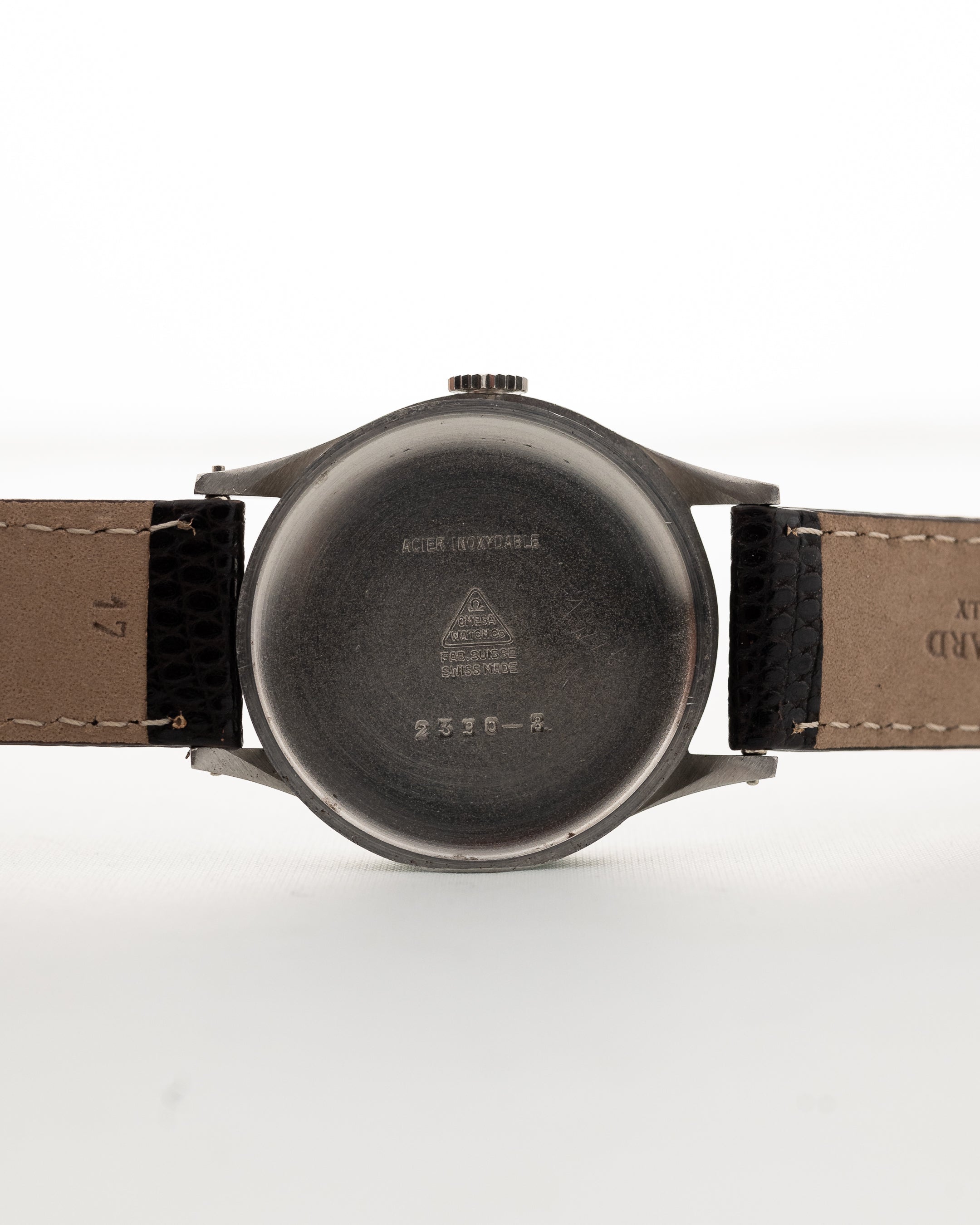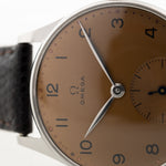 يمكنك أن ترى هنا ساعة فستان رائعة صنعتها أوميغا عام 1947. تتميز بعلبة مقاس 33 مم مصنوعة من الفولاذ المقاوم للصدأ مع عروات رقيقة وبسيطة بزاوية مائلة وميناء كابتشينو مذهل في حالة لا تشوبها شائبة وعقارب من الفولاذ المقاوم للصدأ على شكل أوراق، وهي قطعة تخطف الأنفاس.