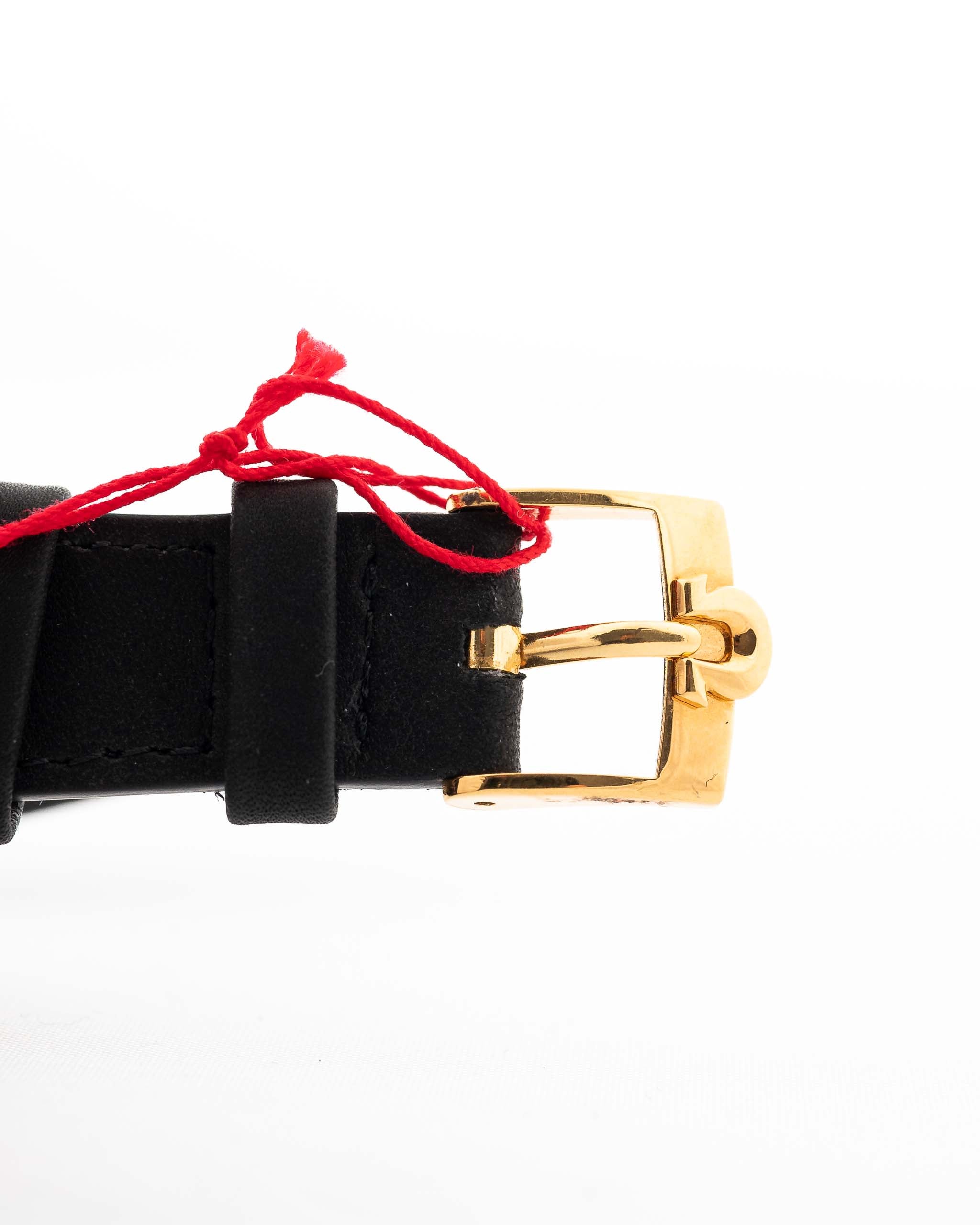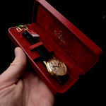تأتي ساعتنا الخاصة بعلبة مصنوعة من الذهب الأصفر بقطر 34.5 مم وعروات مشطوفة. وتكمل اللمسات مثل عقارب ألفا الذهبية الرائعة وعلامات الساعات المظهر الأنيق لهذه القطعة.