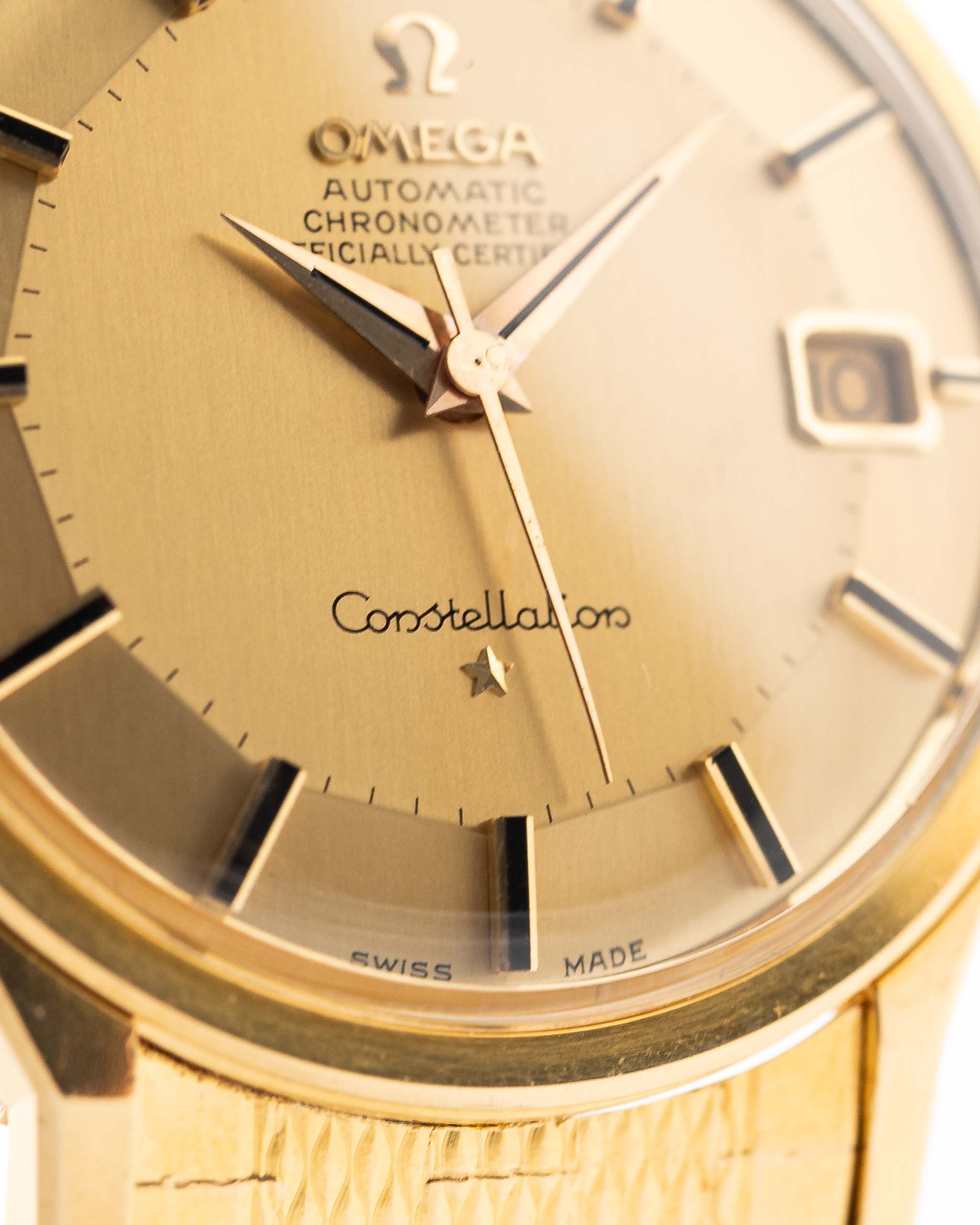 يُعدّ تصميم ساعة كونستيليشن وليمة للعيون في جميع العقود والمراجع، ولكن لساعات الخمسينيات تأثير خاص جدًا على قلوب هواة جمع الساعات: فالميناء الذهبي ذو المربعات الذهبية المقترن بمؤشرات رأس السهم مع سوار D'Agosto عيار 18 قيراطًا يجعل قلوبنا تنبض بسرعة أكبر. أُطلقت ساعة Constellation لأول مرة في عام 1952، وكانت ساعة Constellation هي رد أوميغا على ساعة رولكس ديت جست.