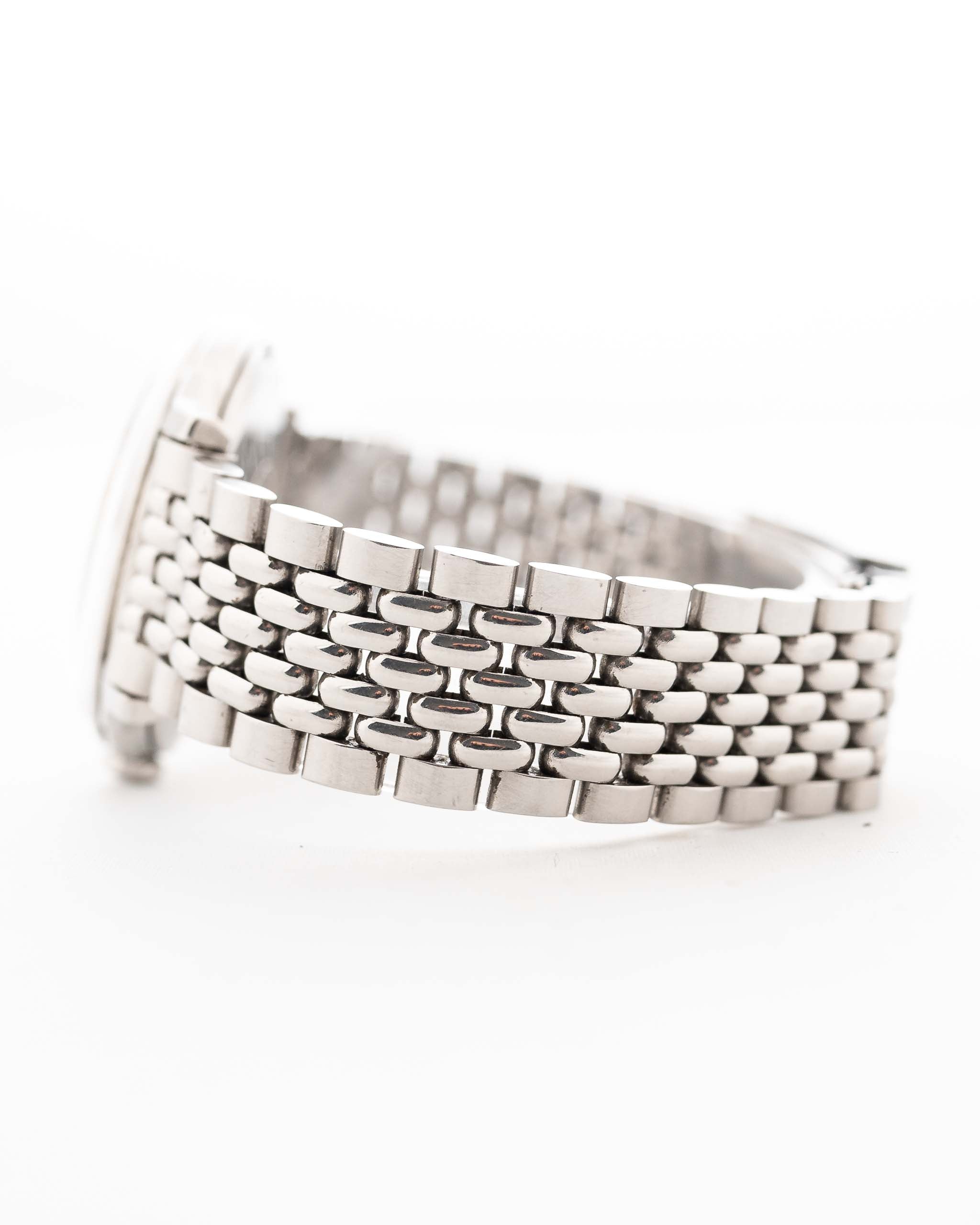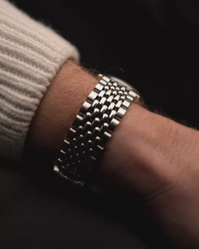 تجمع هذه الساعة التي تعمل بالعيار 561 الأوتوماتيكي المعتمد من الكرونومتر، بين الموثوقية والفخامة الهادئة. والأهم من ذلك كله: سوار "حبات الأرز" النادر والمطابق، لتكتمل القطعة برشاقة أوميغا المثالية.