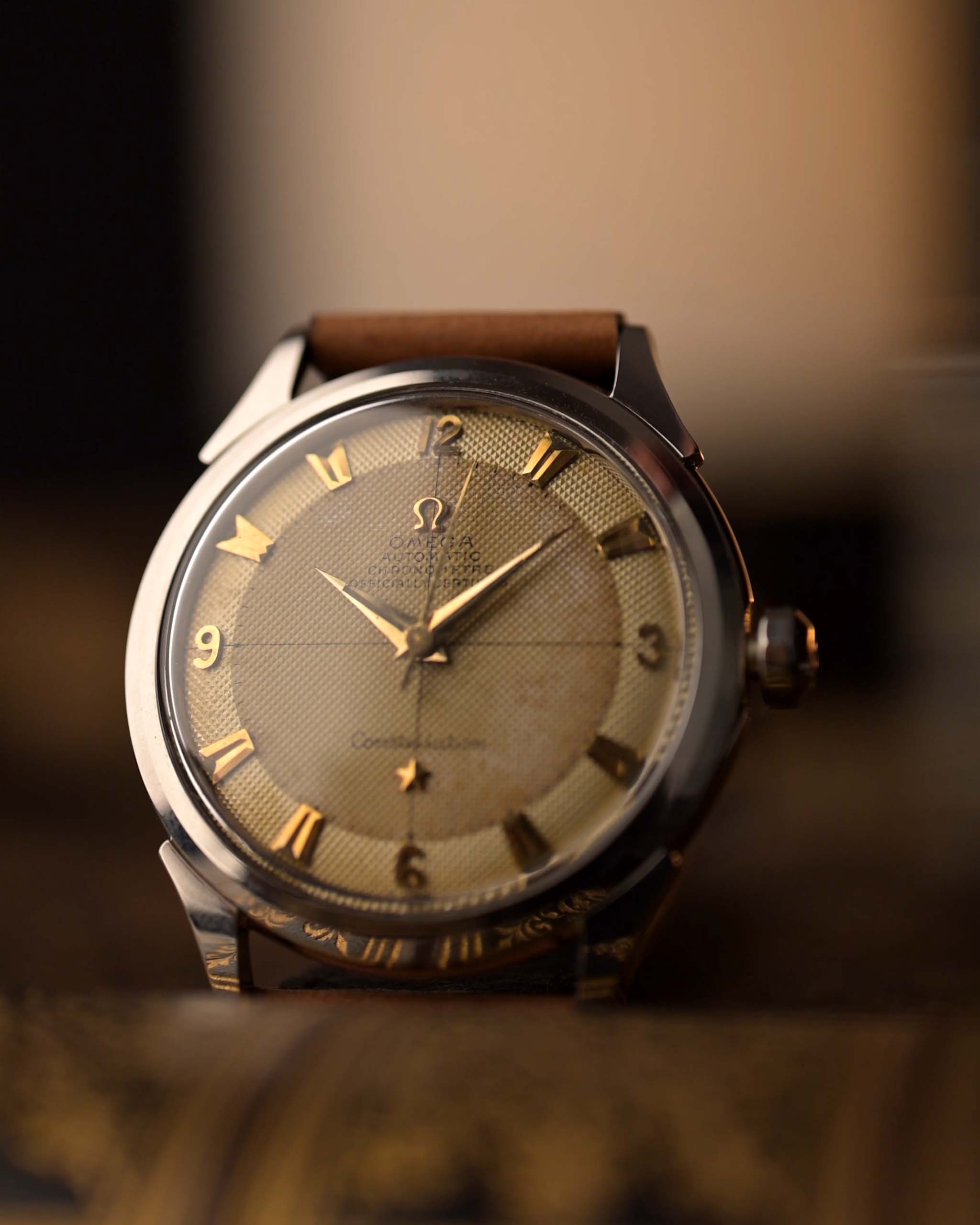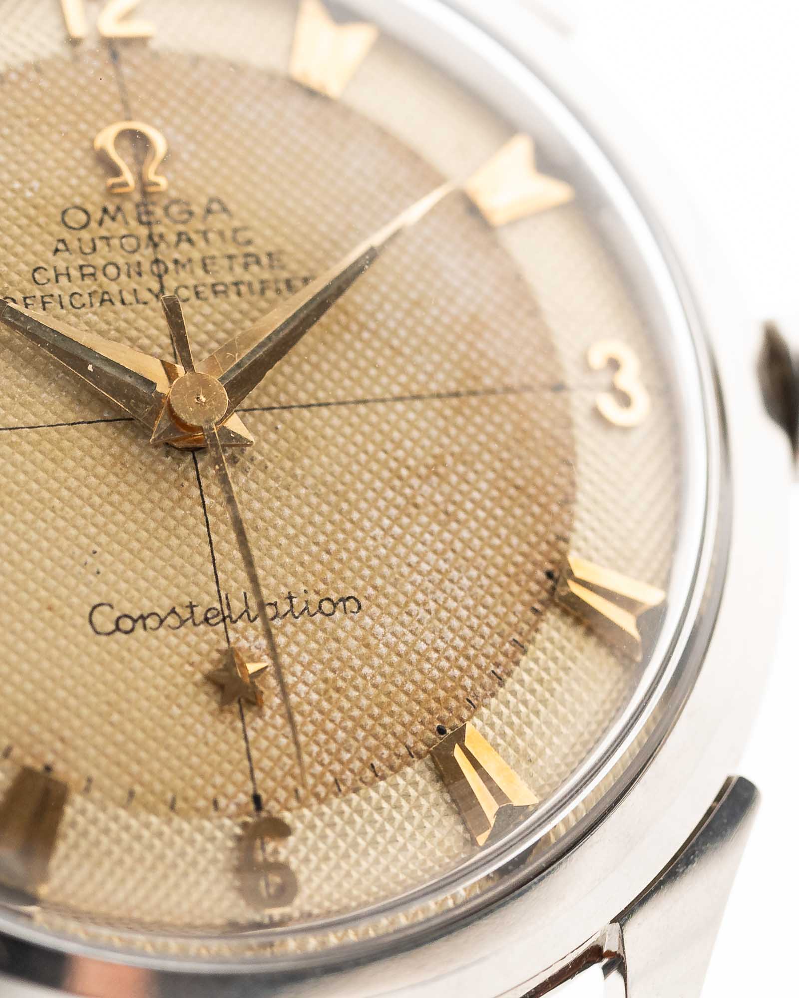 ساعة أوميغا كونستليشن مميزة للغاية من عام 1952، تمثل بداية خط ساعات الكرونومتر الأسطوري من أوميغا. تأتي هذه الساعة القديمة في علبة من الفولاذ المقاوم للصدأ قطرها 35 ملم، وتتميز بمينا نادر بلونين متقاطعين على شكل خلية نحل مع علامات ساعات ذهبية أنيقة — وهو تصميم نادر اليوم.
