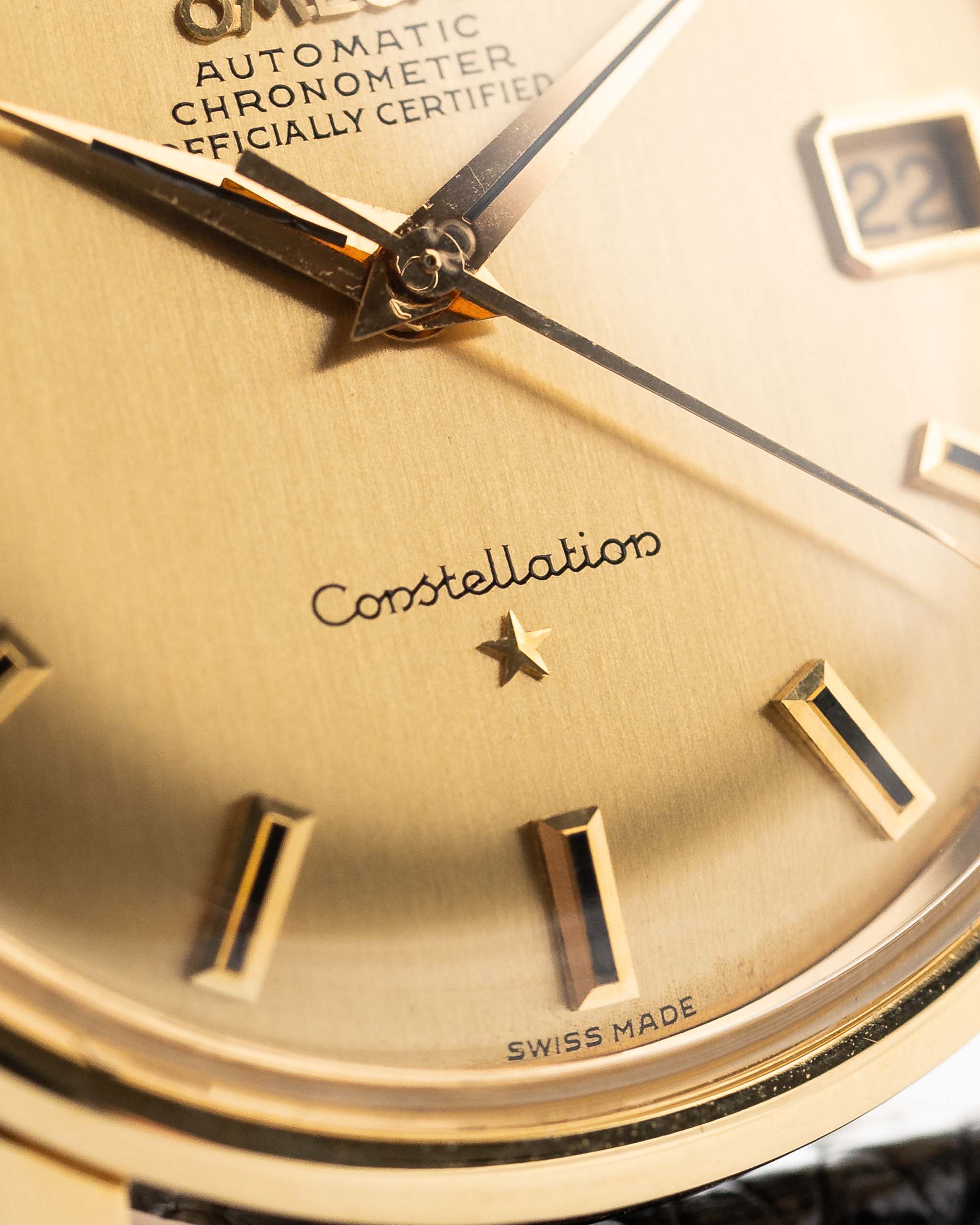 تحتوي ساعة أوميغا كونستيلايشن الكرونومتر الأوتوماتيكية المدمجة والجميلة هذه على كل ما تريده في ساعة فستان: علبة من الذهب الأصفر عيار 35 مم عيار 18 قيراطًا من الذهب الأصفر، وثوانٍ مركزية، وميناء ذهبي اللون جميل للغاية وعلامات ساعات رفيعة نادرة مع ترصيع من العقيق اليماني. أُصدرت ساعة كونستيليشن لأول مرة في عام 1952، وكانت ساعة كونستيليشن هي رد أوميغا على ساعة رولكس ديت جست.