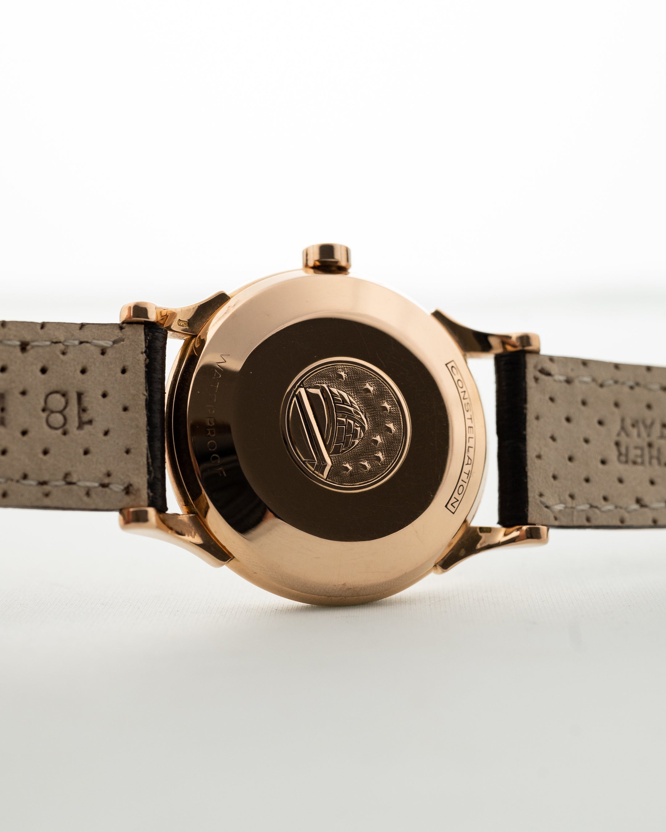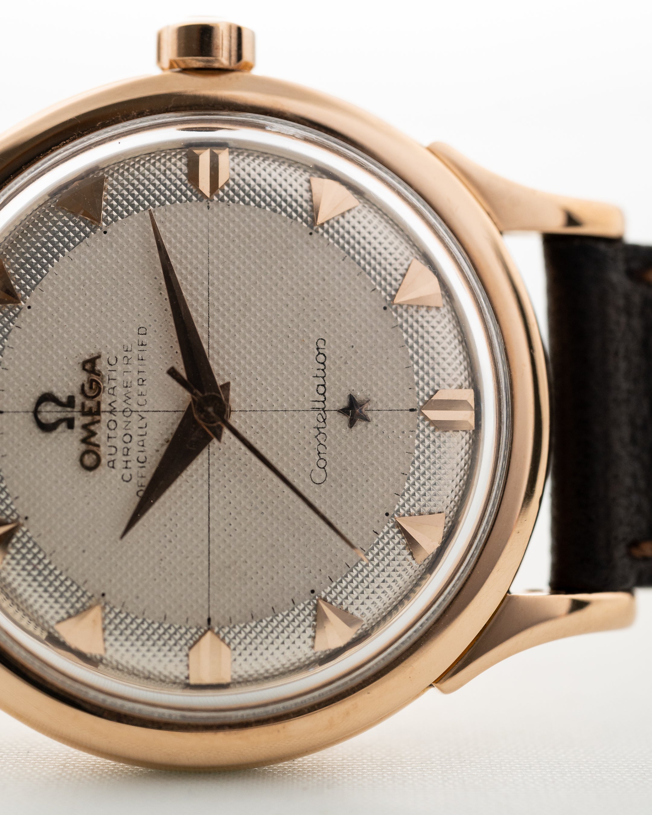 تحتوي ساعة أوميغا كونستيليشن الكرونومتر الأوتوماتيكية المدمجة والجميلة هذه على كل ما تريده في ساعة فستان: علبة من الذهب الوردي عيار 35 مم عيار 18 قيراطًا، وثوانٍ في المنتصف، وميناء نادر جدًا على شكل فطيرة عسلية وعلامات ساعات نادرة على شكل سهم.