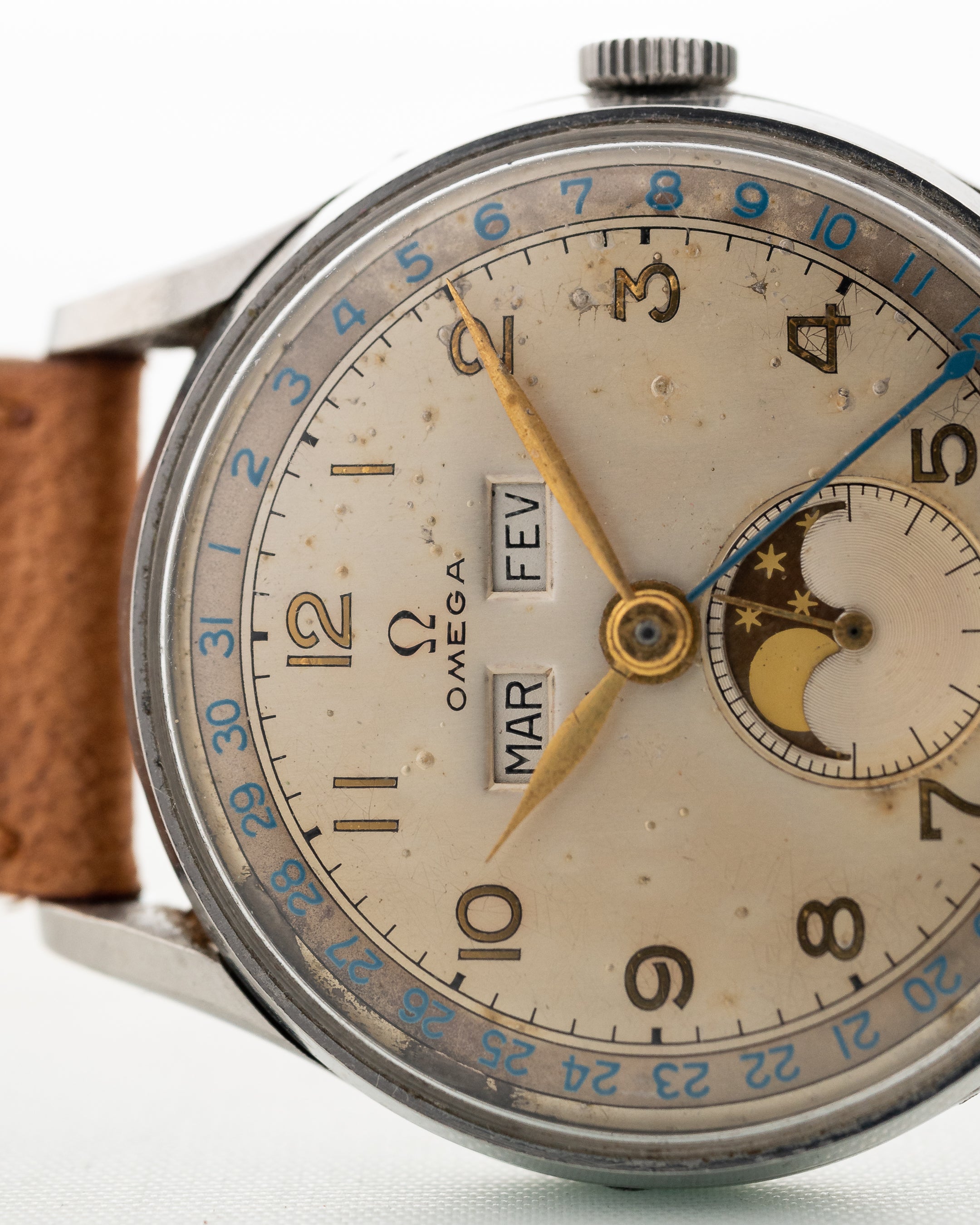 يحتوي المينا على نافذتي اليوم والشهر في النصف العلوي وطور القمر داخل قرص الثواني الفرعية الكبير في النصف السفلي. يتميّز الرف الخارجي على الميناء بحلقة فصل التاريخ الزرقاء اللافتة للنظر. العقارب الذهبية كلها في حالة رائعة وكذلك عقرب التاريخ المصنوع من الفولاذ الأزرق - إنها قطعة مميزة ورائعة المظهر.