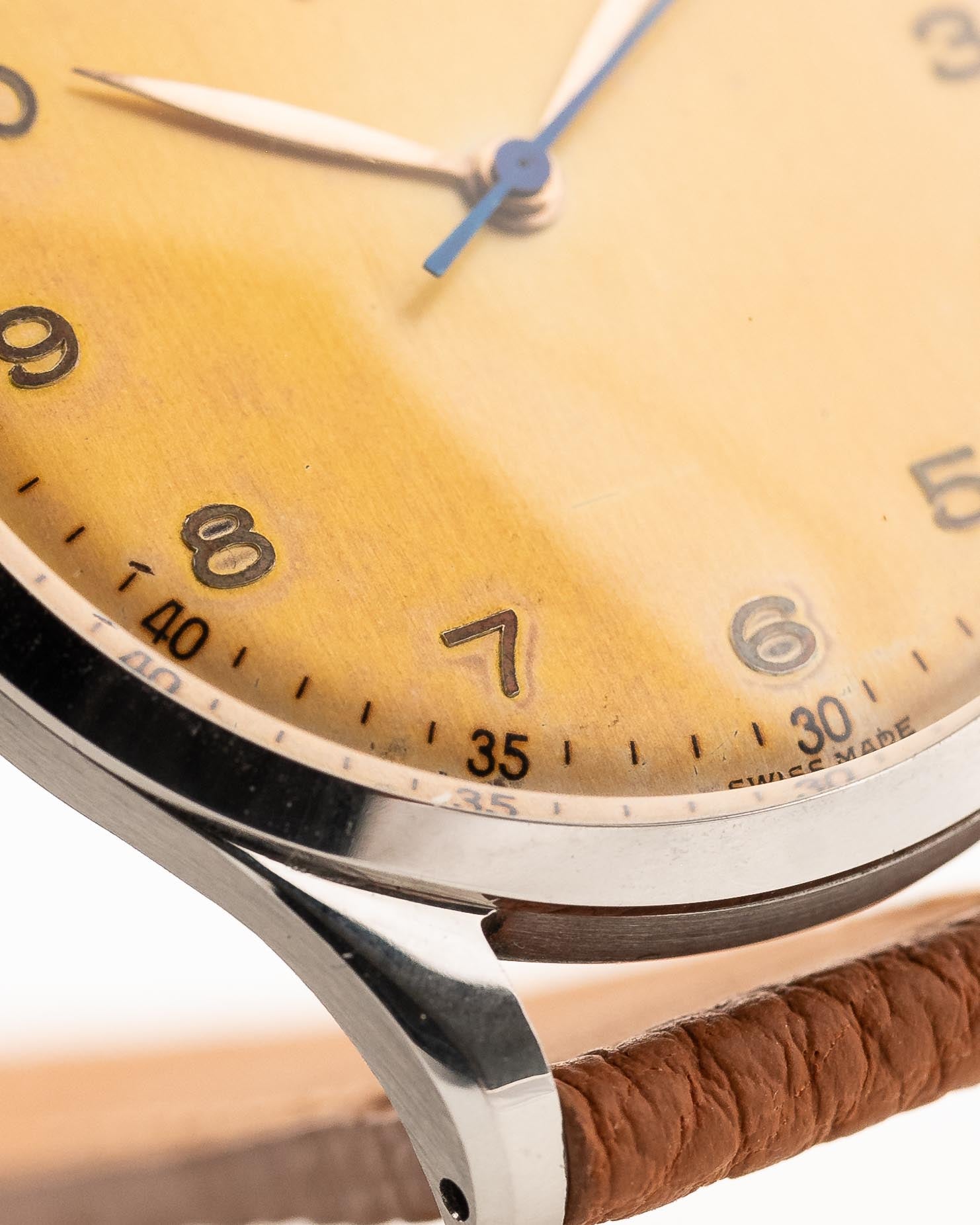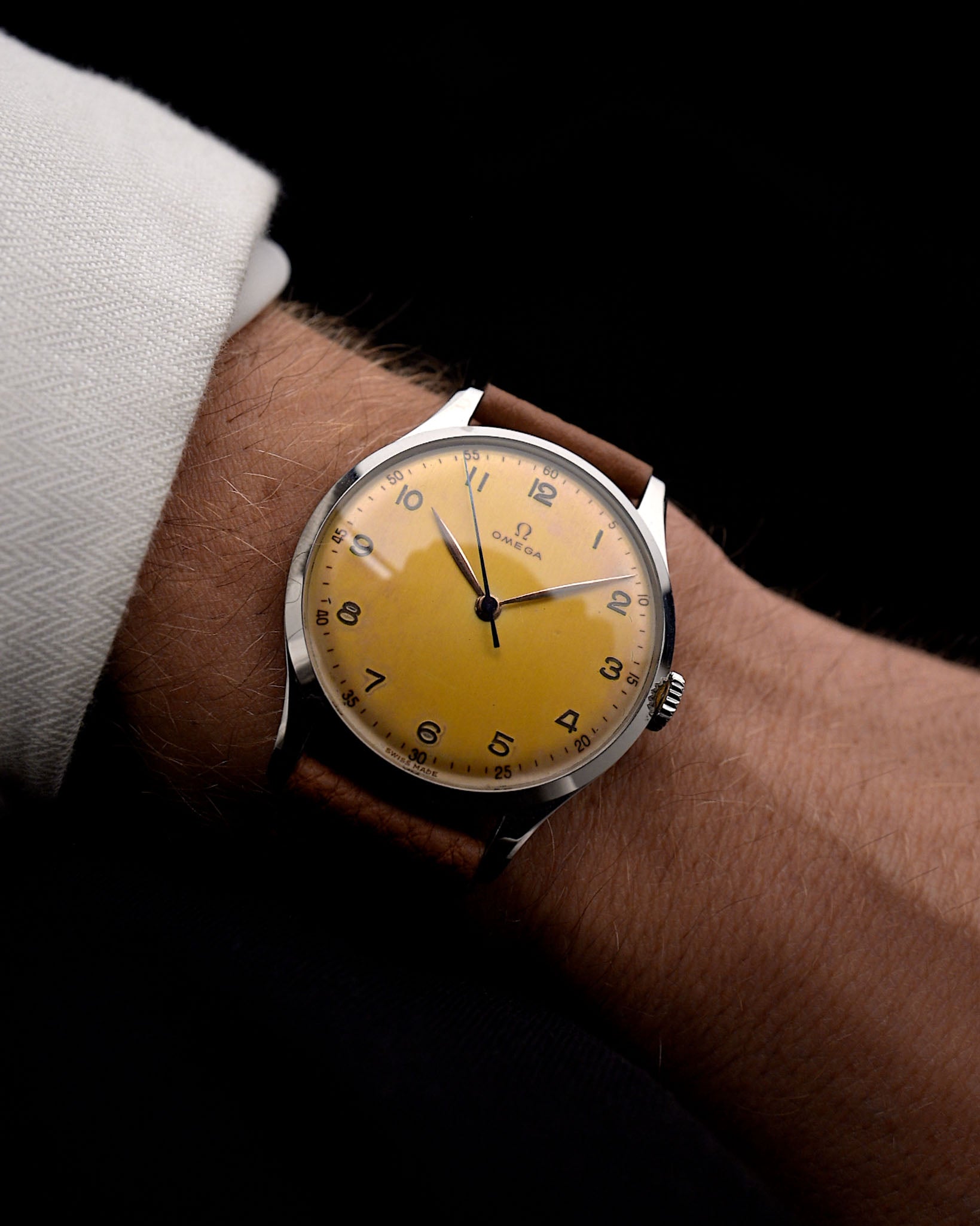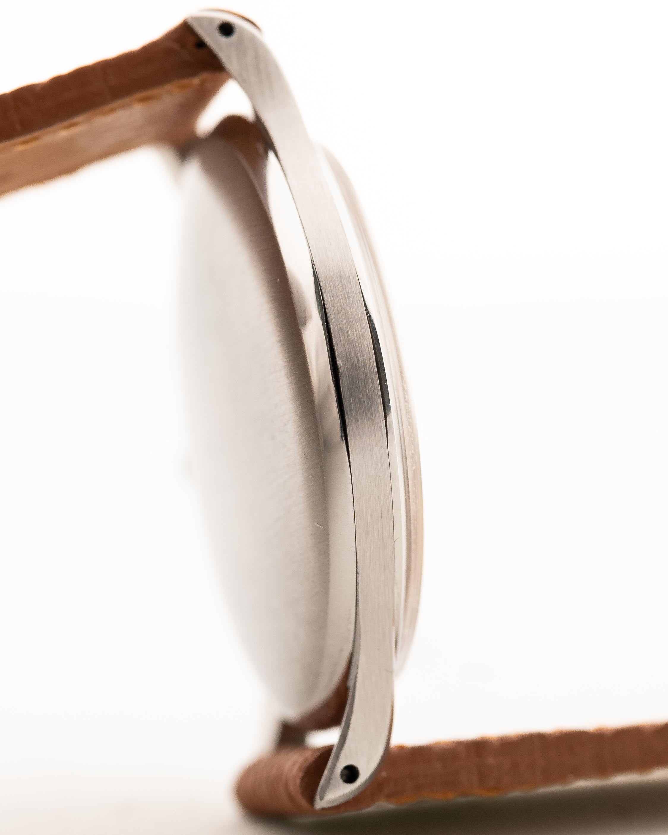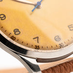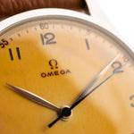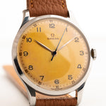 كانت فترة الأربعينيات من القرن الماضي فترة رائعة بالنسبة إلى أوميغا، كما يتجلى في هذه الساعة الجميلة. هذا المثال ليس فقط حسن المظهر، ولكنه جوهري أيضًا. فهي مزوّدة بعلبة ضخمة من الفولاذ المقاوم للصدأ بقطر 38 مم، وعروات مقلوبة لأسفل، وميناء رائع بلون عسلي لا يمكن أن تتفوق على هذه الساعة.