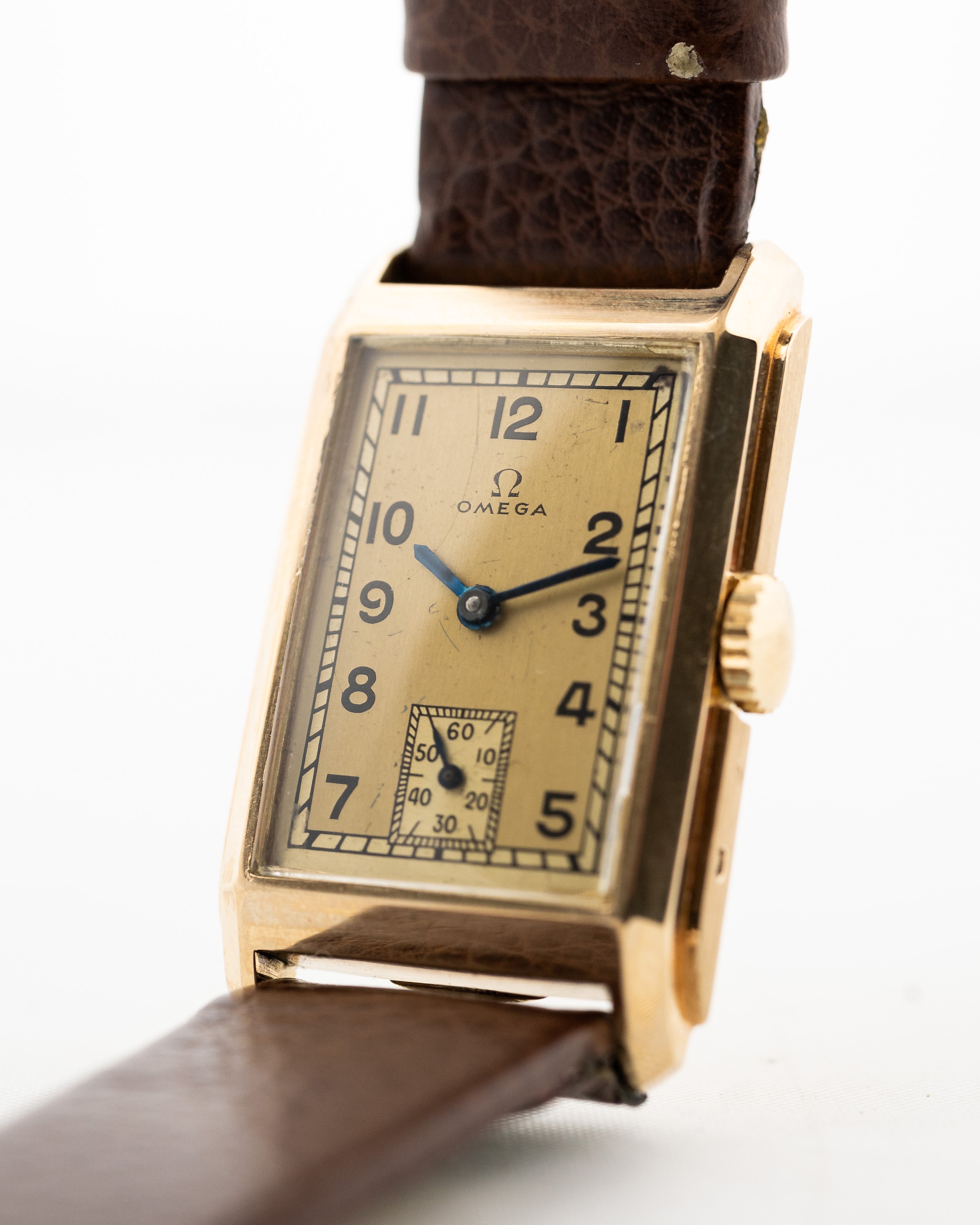 هذه ليست أول ساعة فستان من أوميغا آرت ديكو نقع في غرامها. ويتميز هذا المثال بعلبة ذهبية مستطيلة ضخمة من الذهب عيار 14 قيراطًا ويزداد جاذبيتها بسبب ميناها الرائع الملون قليلاً باللون الذهبي مع أرقام عربية على طراز آرت ديكو وثوانٍ فرعية وعقرب أزرق فريد رائع. وما يزيد من جاذبيتها هو حالتها المذهلة!