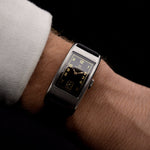 ويتميز مينا ساعة أوميغا هذه بتصميم مذهل باللون الأسود المذهب، وهو سمة مميزة للعصر ويضفي على الساعة مظهراً فاخراً ومتبايناً على الخلفية السوداء الداكنة.