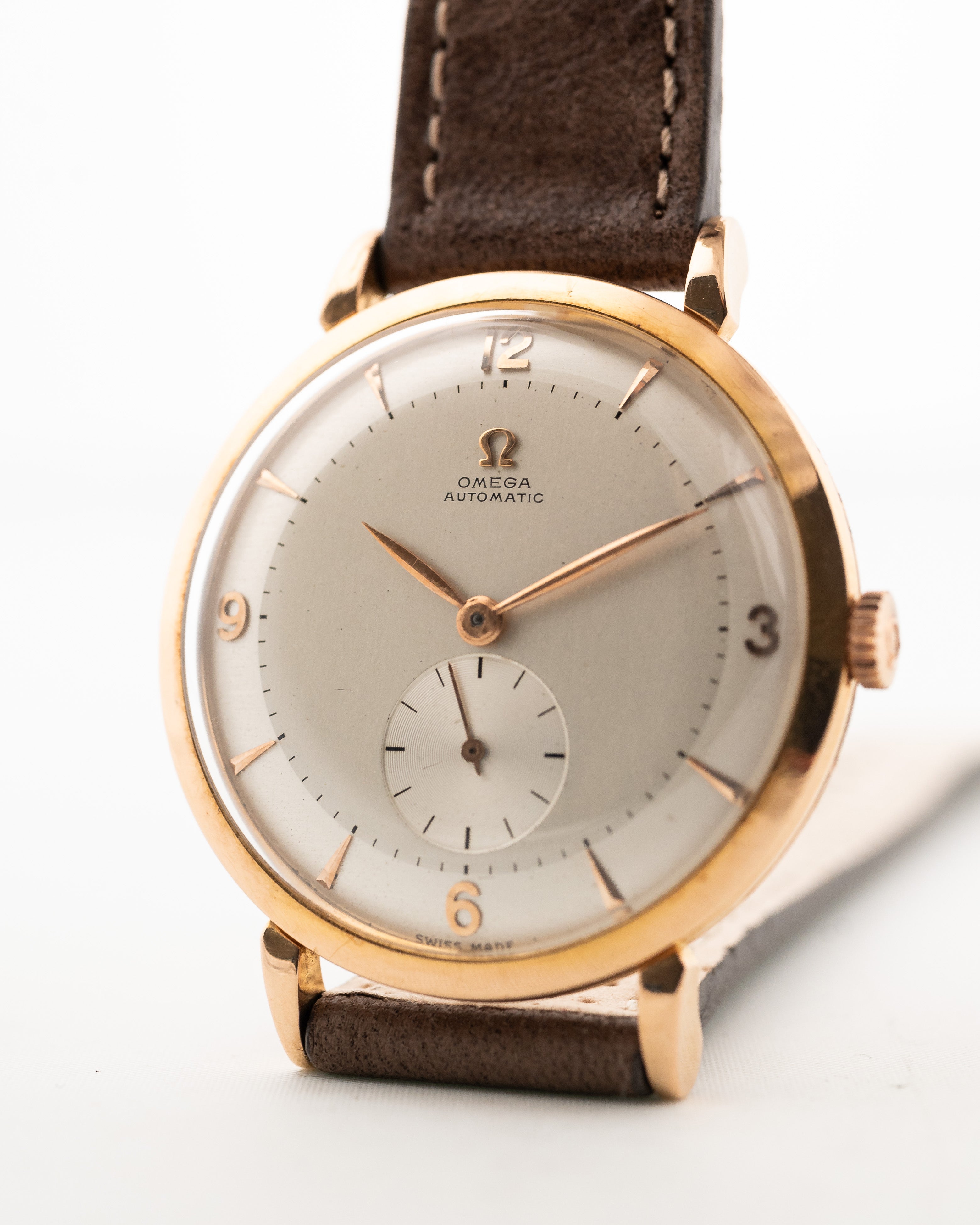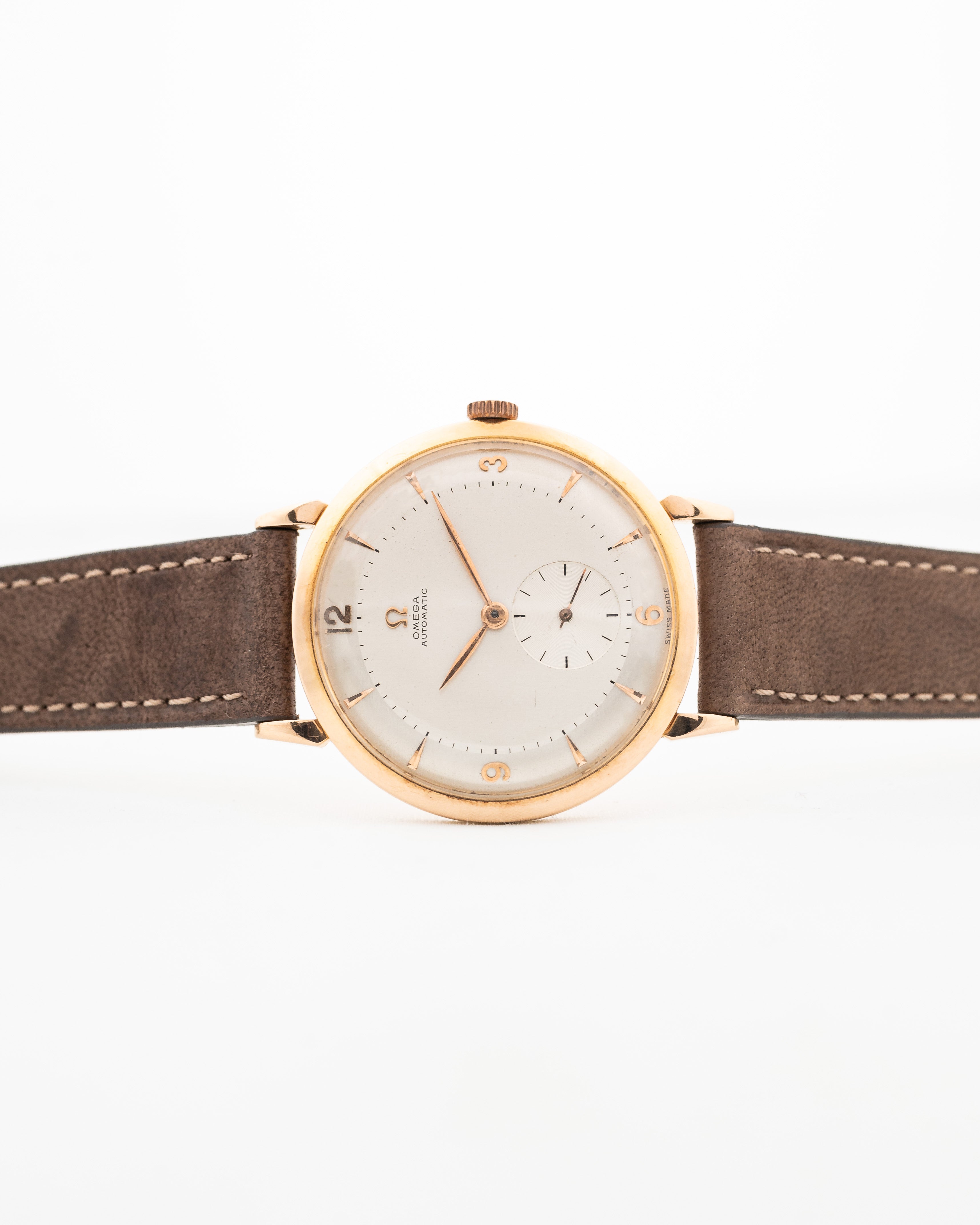 كانت فترة الخمسينيات من القرن الماضي فترة جيدة بالنسبة إلى أوميغا، كما يتجلى في هذه الساعة الجميلة. هذا المثال ليس فقط حسن المظهر، ولكنه كبير أيضًا. فهي مزوّدة بعلبة ضخمة من الذهب الوردي مقاس 37,5 مم، وعروات مقلوبة إلى الأسفل، وميناء رائع بلونين أبيض ورمادي خفيف ورائع، ولا يمكنك حقًا أن تتفوق على هذه الساعة.