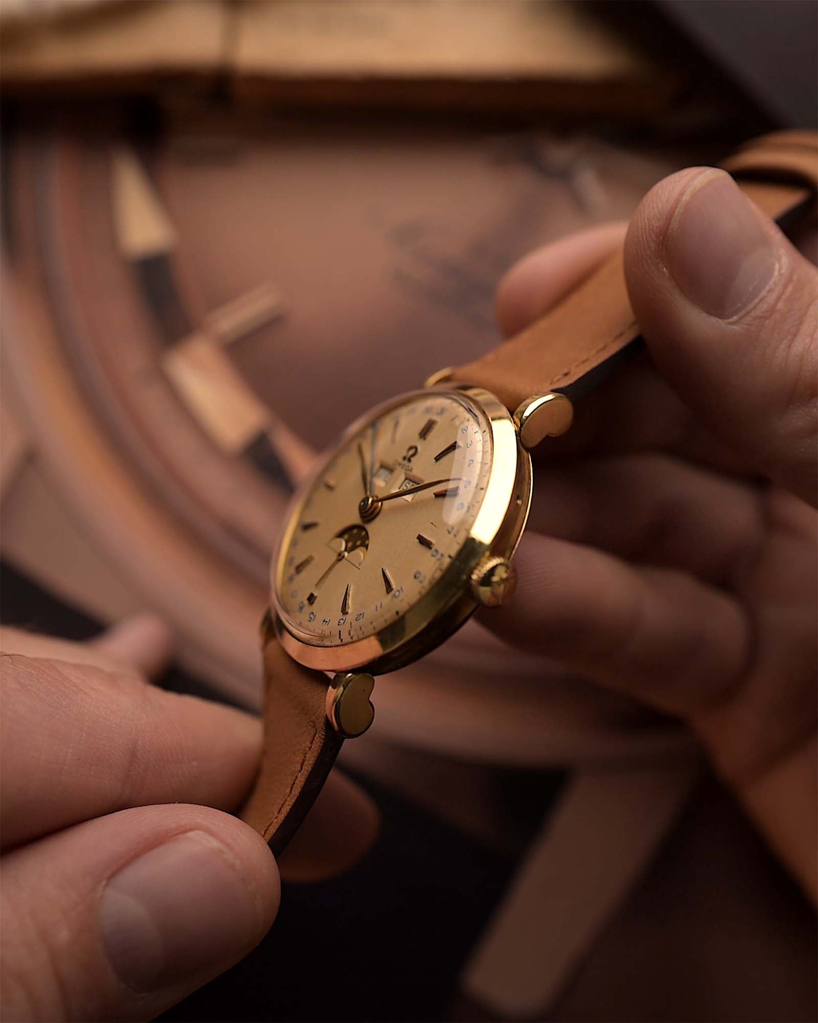 يعرض الميناء الأنيق نوافذ اليوم والشهر في الأعلى (عجلات باللغة الإسبانية)، وطور القمر داخل الثواني الفرعية عند الساعة السادسة، ومسار تاريخ أزرق نابض بالحياة يحيط بالتصميم. وتتمتع هذه القطعة بجاذبية لا يمكن إنكارها، إلى جانب العقارب الذهبية وعقرب التاريخ الأزرق، والزنجار الدافئ الذي يكسو الوقت.