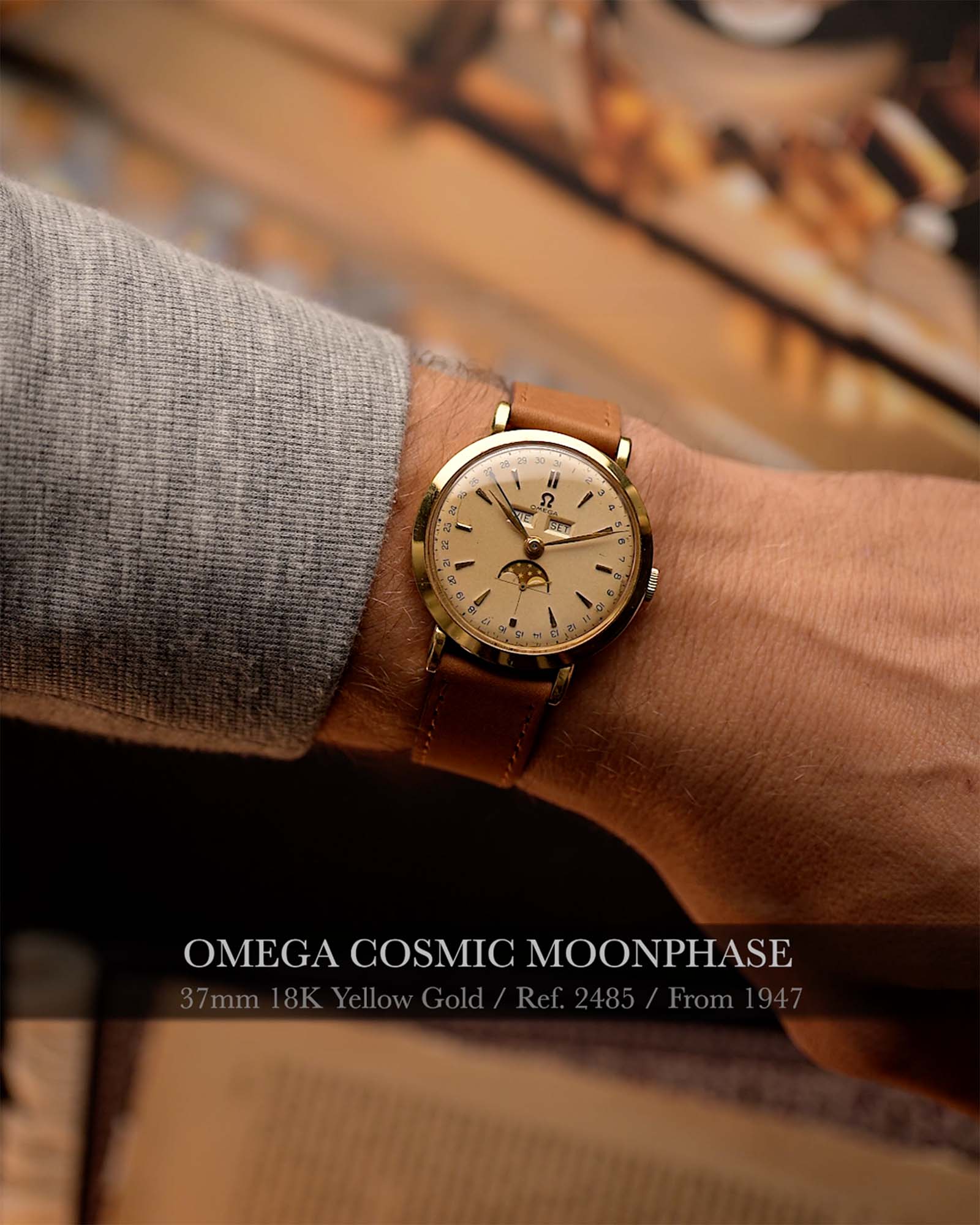 طُرحت ساعة أوميغا كوزميك في عام 1947 باعتبارها أرقى موديل في كتالوج أوميغا لما بعد الحرب - وتُظهر هذه الساعة المرجعية المبكرة 2485 السبب في ذلك. تأتي الساعة في علبة نادرة من الذهب الأصفر عيار 37 مم عيار 18 قيراطًا، وتتميز بتقويم كامل مع تعقيدات طور القمر، وتعمل بالعيار 381 الموقر الذي يستند إلى عيار ليمانيا إيبوش.