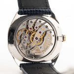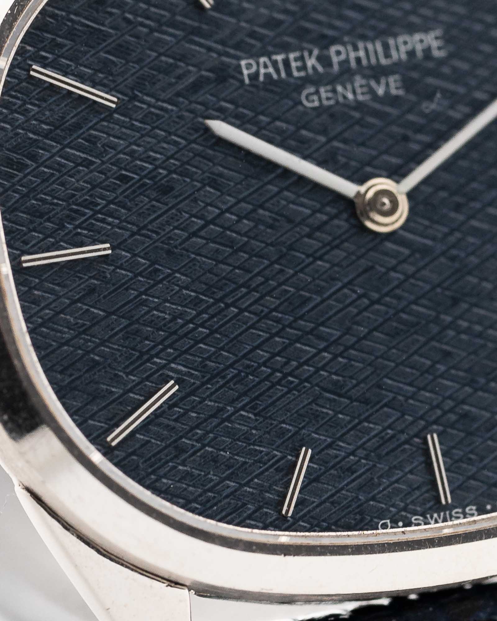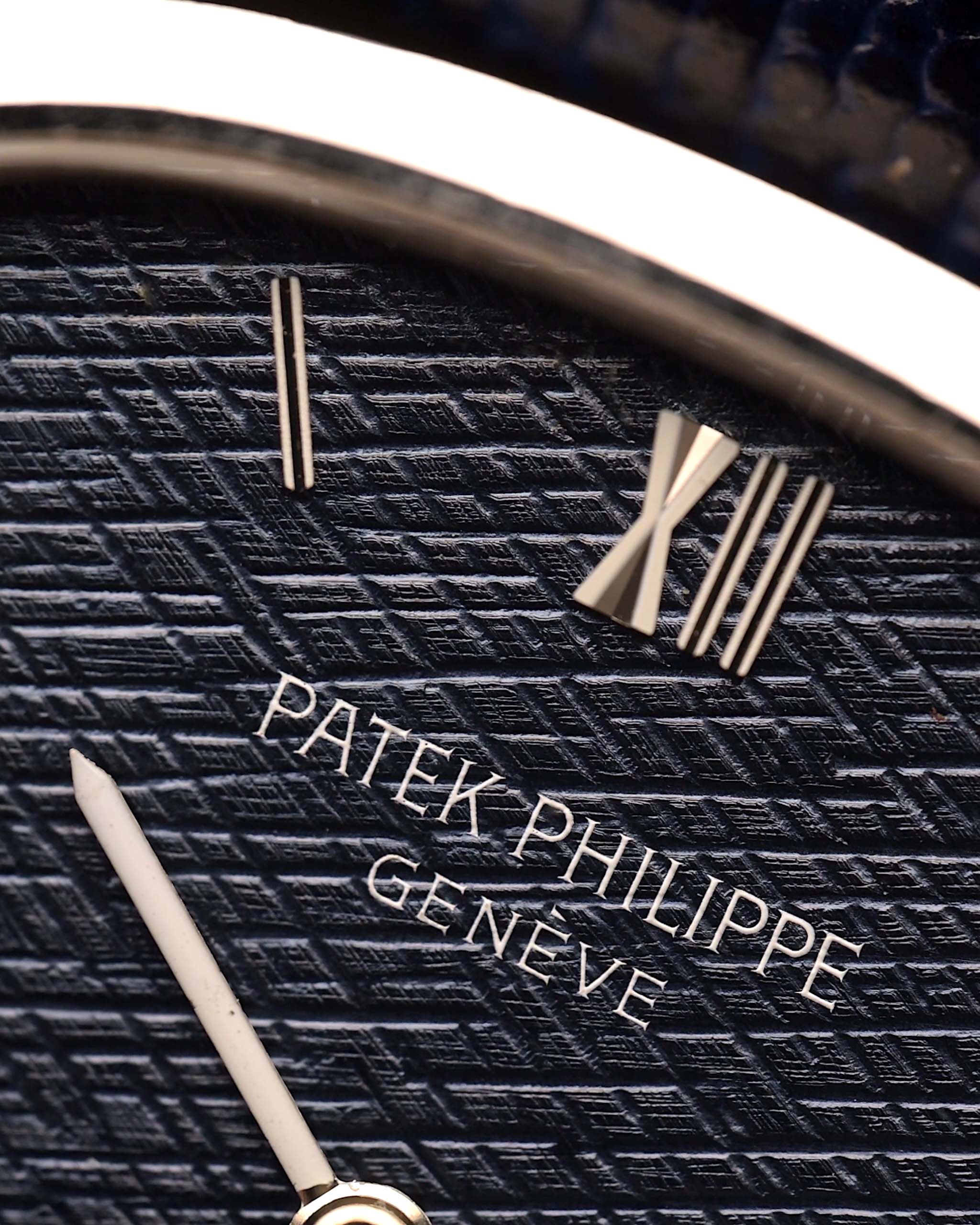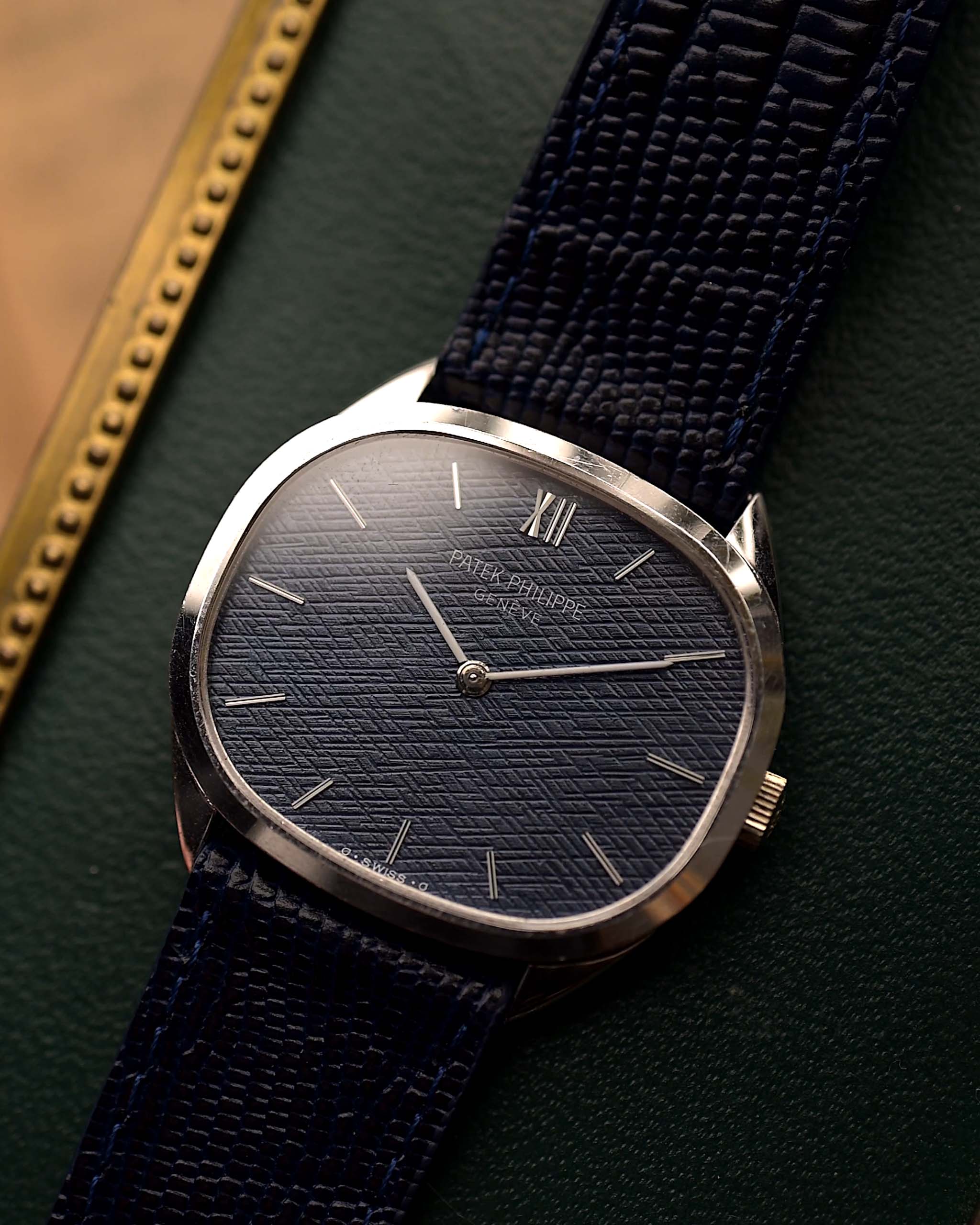 تتميز ساعة Patek Philippe Ellipse بتوازنها المثالي بين الشكل الدائري والمستطيل، وقد اشتهرت منذ فترة طويلة بكونها نموذجاً مثالياً في التناسب. وتجسد هذه الساعة من طراز Ref. 3545 التي تعود إلى سبعينيات القرن الماضي الأناقة المعمارية لهذا الطراز، بفضل هيكلها المتناغم المصنوع من الذهب الأبيض عيار 18 قيراط وميناها الأزرق المذهل المزخرف بنقش سيغما الذي يشع بريقاً خفيفاً.